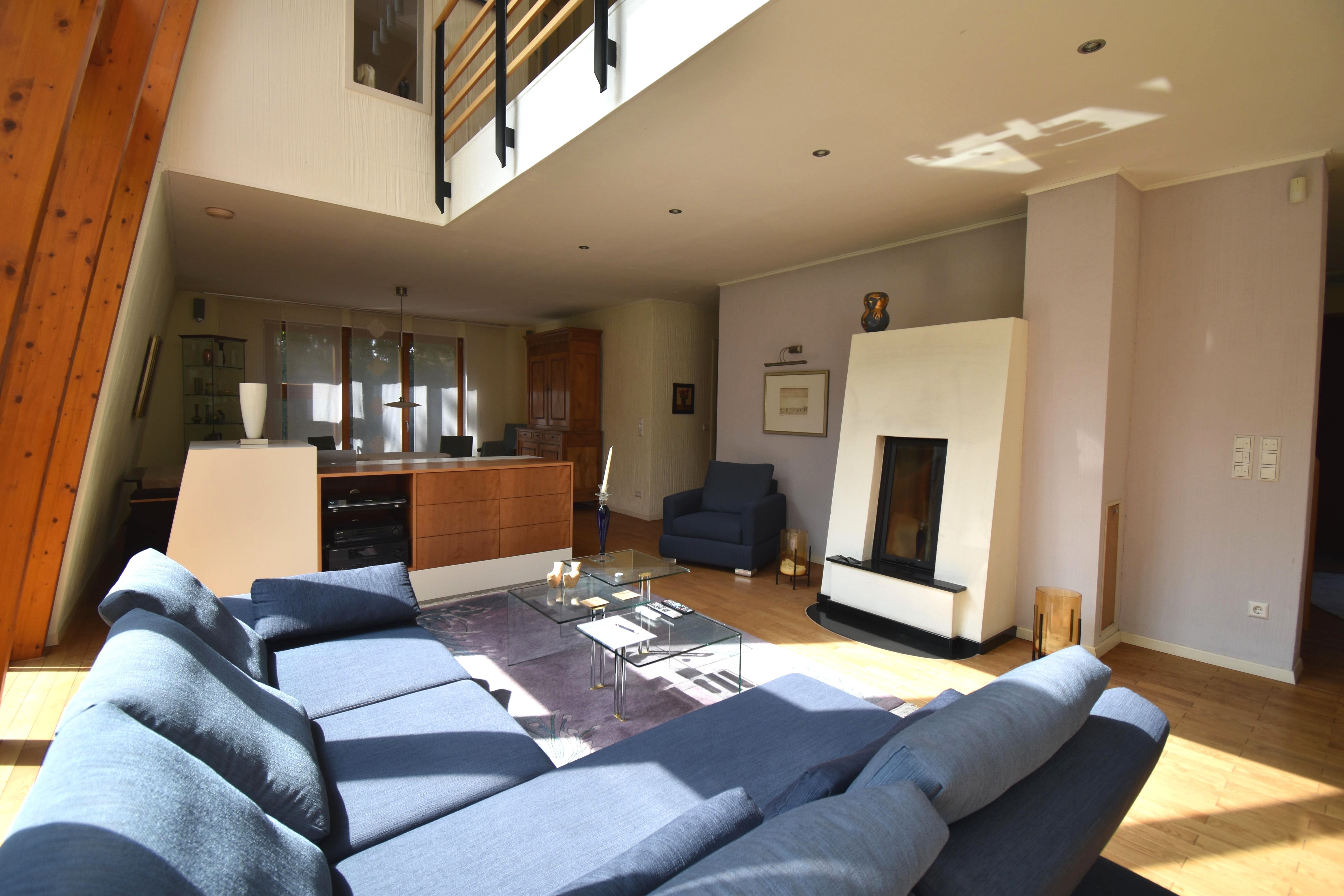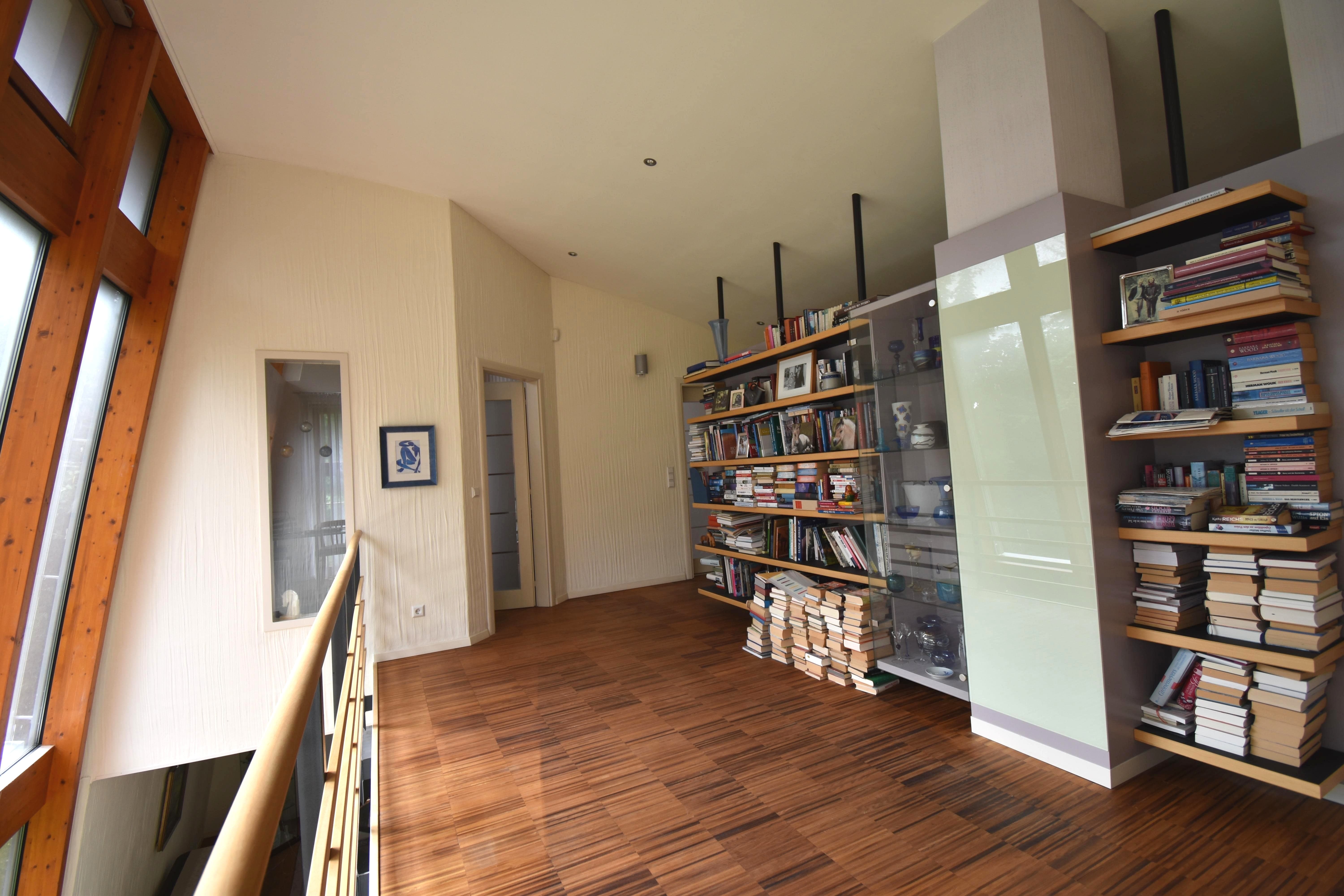 Das Obergeschoss ist über eine hochwertige Treppe aus Buchenholz zu erreichen und wird über die Galerie ebenfalls mit viel natürlichem Tageslicht versorgt. Diese Etage verfügt über ein Elternschlafzimmer mit Ankleideraum, ein zweites Schlafzimmer / Büro und das Hauptbad mit Dusche, Wanne, Doppelwaschbecken, WC und einer Sauna. Ein weiterer Abstellraum rundet das Platzangebot ab.