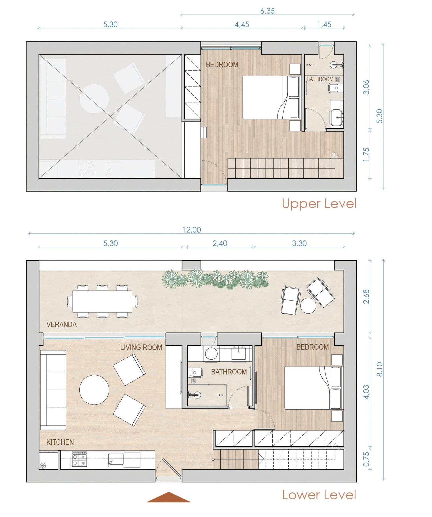 Die untere Ebene (1. OG) bildet das Zentrum: offener Wohn-/Essbereich mit integrierter Küche, direkter Balkonzugang, ein Schlafzimmer sowie ein Badezimmer mit Dusche und Fenster.