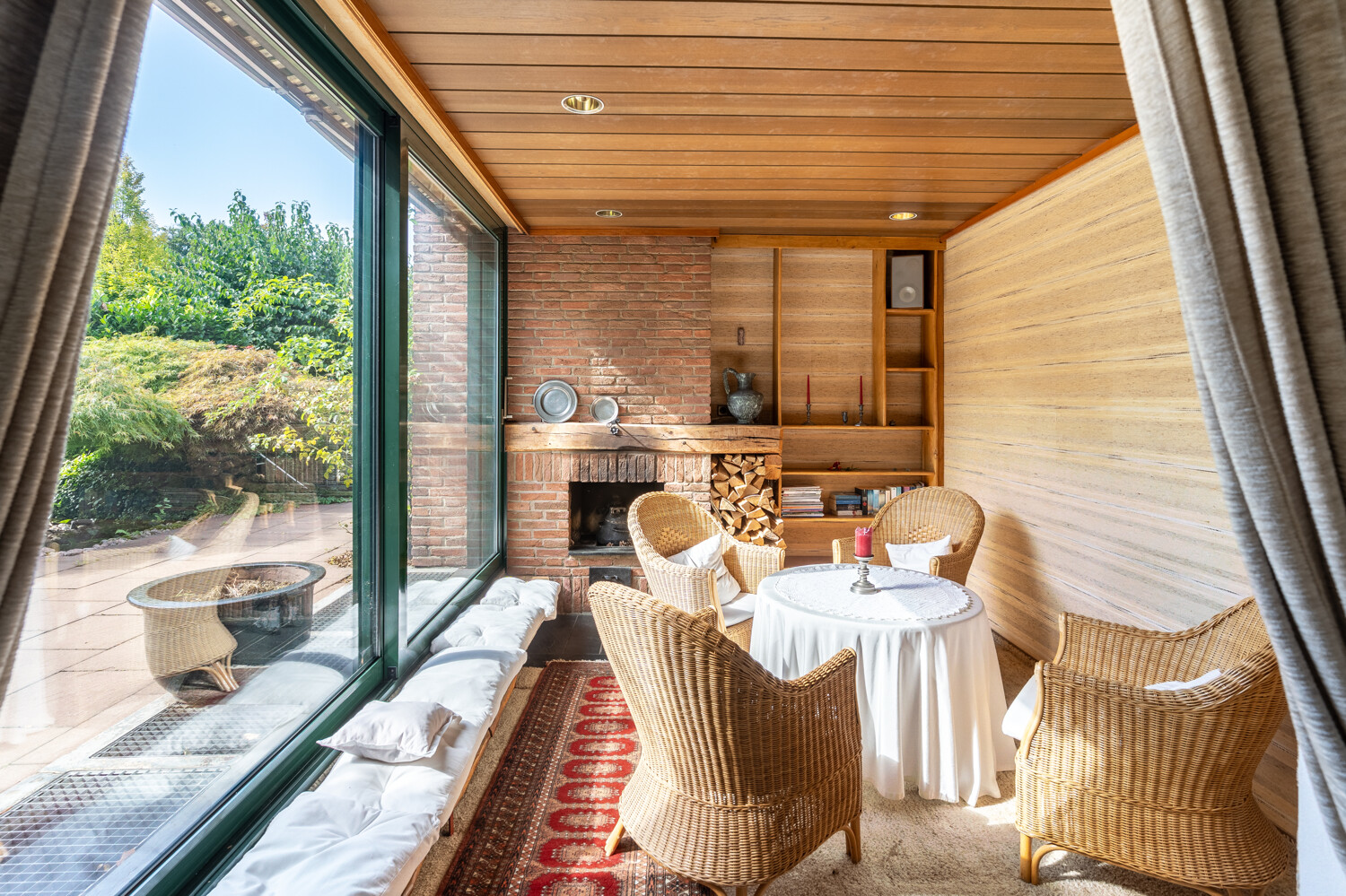 Der Wohn-/Essbereich ist sehr geräumig und durch die großen, bodentiefen Fensterfronten einladend hell. Angrenzend und offen integriert ist das gemütliche Kaminzimmer- entspannen Sie hier an kalten Tagen vor dem Kamin mit Blick in den Garten. Diesen betreten Sie durch die große Schiebetür vom Wohnbereich aus. Die Terrasse und der Garten sind süd-westlich ausgerichtet, eingefriedet von alten Rosen- und Blumenbeständen. Genießen Sie die blumige und private Atmosphäre auch auf der teilüberdachten Terrasse vor dem Außenkamin.
