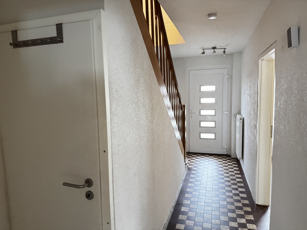 Der Eingangsbereich führt, vorbei am Treppenhaus, in den Flur, der links zum Wohnzimmer und geradeaus zur Küche führt. Der Küche ist direkt das Esszimmer angeschlossen und auch der Zugang zum Balkon. Bei Bedarf könnte das Esszimmer direkt mit dem Wohnzimmer verbunden werden. Der aktuell zwischen den beiden Zimmern vorhandene Abstellraum ließe sich ggf. zu einem Gäste-WC ausbauen.