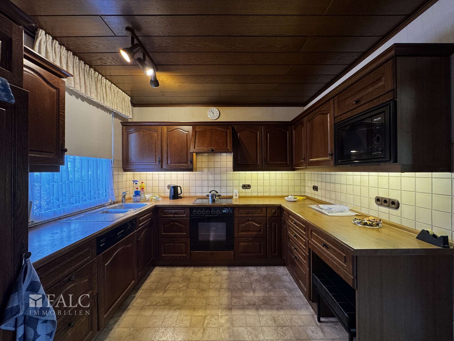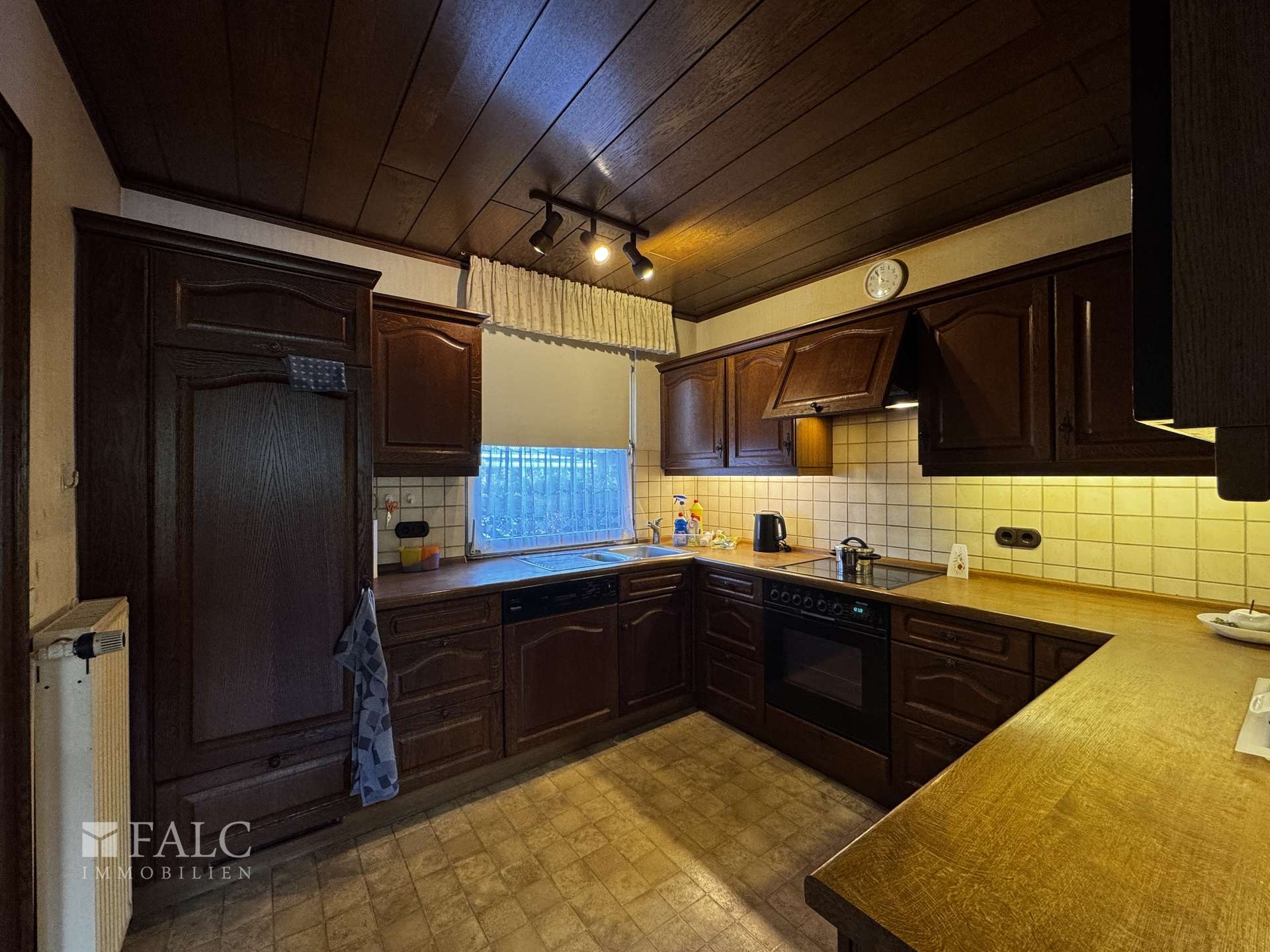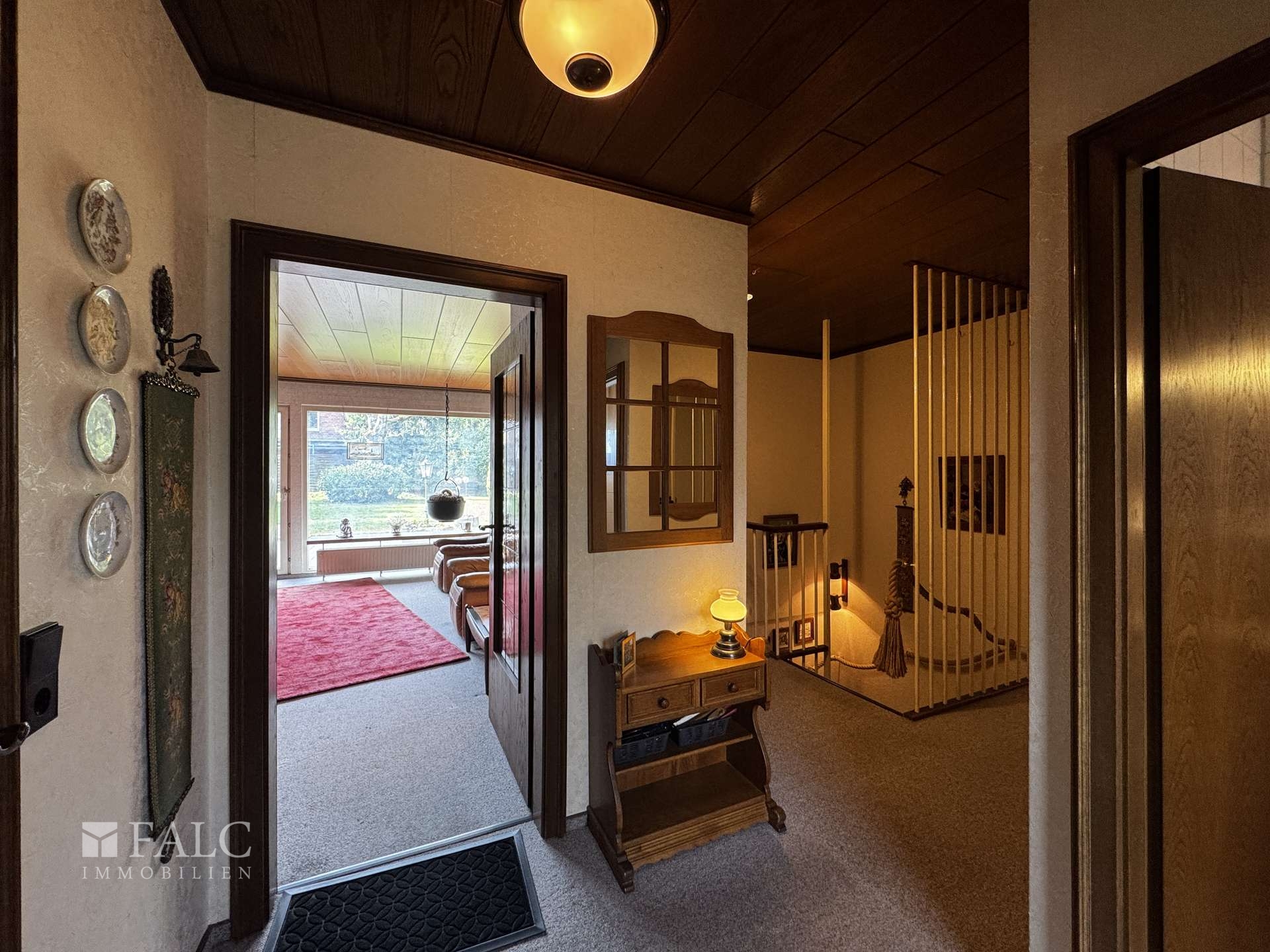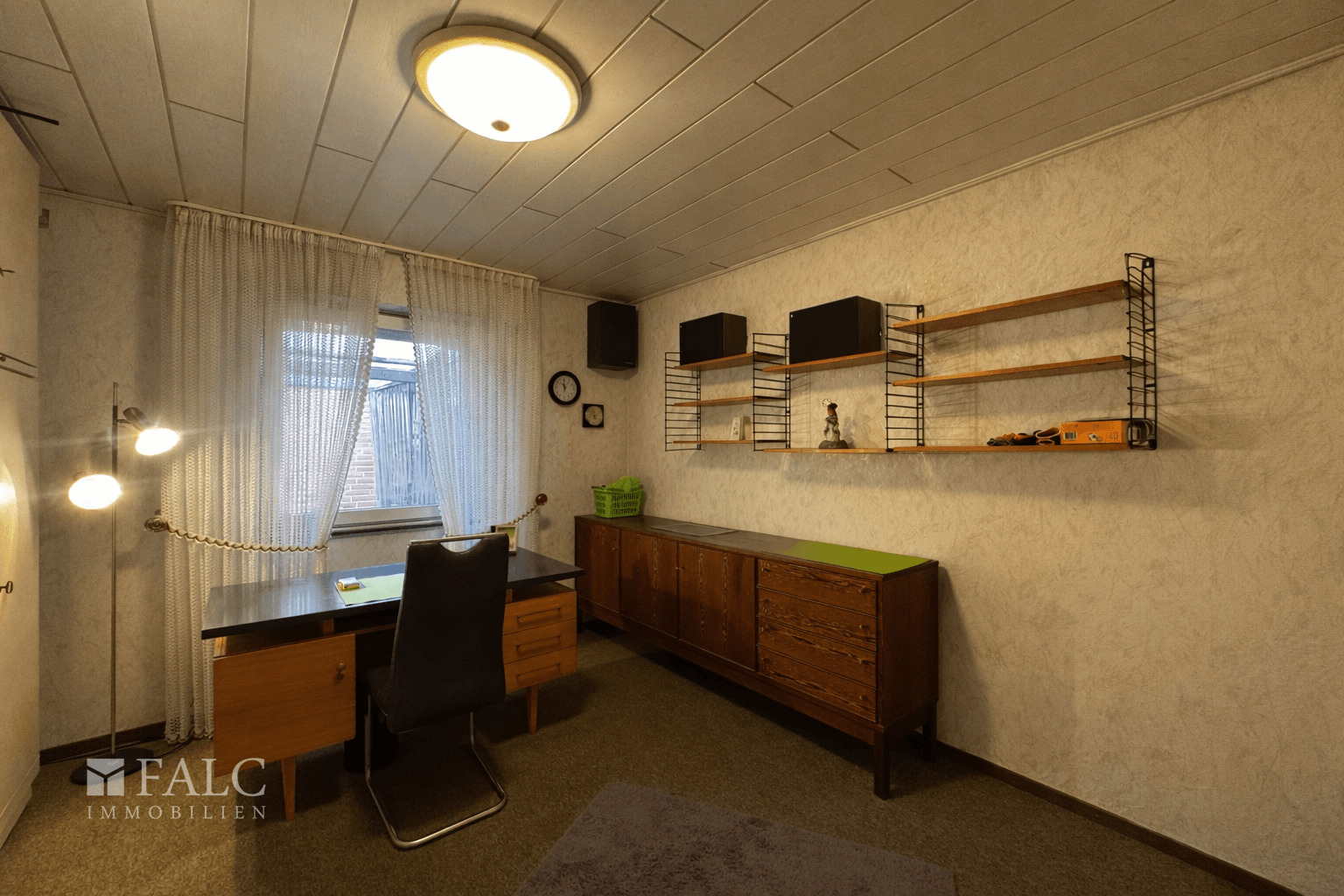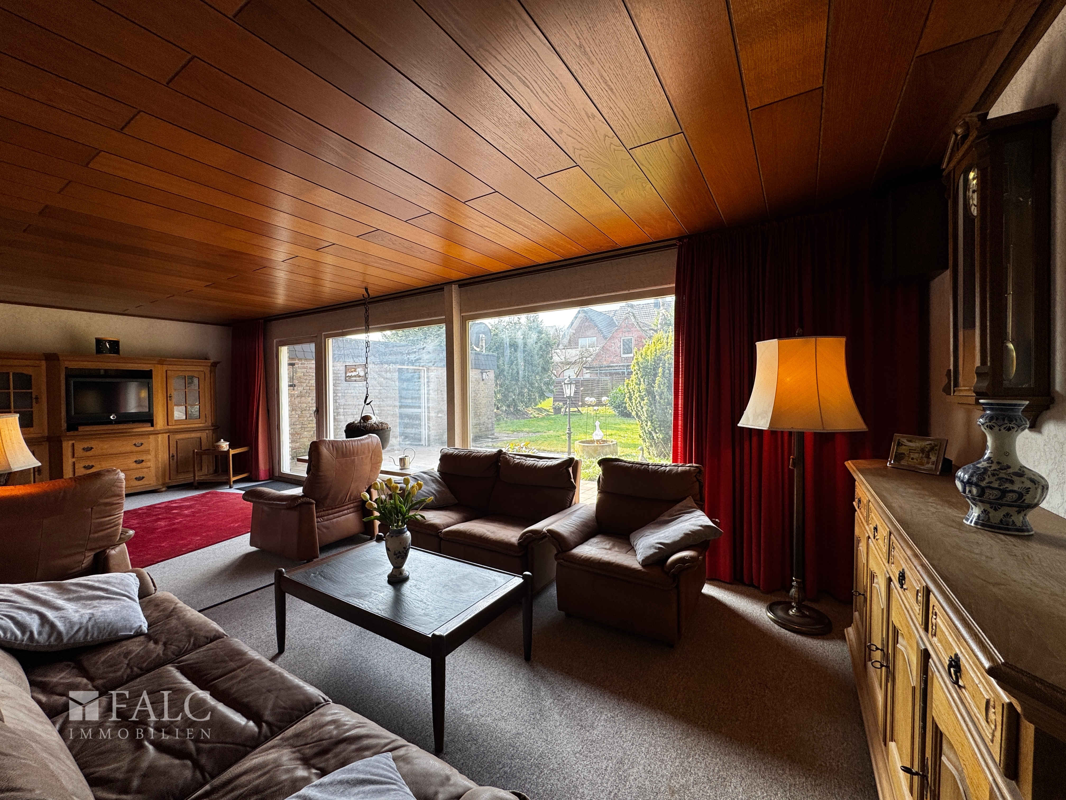 • Bungalow, Baujahr 1971 • Einladender Eingangsbereich • Gäste-WC mit Fenster • Küche mit dunkler Holzeinbauküche • Holzvertäfelte Decke in der Küche • Heller Fliesenboden in der Küche • Flur mit Zugang zum Keller • Badezimmer mit Dusche, weißen Fliesen und Fenster • Büro, auch als Schlafraum nutzbar • Schlafzimmer mit Holzlaminat • Direkter Zugang vom Schlafzimmer zur Terrasse • Großzügiger Wohn- und Essbereich • Holzvertäfelte Decke im Wohn- und Essbereich • Große Panoramafensterfront mit Blick in den Garten • Direkter Zugang vom Wohnbereich zur Terrasse • Überwiegend Teppichboden im Erdgeschoss • Zugang zum Dachboden über das Erdgeschoss • Großzügig nutzbarer Dachboden als zusätzliche Abstellfläche