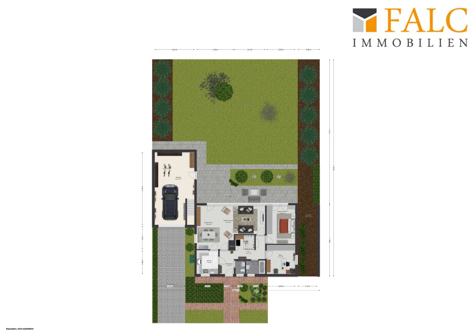 Das 737m² große Grundstück besticht durch einen großen, grünen Garten, der viel Raum zur Erholung, für Freizeitaktivitäten oder zur individuellen Gartengestaltung bietet.