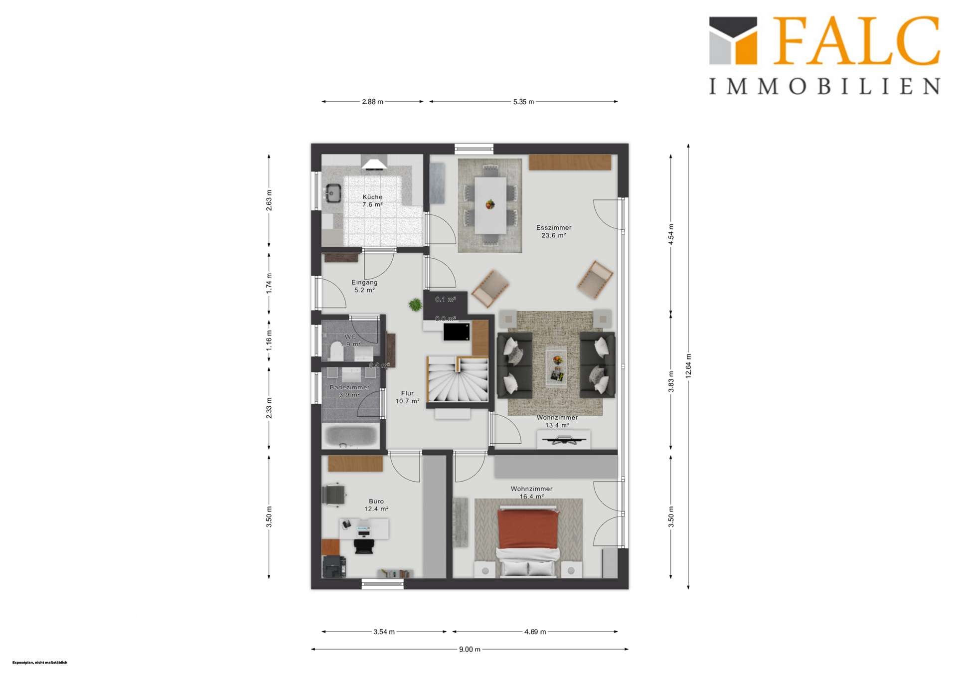 Die Küche bietet ausreichend Platz und liegt in direkter Nähe zum großzügigen Wohn- und Essbereich. Dieser bildet das Herzstück des Hauses und überzeugt durch seine Gestaltung, die zahlreiche Möglichkeiten zur individuellen Einrichtung bietet. Eine große Fensterfront sorgt für viel Tageslicht und schafft eine helle, freundliche Wohnatmosphäre. Vom Wohn- und Essbereich aus gelangen Sie direkt auf die Terrasse und in den Garten.