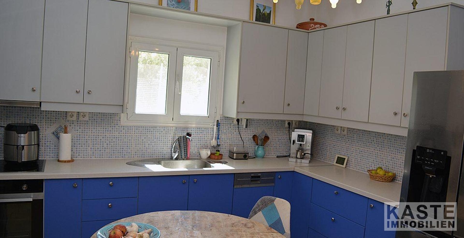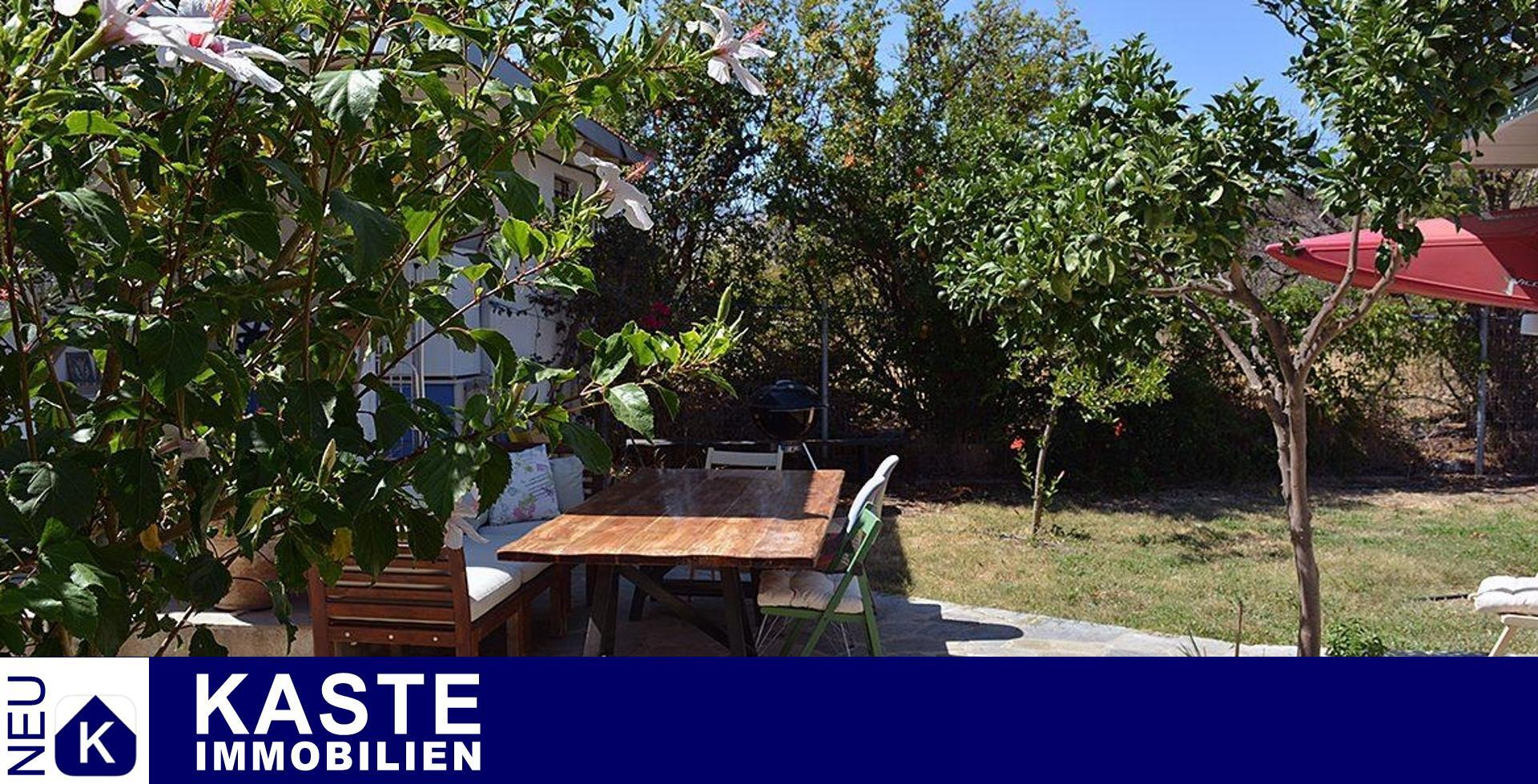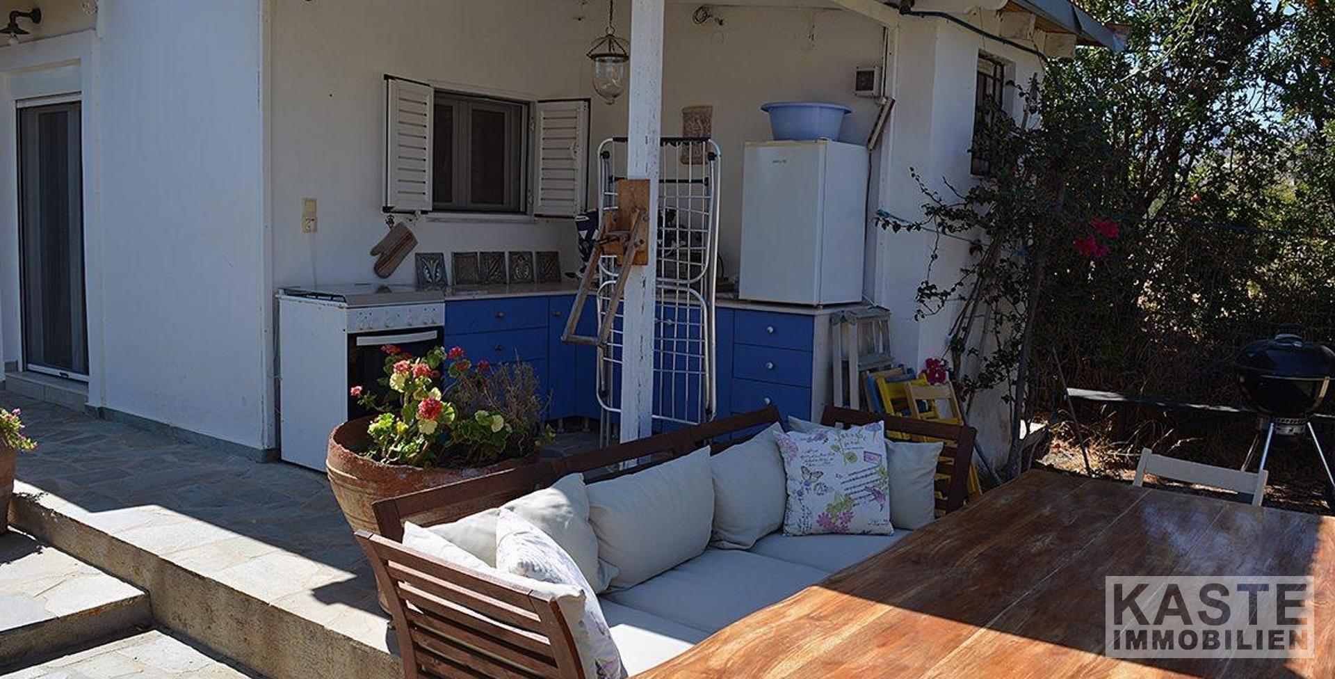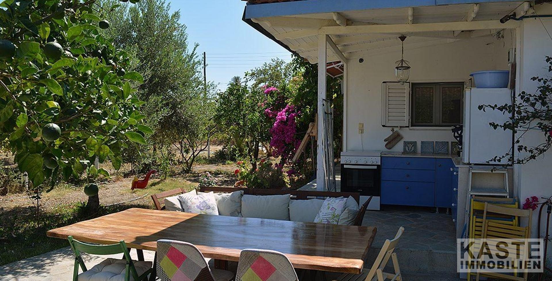 Ein besonderes Highlight dieses Anwesens ist der großzügige Außenbereich. Die schattige Terrasse bietet ausreichend Platz für einen Esstisch und Stühle sowie gemütliche Sitzgelegenheiten, um das warme Klima in vollen Zügen zu genießen. Die Außenküche ergänzt den Lebensraum im Freien perfekt und lädt dazu ein, Mahlzeiten unter freiem Himmel zu genießen. Der große, gepflegte Garten ist reich an Obstbäumen, Blumen und Pflanzen und erstreckt sich über das gesamte Grundstück.
