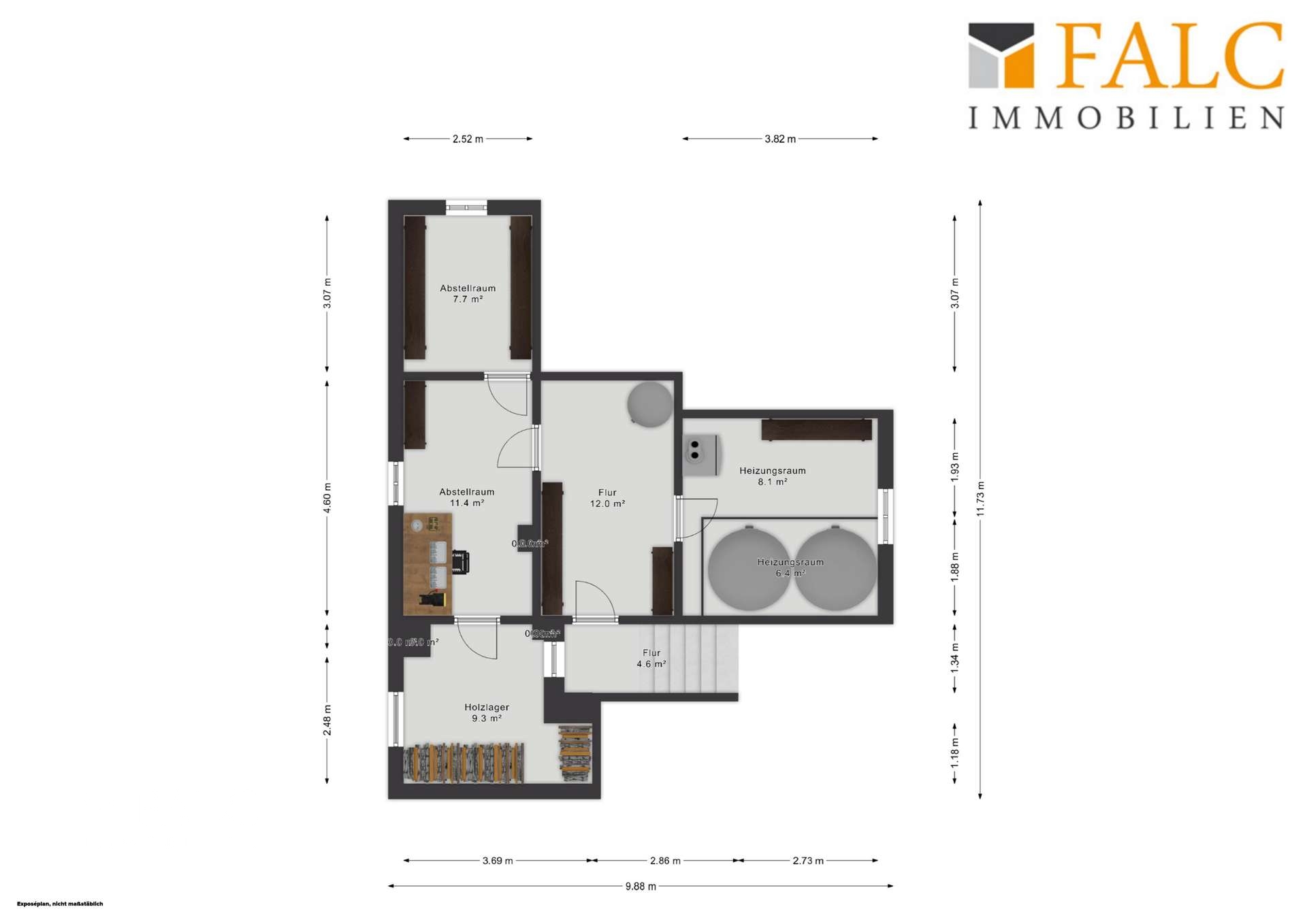 Kellergeschoss: - Zugang zum Keller vom Wintergarten aus - zwei Kellerräume als Abstellfläche - separates Holzlager im Keller (Befüllung von außen möglich) - Öl-Zentralheizung mit Öltanks im Keller - zusätzliche Holzheizung (nicht für Warmwasseraufbereitung)