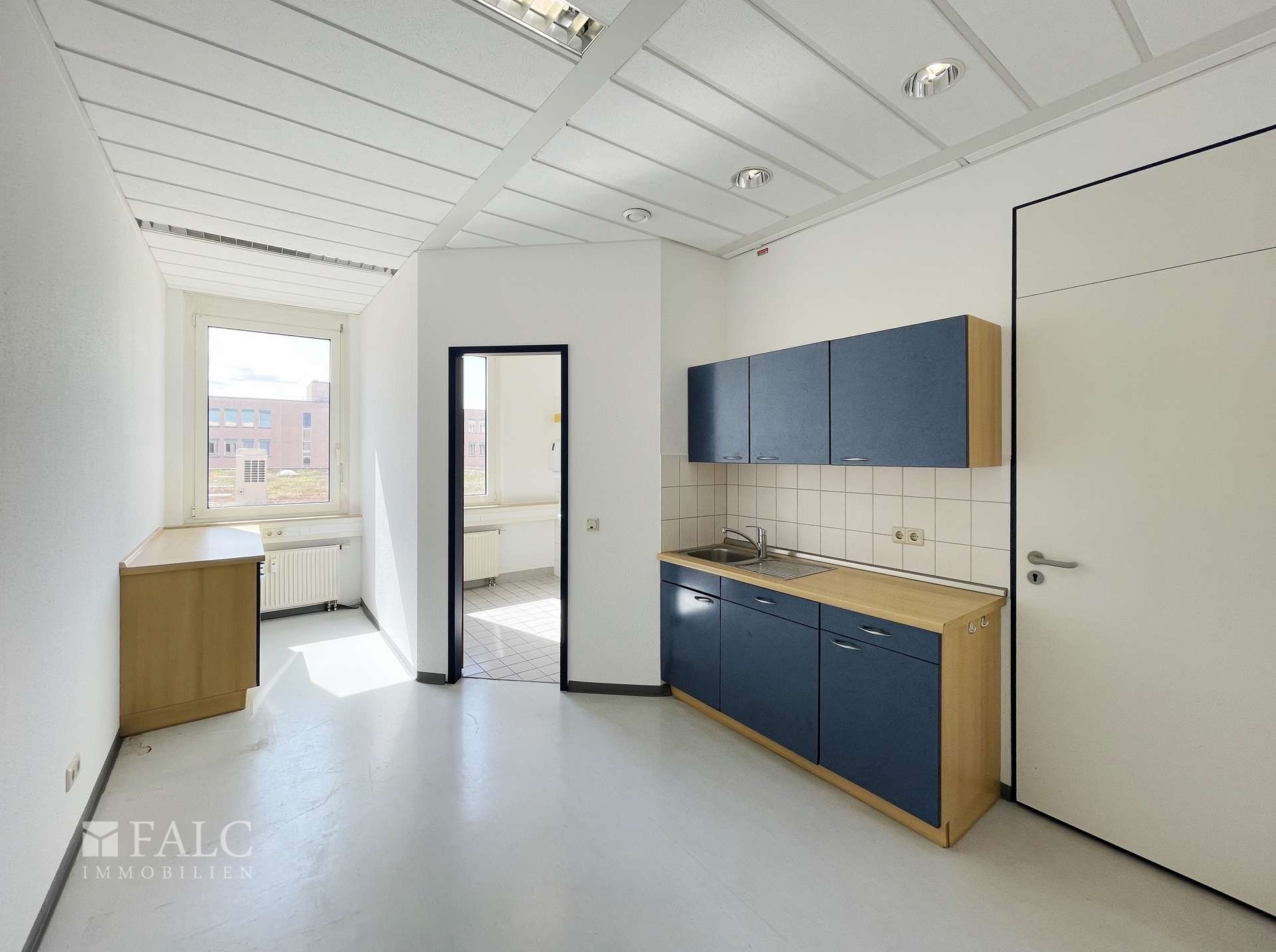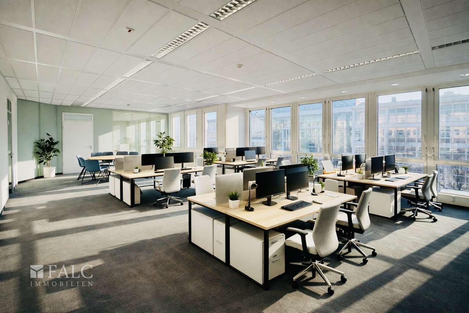 Die Beleuchtung erfolgt über moderne Bürolampen, die für eine optimale Ausleuchtung sorgen. Die Fenster sind doppelt verglast, sodass eine ruhige Arbeitsumgebung gewährleistet ist.