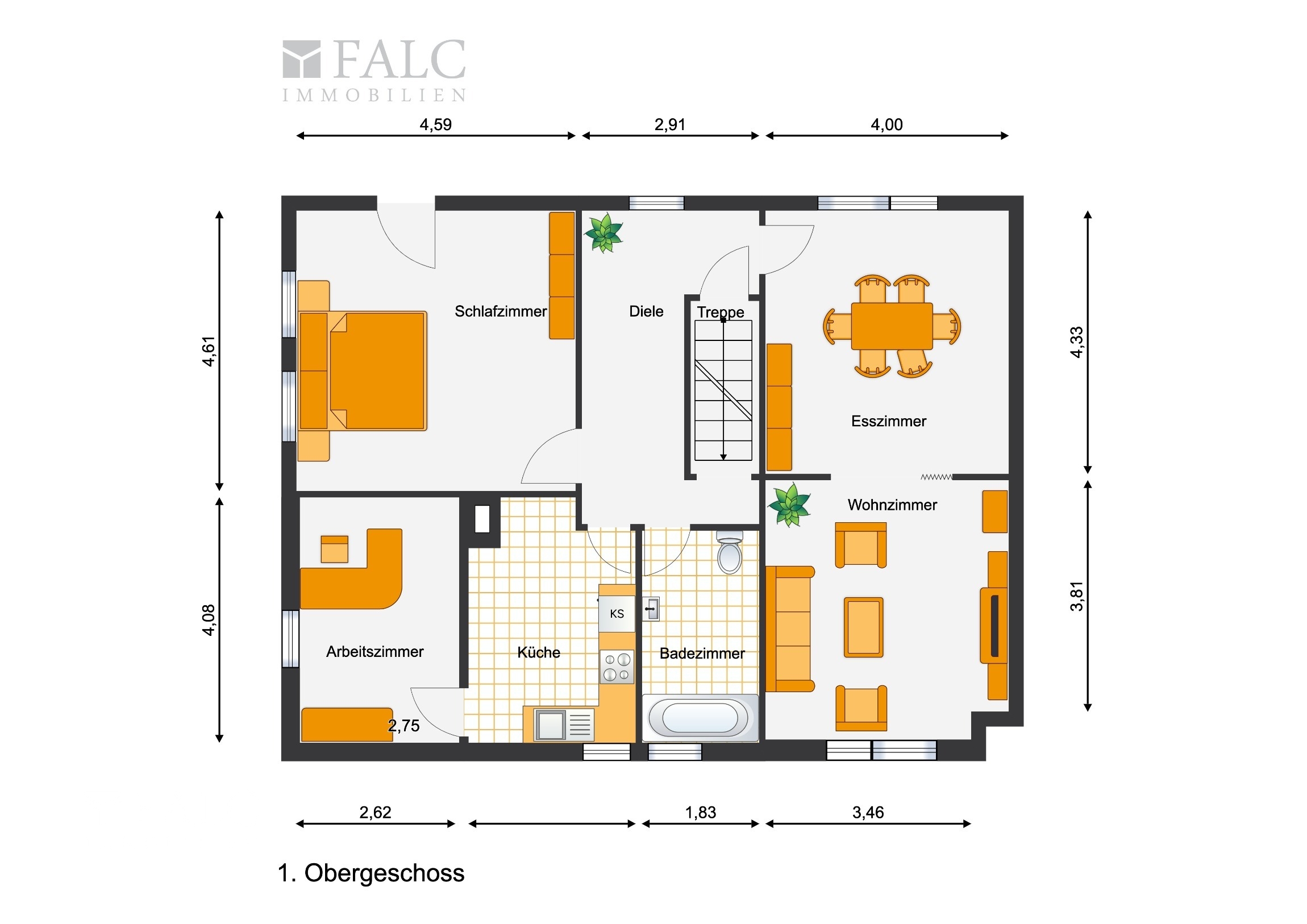 Über eine Treppe gelangt man in das Obergeschoss, das ein weiteres Schlafzimmer, ein Büro, ein geräumiges Wohn/ Esszimmer, sowie ein weiteres Badezimmer bietet. Im Dachgeschoss sind eine große Diele, 2 geräumige Zimmer und weitere Möglichkeiten zum Ausbau.