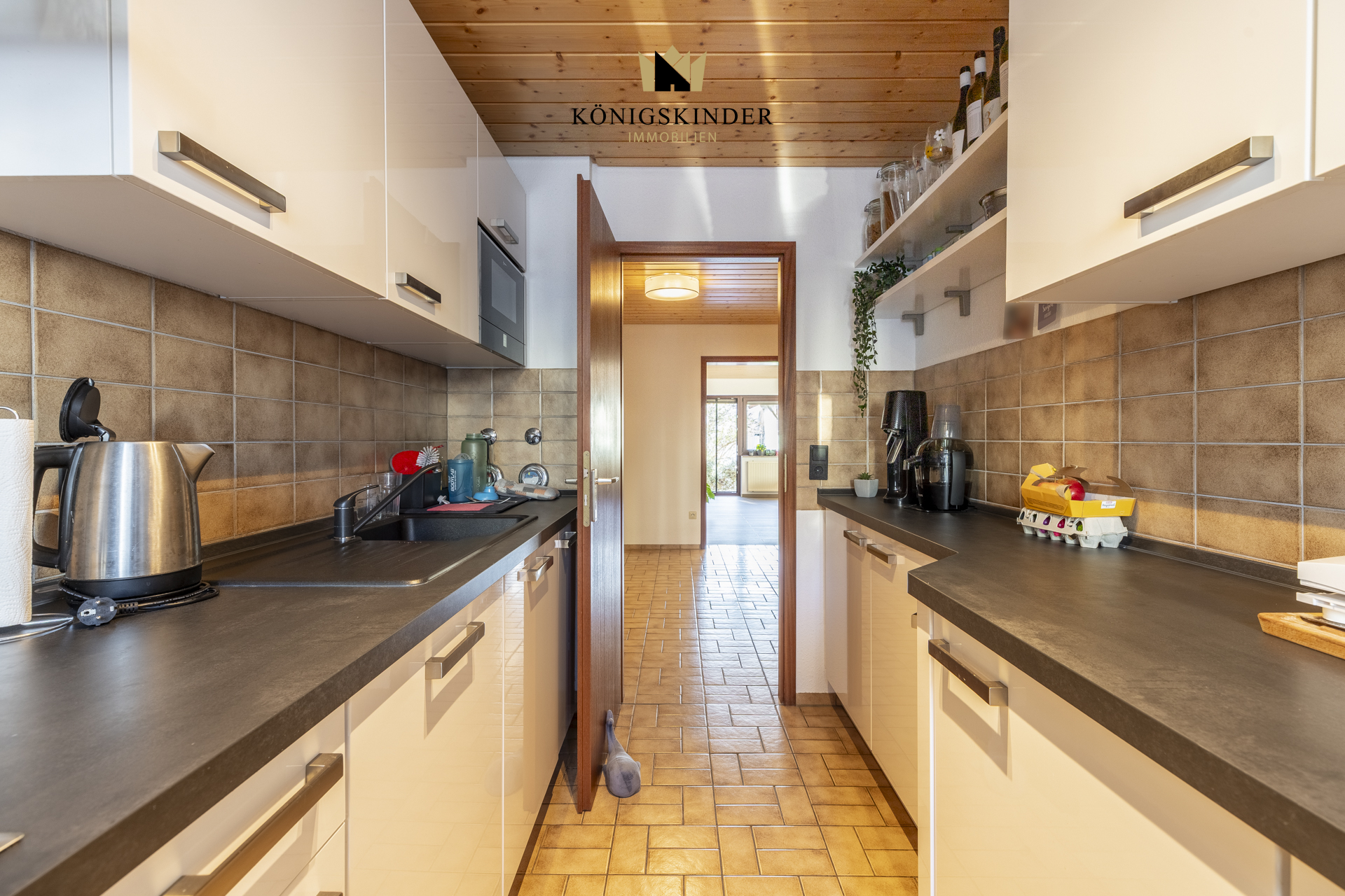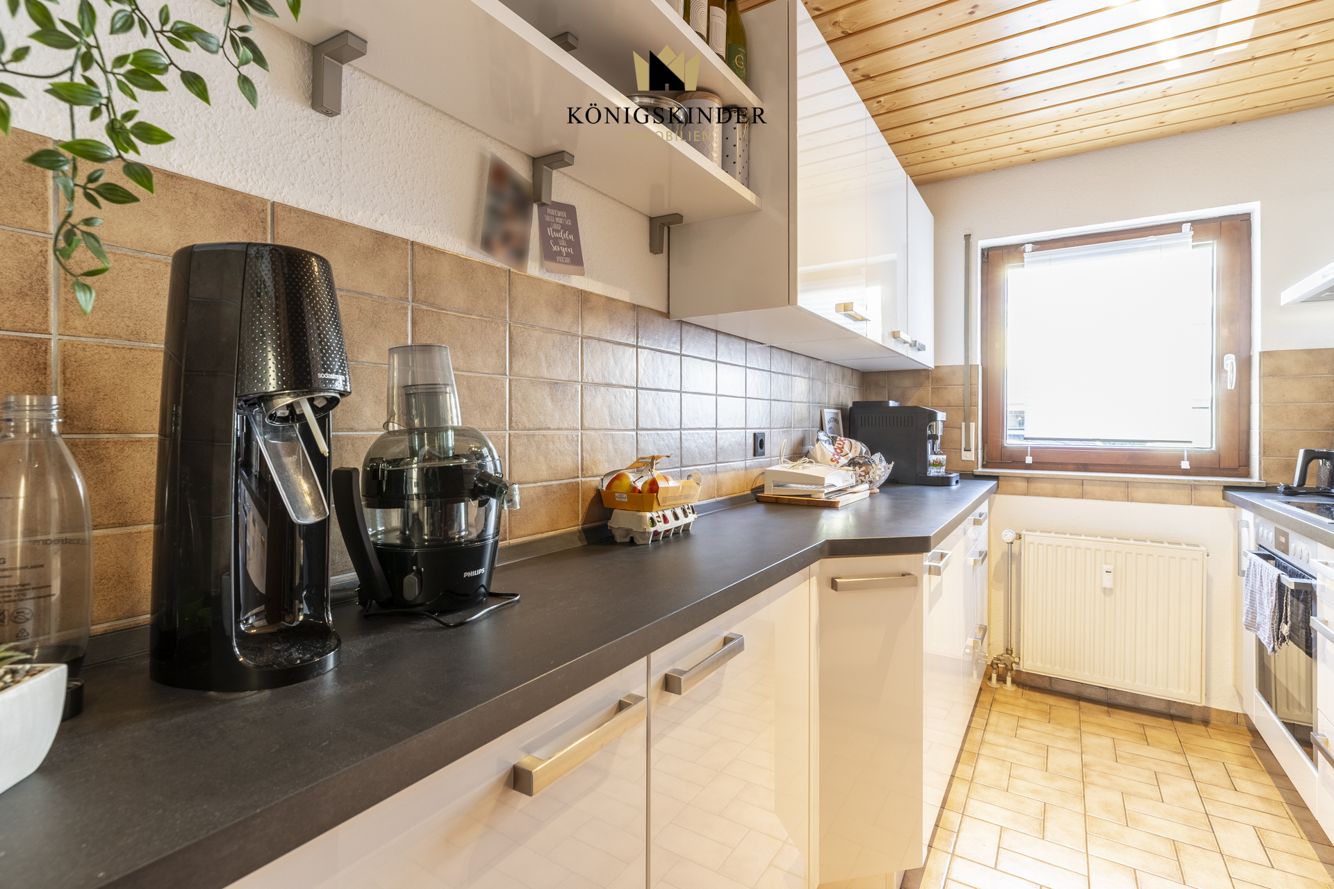 Die gepflegte Einbauküche mit hellen Fronten und dunkler Arbeitsplatte bietet ausreichend Stauraum sowie praktische Arbeitsflächen. Durch das vorhandene Fenster wirkt der Raum angenehm hell und lässt sich gut belüften.