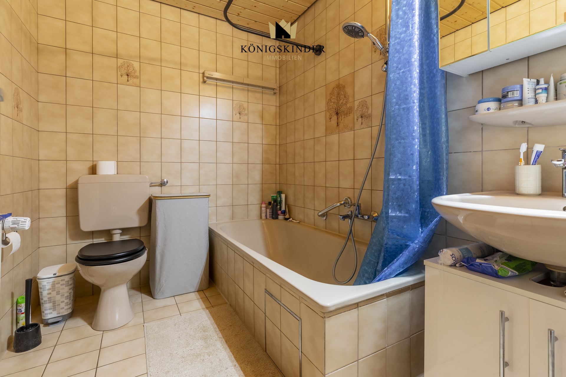 Das Badezimmer ist funktional gestaltet und mit Badewanne, Waschbecken und WC ausgestattet. Helle Fliesen verleihen dem Raum eine zeitlose und gepflegte Optik.