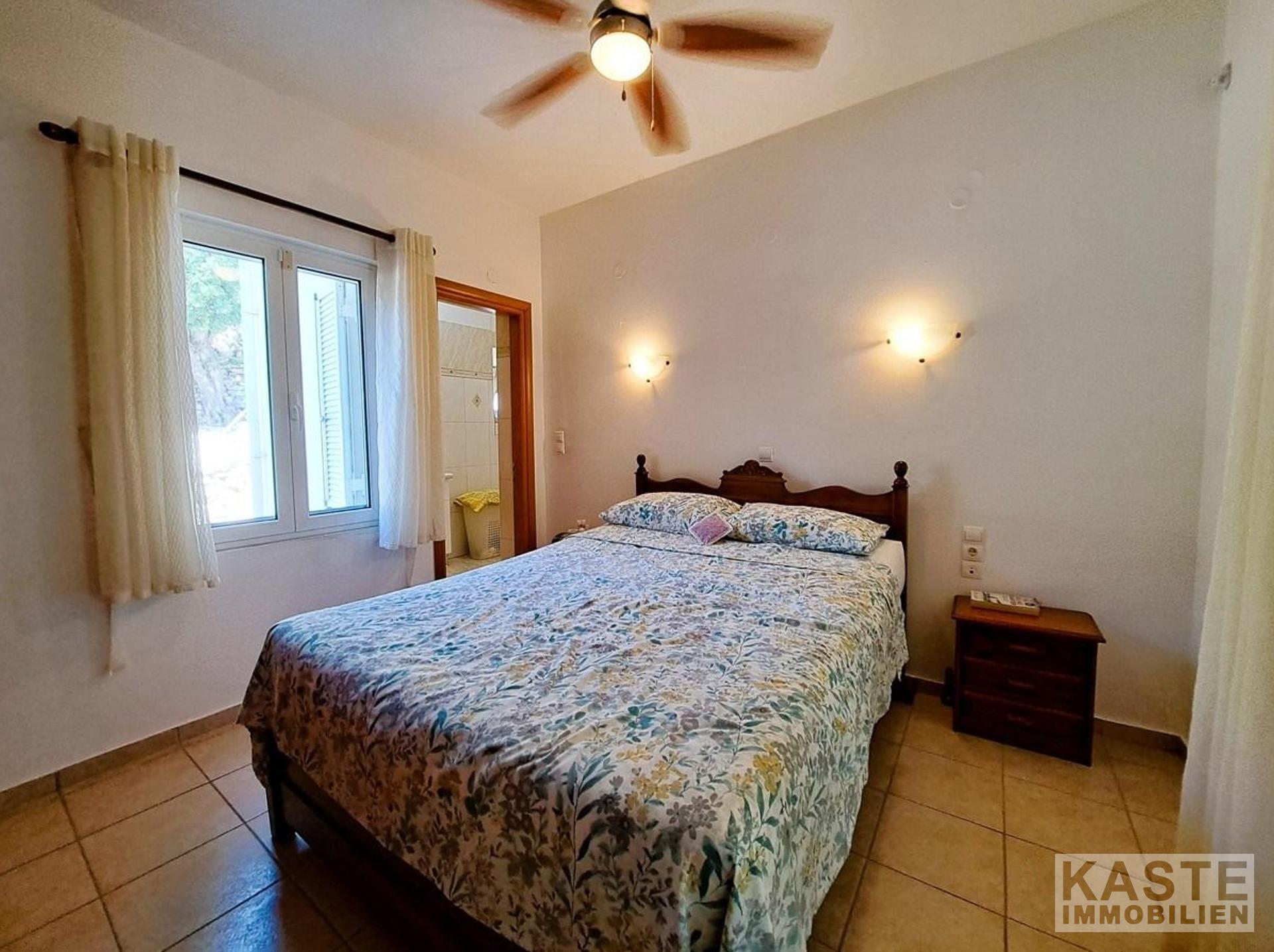 Im Obergeschoss befinden sich zwei weitere geschmackvoll gestaltete Schlafzimmer mit Einbauschränken und Zugang zu Balkonen, die Ihnen beeindruckende Ausblicke auf die umliegenden Weißen Berge und die Natur des Apokoronas-Tals schenken. Das Badezimmer mit integrierter Badewanne und Dusche sowie der Zugang zu einer weiteren großen Sonnenterrasse mit Blick auf den Poolbereich erleichtern die Erholung nach einem aktiven Tag.