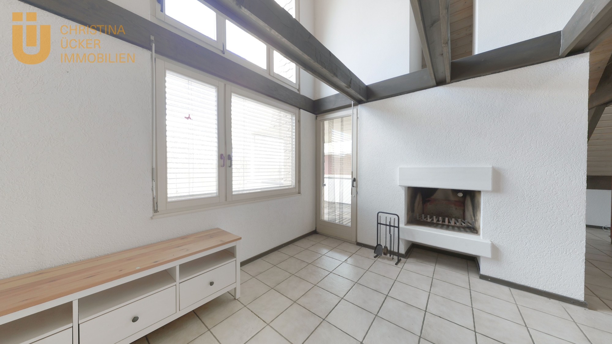 Der angrenzende Wohnbereich ist großzügig und hell. Große Fenster lassen viel Licht herein und schaffen eine angenehme Wohnatmosphäre. Hier lässt sich ein Essbereich einrichten, der nahtlos in den gemütlichen Wohnraum übergeht. Ein Kamin sorgt an kühlen Tagen für wohlige Wärme und verleiht dem Raum ein behagliches Ambiente. Von hier aus gelangt man auf die überdachte Loggia, auf der man bei einem Glas Wein den Feierabend genießt oder einfach die Ruhe genießt.