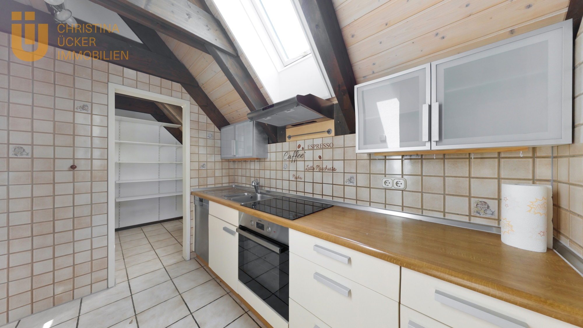 Links vom Eingang öffnet sich die Küche, die mit einer schlichten, zeitlosen Einbauküche ausgestattet ist. Eine Speisekammer mit Regalen bietet zusätzlichen Stauraum und sorgt für Ordnung.