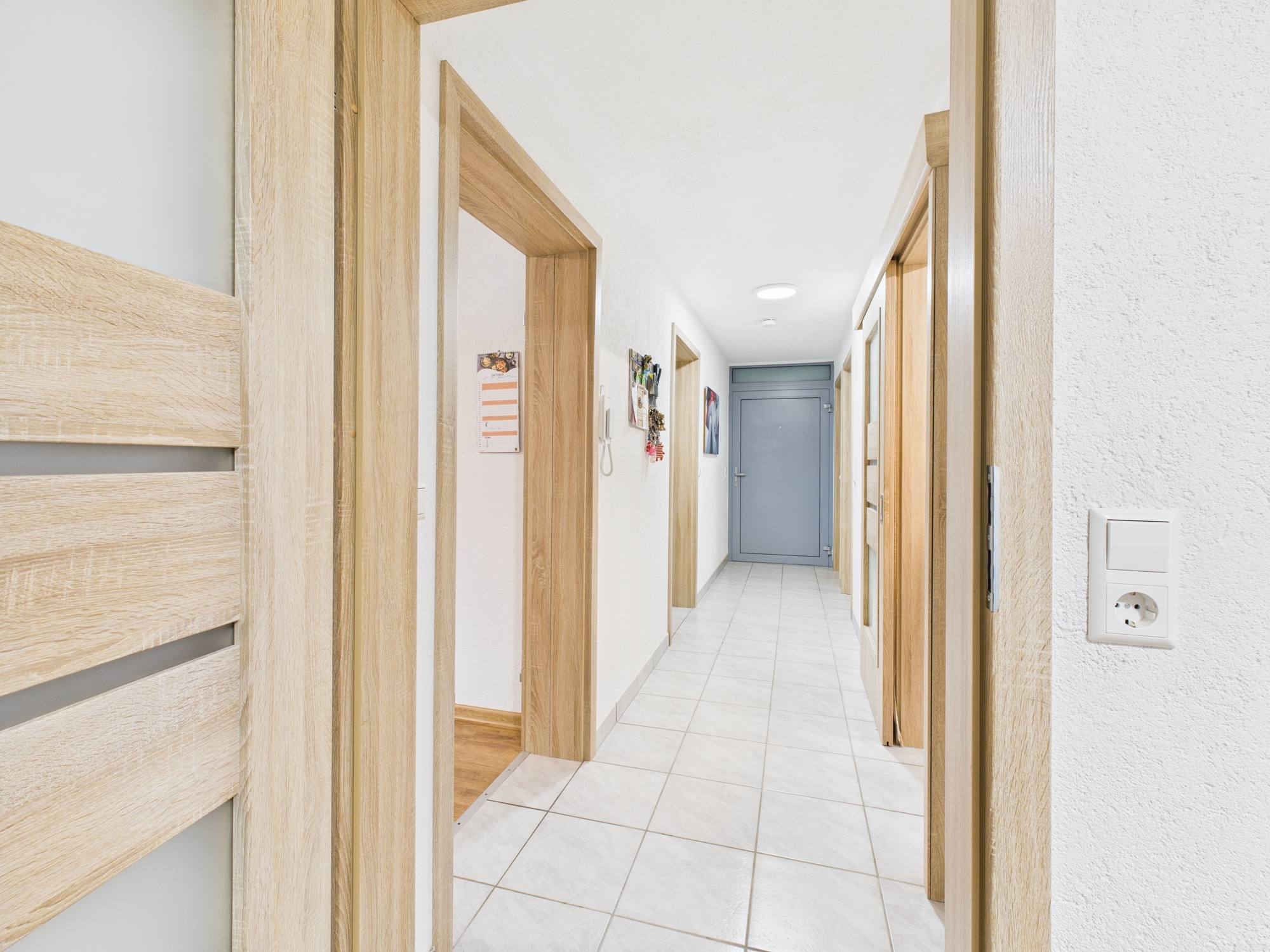 Diese helle und gepflegte 3-Zimmer-Wohnung besticht durch ihren modernen Stil und eine freundliche Atmosphäre. Das Badezimmer verfügt über eine Badewanne und ein Fenster für Tageslicht und Frischluft. Helle Räume und ein gepflegter Flur mit Fliesenboden schaffen ein angenehmes Wohngefühl.