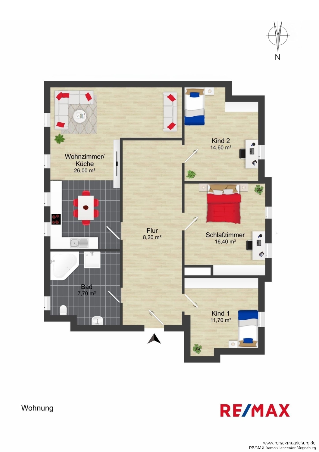 Dachgeschoss, 4-Zimmer mit ca. 84m² Wohnfläche: - Flur, - Wohnbereich mit offener Küche, - Tageslichtbad mit Wanne und Dusche, - Schlafzimmer, - 2 Kinderzimmer,