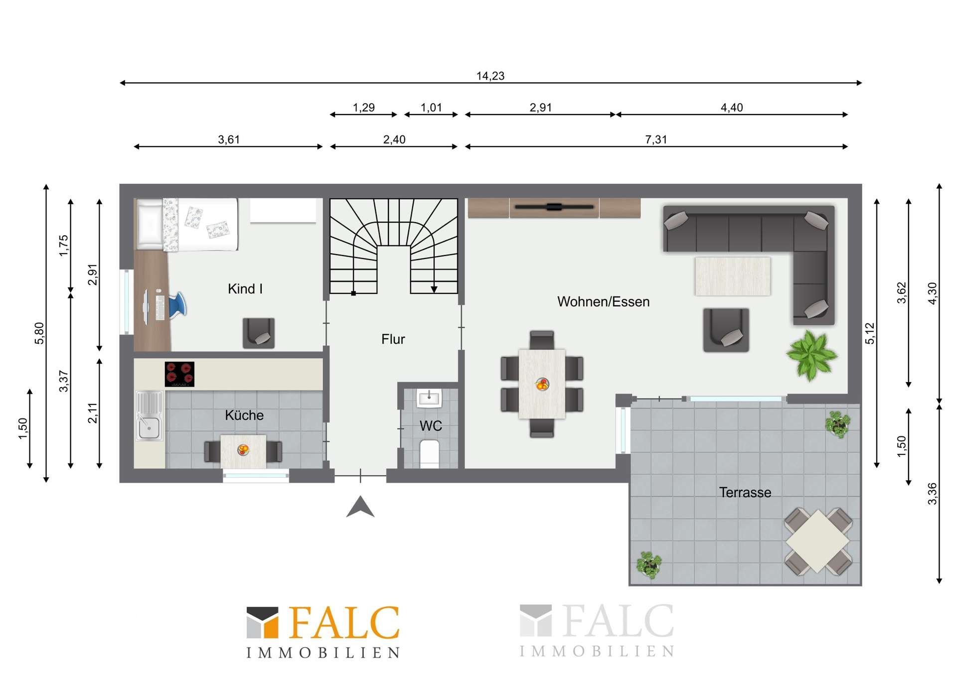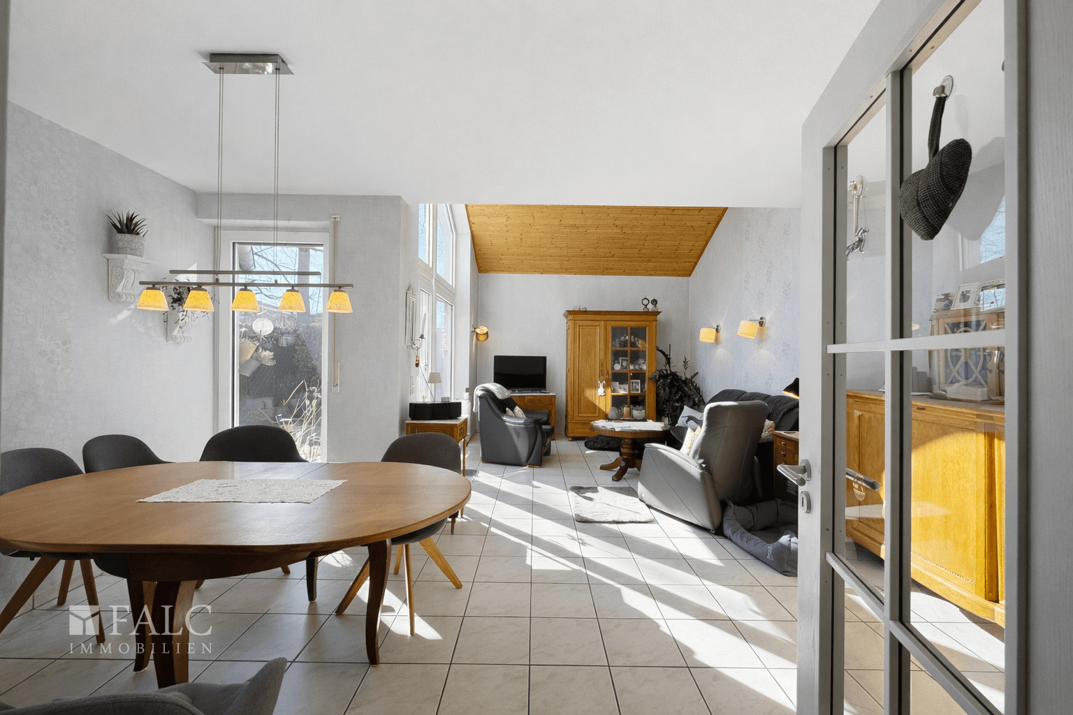 Im Erdgeschoss gelangen Sie über den Eingangsbereich in den Flur. Zur linken Seite befindet sich das Gäste-WC, gegenüber liegt die modern ausgestattete Küche mit großem Tageslichtfenster. Ein zusätzlicher Raum auf dieser Ebene eignet sich ideal als Büro, Gäste- oder Hobbyzimmer. Der großzügige Wohn- und Essbereich ist offen gestaltet, jedoch gut strukturierbar, und bietet durch die hohen Decken mit holzvertäfelter Dachschräge ein besonderes Raumgefühl. Von hier aus haben Sie direkten Zugang zur Terrasse und in den kleinen, gepflegten Garten.