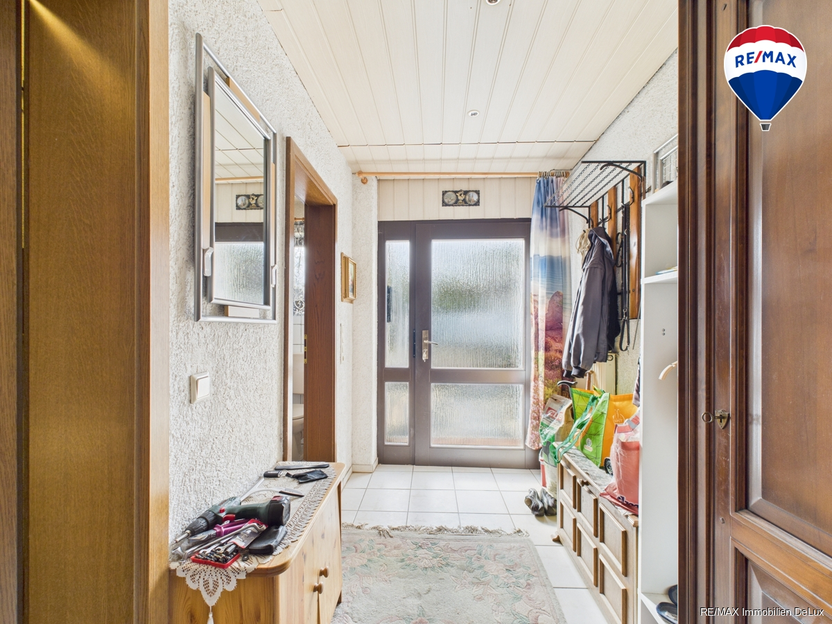 Beim Betreten des Hauses erwartet Sie ein freundlicher Flur, der Ihnen den Zugang zu den verschiedenen Räumen der Immobilie eröffnet. Hier finden Sie ein praktisches Gäste-WC sowie eine Treppe, die Sie in den geräumigen Keller führt.