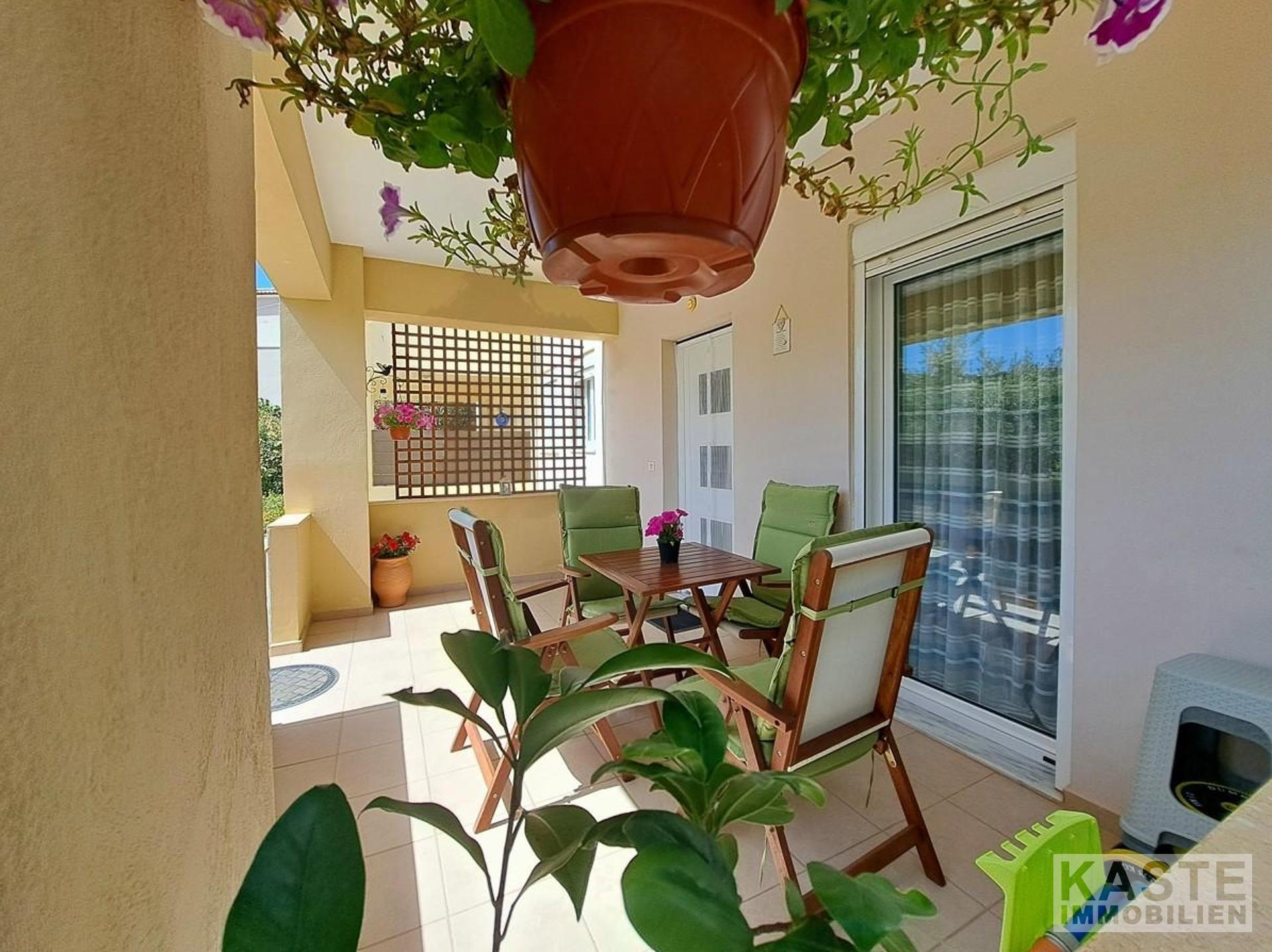 Ein besonderes Highlight ist der private Garten, der mit einem Grill und einem gemütlichen Sitzbereich zum Entspannen und geselligen Beisammensein mit Freunden und Familie einlädt. Zusätzlich steht Ihnen ein Gemeinschaftspool zur Verfügung, der an warmen Tagen für Erfrischung sorgt. Zwei schöne Balkone bieten Ihnen die perfekte Möglichkeit, Mahlzeiten im Freien zu genießen oder sich in der Sonne zu entspannen.