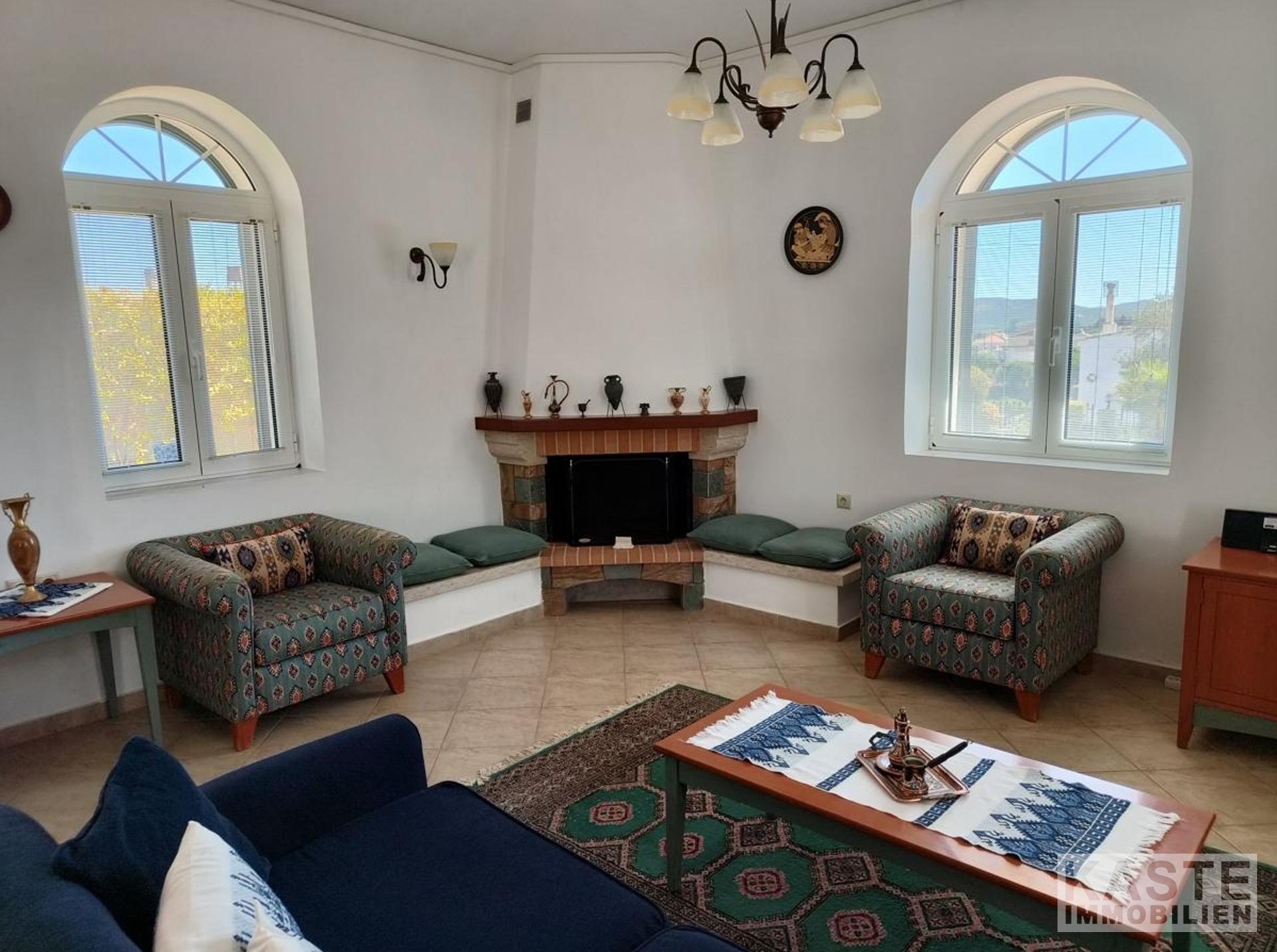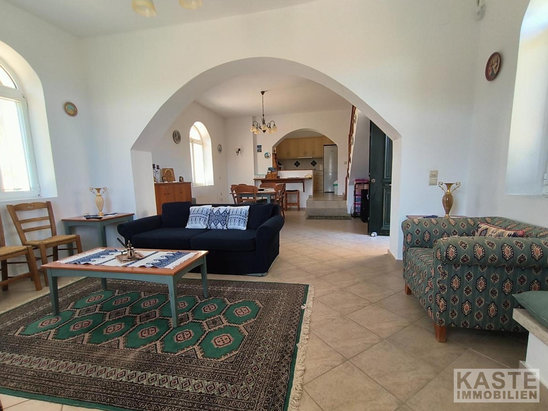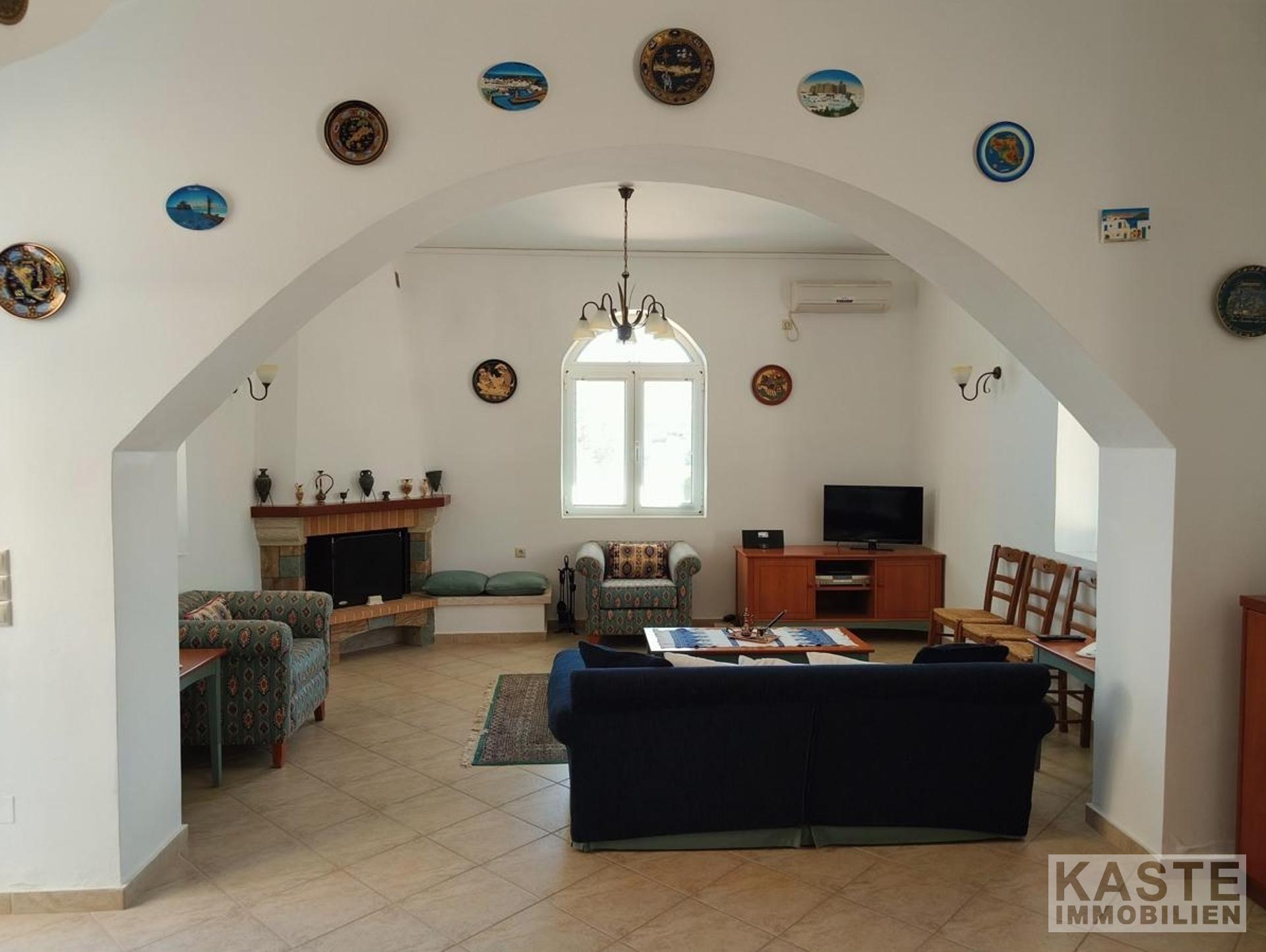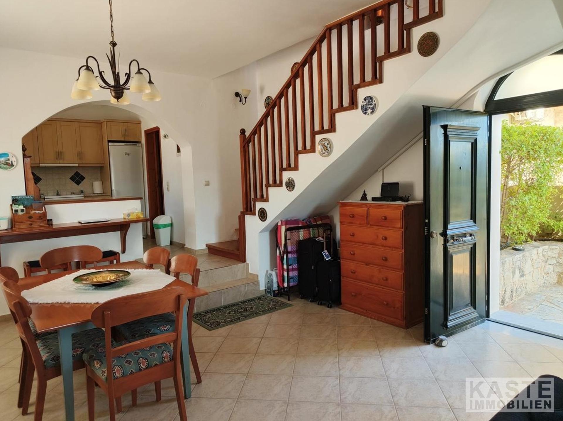 Das Haus verfügt über zwei geschmackvoll gestaltete Schlafzimmer mit Einbauschränken, die viel Platz für individuellen Stauraum bieten. Zwei Badezimmer sorgen für zusätzlichen Komfort. Das Erdgeschoss besticht mit einer offenen, funktionalen Küche mit Einbauküche, die nahtlos in den Ess- und Wohnbereich übergeht. Das Wohnzimmer beeindruckt mit einem typisch kretischen Kamin aus Ziegeln und Stein, der für gemütliche Abende sorgt. Von hier aus gelangt man direkt in den liebevoll angelegten Garten mit Rasenflächen, Steinmauern sowie einem windgeschützten Abstellraum mit Waschbecken – ideal zum Genießen von Freizeit und Familienfeiern im Freien.