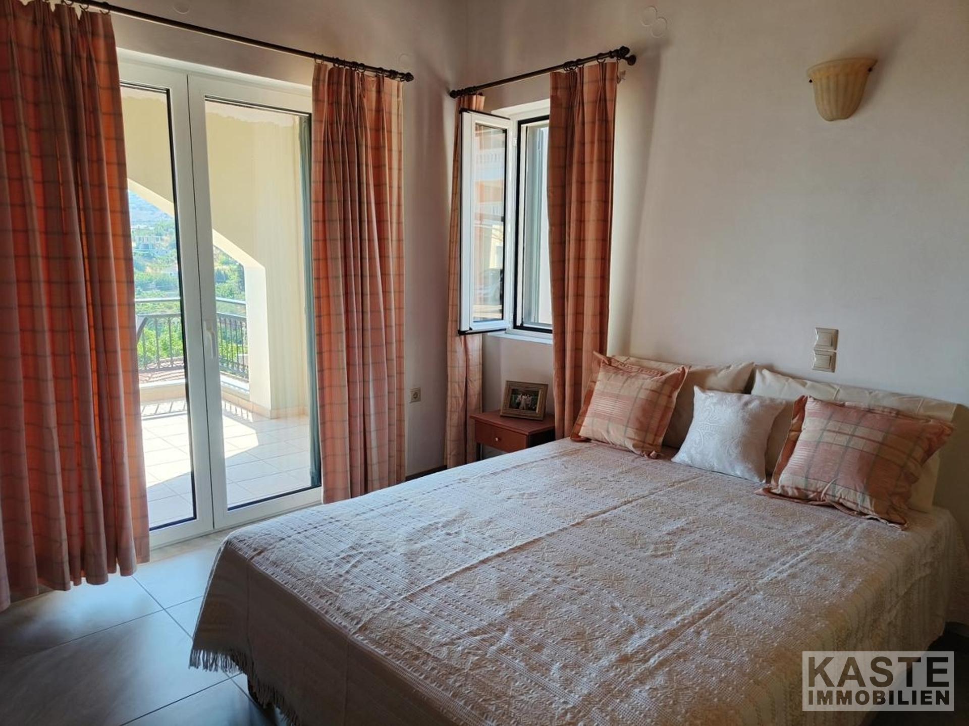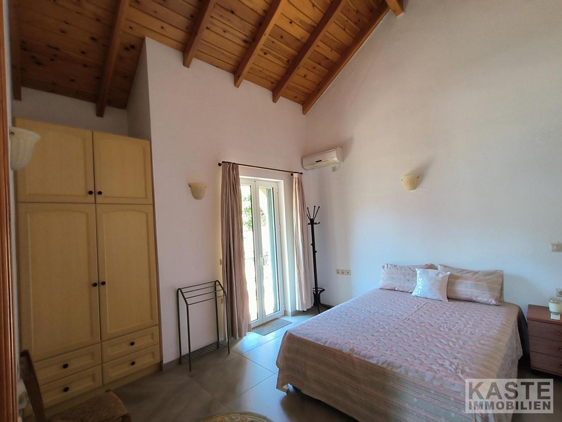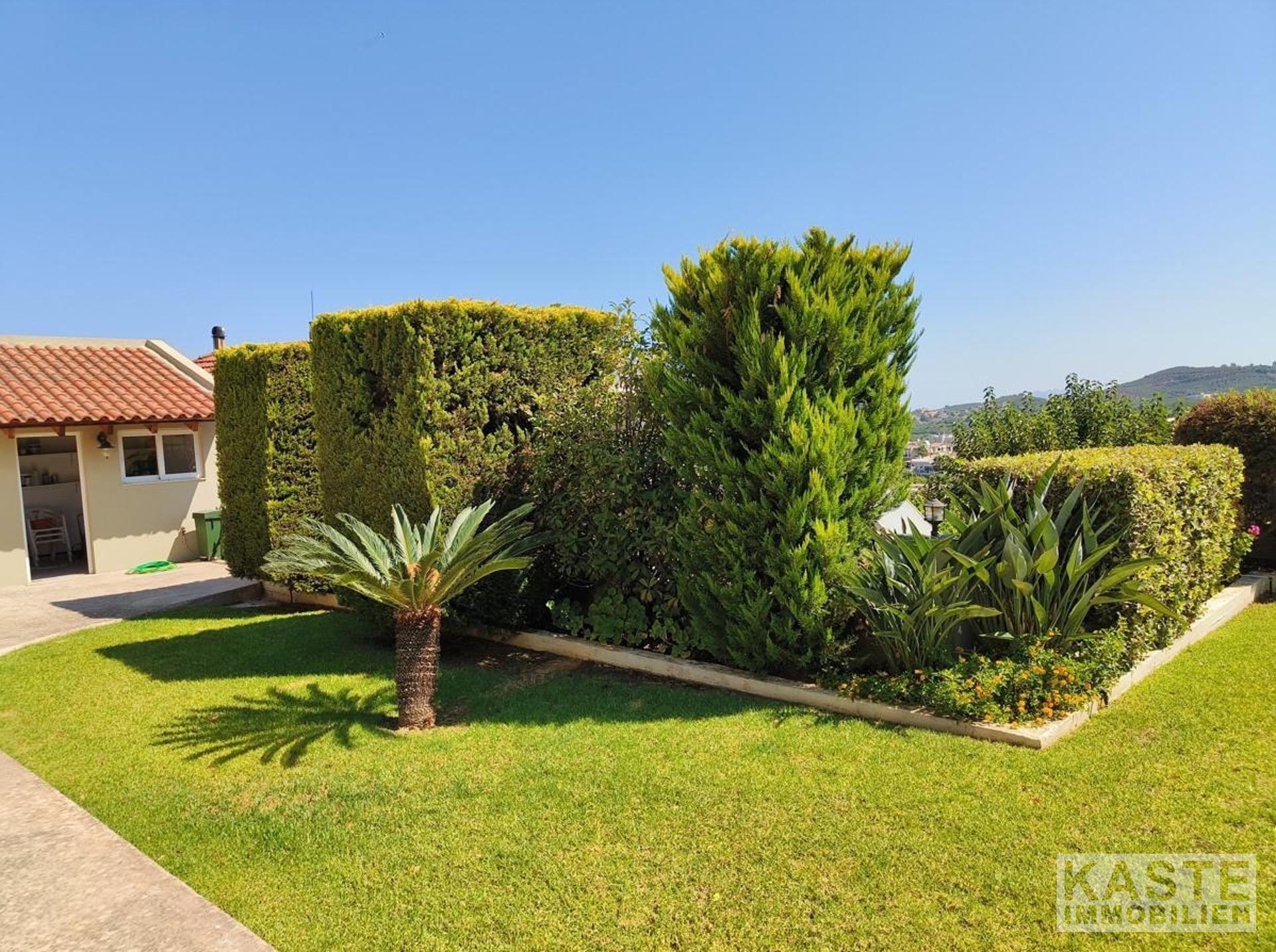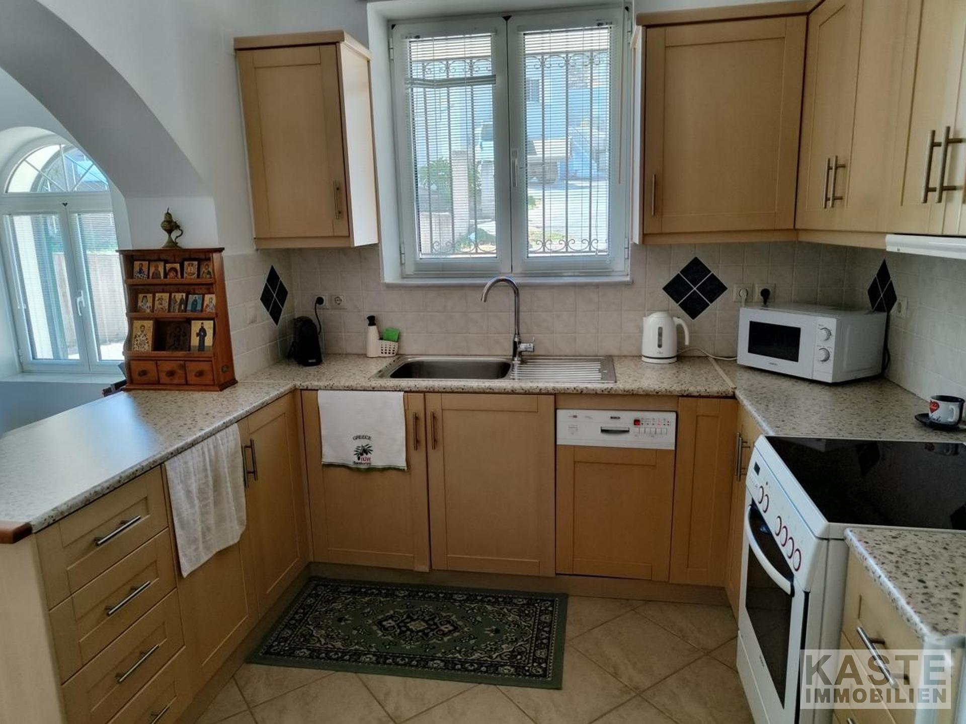 Das Haus verfügt über zwei geschmackvoll gestaltete Schlafzimmer mit Einbauschränken, die viel Platz für individuellen Stauraum bieten. Zwei Badezimmer sorgen für zusätzlichen Komfort. Das Erdgeschoss besticht mit einer offenen, funktionalen Küche mit Einbauküche, die nahtlos in den Ess- und Wohnbereich übergeht. Das Wohnzimmer beeindruckt mit einem typisch kretischen Kamin aus Ziegeln und Stein, der für gemütliche Abende sorgt. Von hier aus gelangt man direkt in den liebevoll angelegten Garten mit Rasenflächen, Steinmauern sowie einem windgeschützten Abstellraum mit Waschbecken – ideal zum Genießen von Freizeit und Familienfeiern im Freien.
