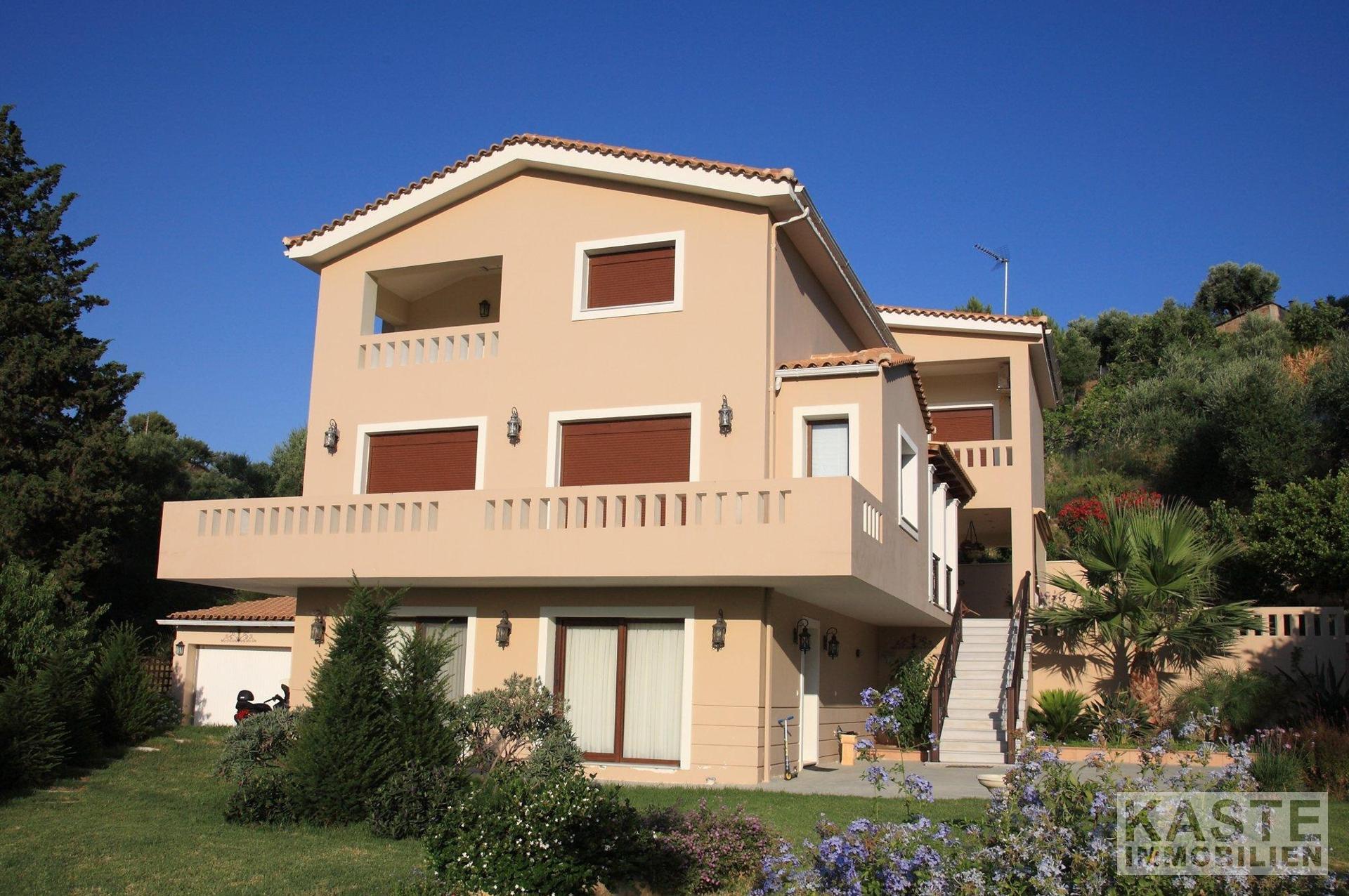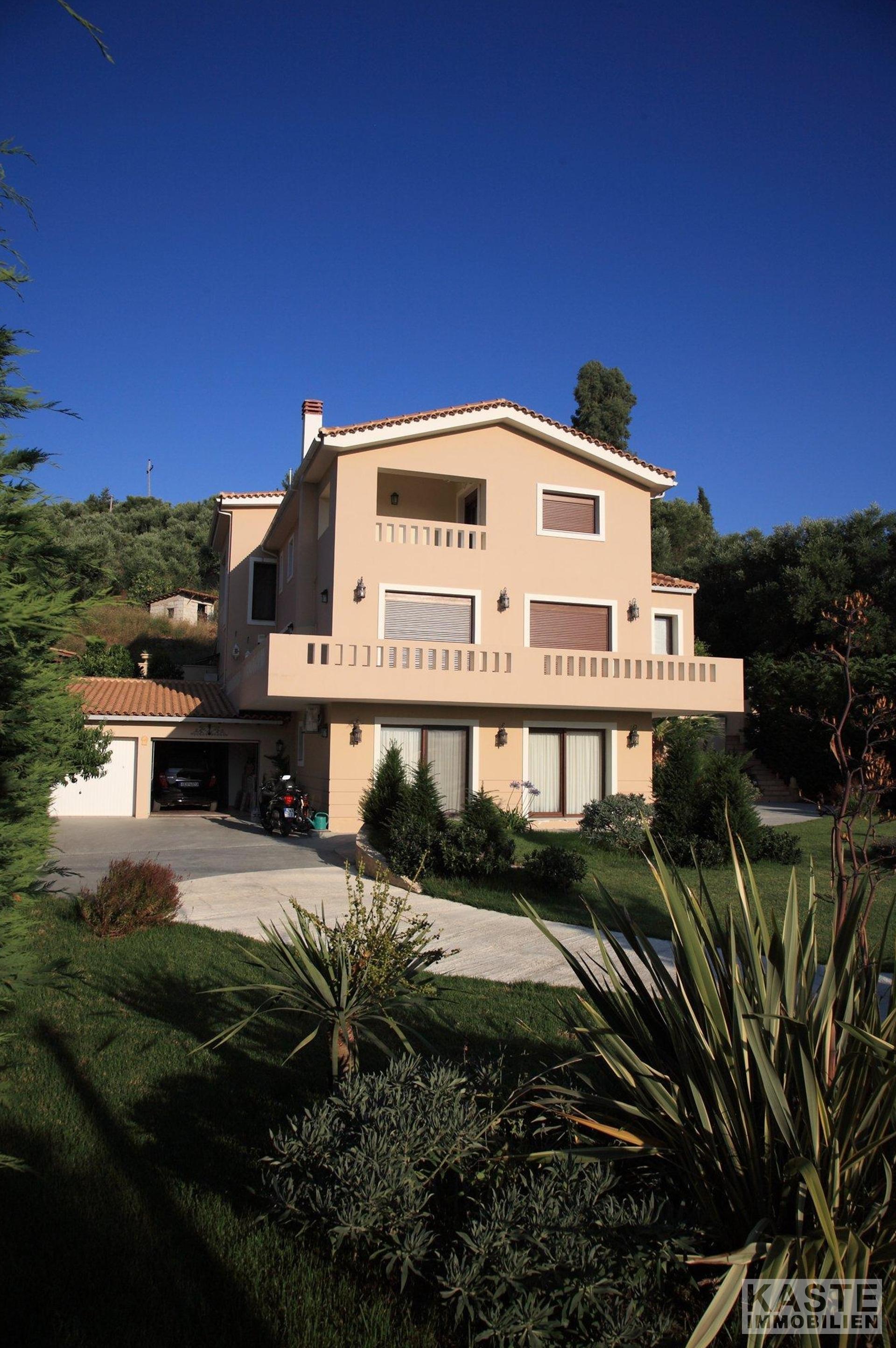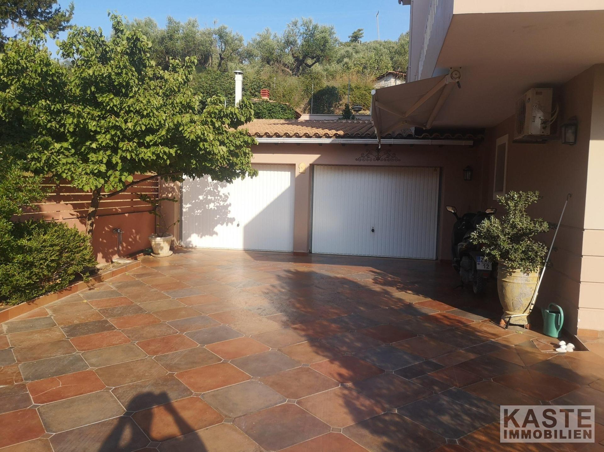 Die geschlossenen Terrassen ermöglichen es Ihnen, die atemberaubende Aussicht auf die umliegende Natur zu jeder Jahreszeit zu genießen, ebenso wie der umlaufende Balkon, der die erste Etage umgibt. Die gepflegten Gärten und der großzügige, durch ein Tor geschützte Einfahrt verleihen der Immobilie ein einladendes Ambiente. Eine angrenzende große Doppelgarage bietet geschlossenen Parkraum für mindestens zwei Fahrzeuge. Diese Villa repräsentiert eine einzigartige Gelegenheit, das exklusive Wohnen auf Zakynthos in vollen Zügen zu genießen.