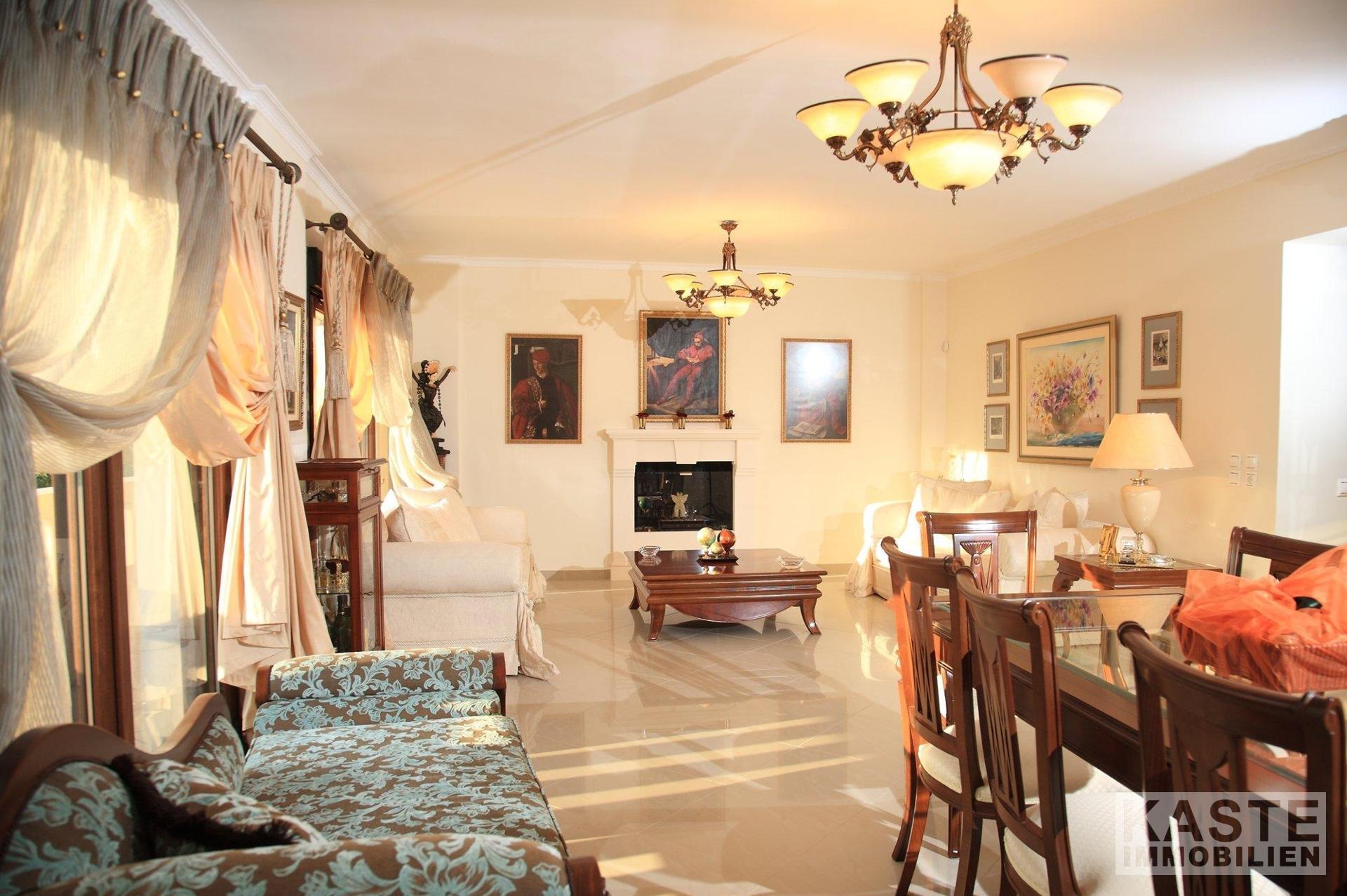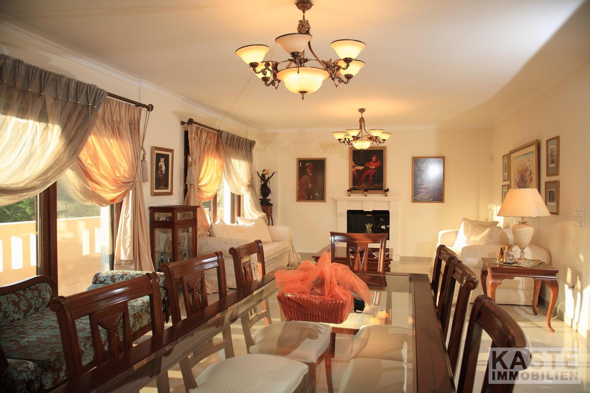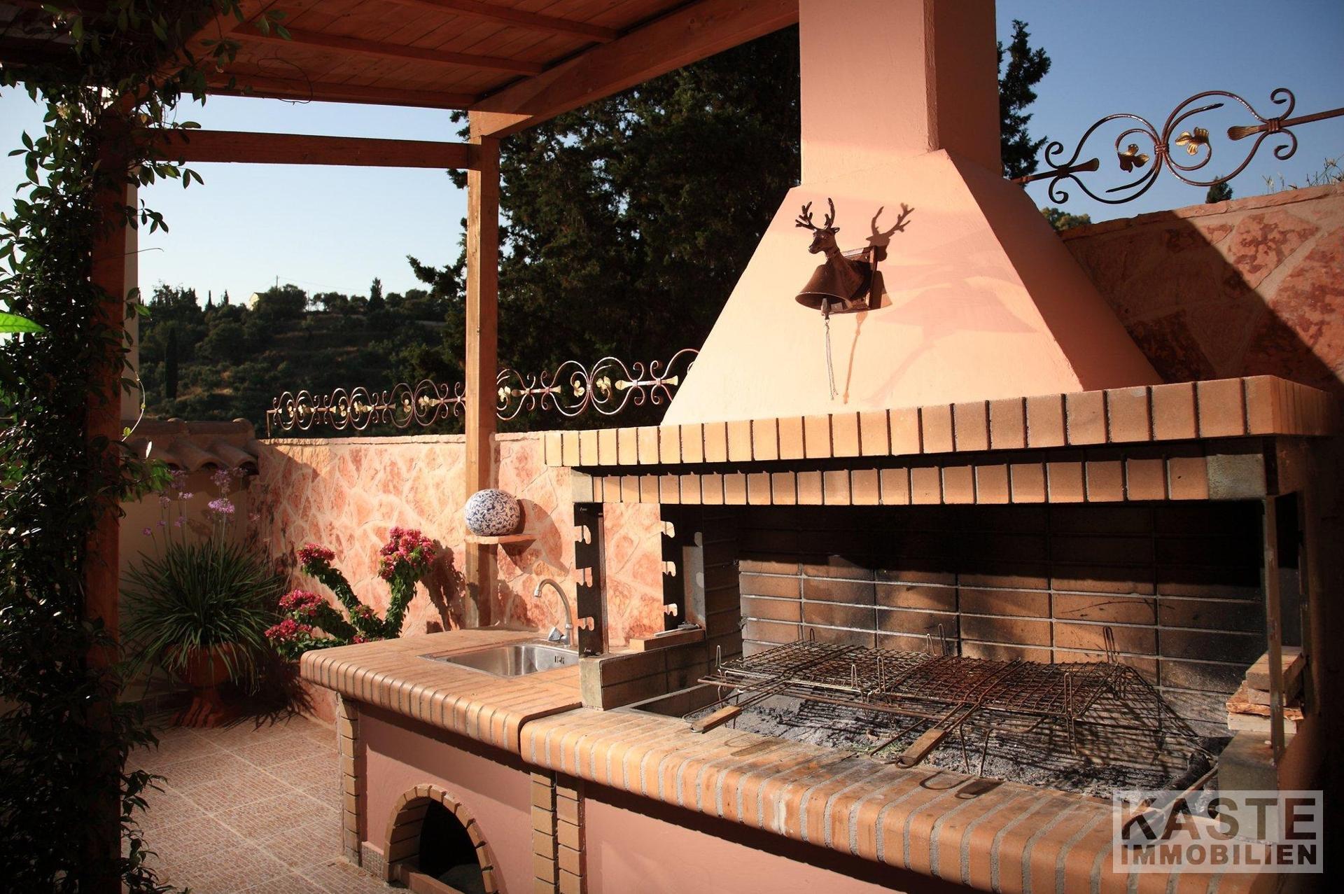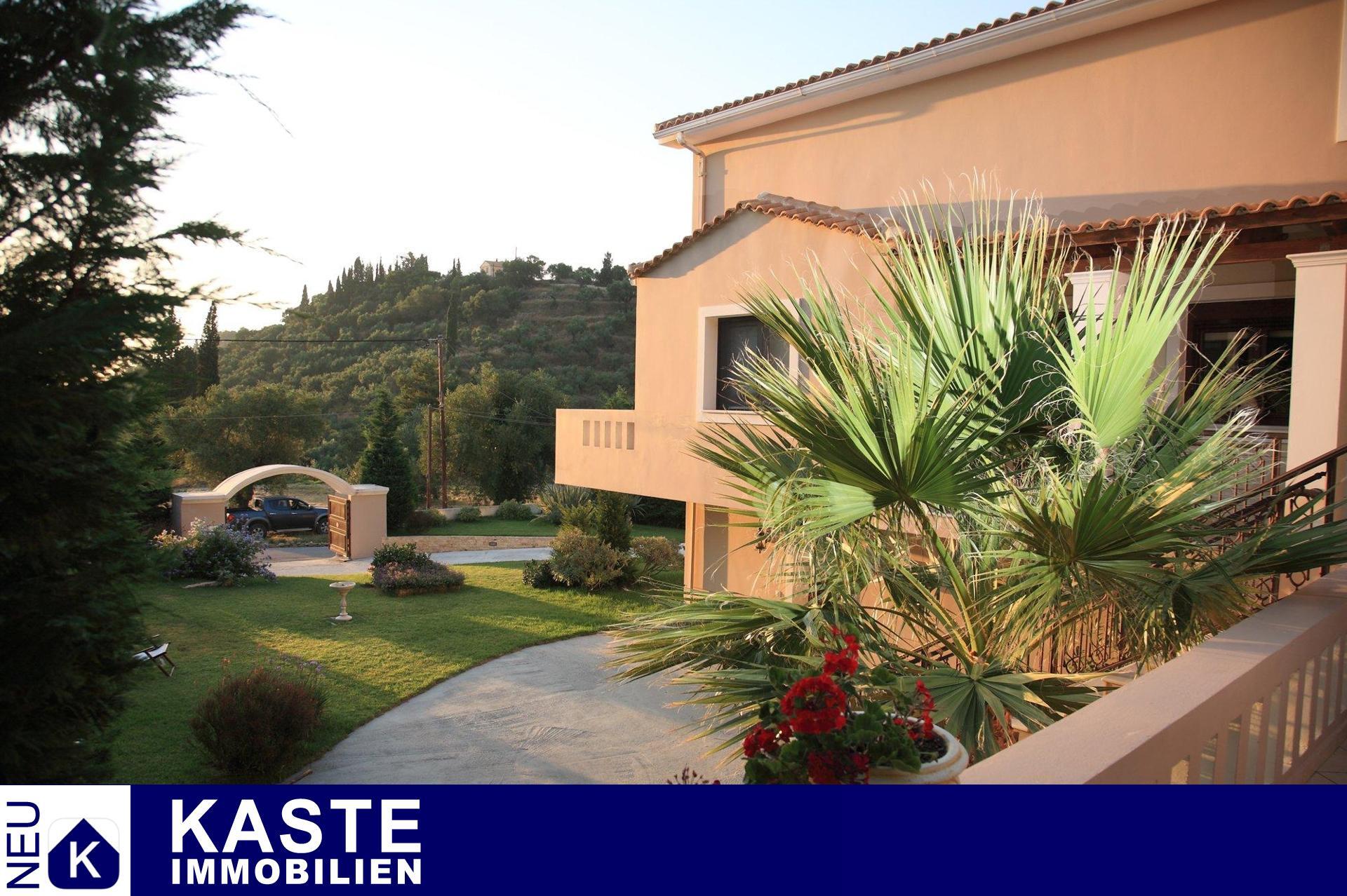 Die geschlossenen Terrassen ermöglichen es Ihnen, die atemberaubende Aussicht auf die umliegende Natur zu jeder Jahreszeit zu genießen, ebenso wie der umlaufende Balkon, der die erste Etage umgibt. Die gepflegten Gärten und der großzügige, durch ein Tor geschützte Einfahrt verleihen der Immobilie ein einladendes Ambiente. Eine angrenzende große Doppelgarage bietet geschlossenen Parkraum für mindestens zwei Fahrzeuge. Diese Villa repräsentiert eine einzigartige Gelegenheit, das exklusive Wohnen auf Zakynthos in vollen Zügen zu genießen.