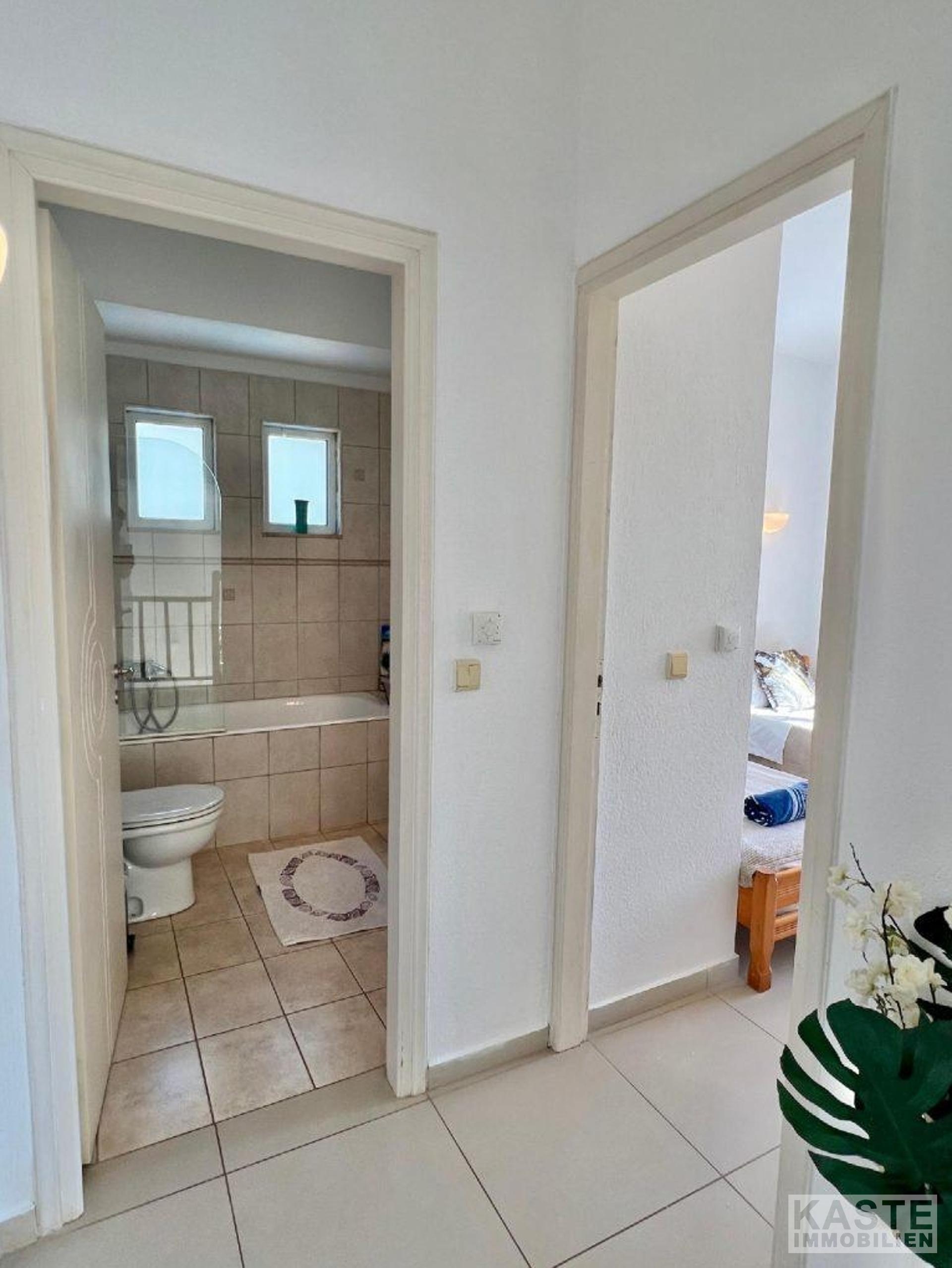 Die Schlafbereiche befinden sich auf den höheren Etagen: Das zweite Badezimmer sowie ein charmantes Zweibettzimmer mit großem Einbauschrank und Balkon mit Meerblick befinden sich auf dem Zwischengeschoss. Im Obergeschoss liegt ein Doppelzimmer mit Terrasse, von der sich faszinierende Aussichten auf das Meer und die Berglandschaften zeigen. Die Marmortreppe im Wohnbereich führt elegant nach oben.