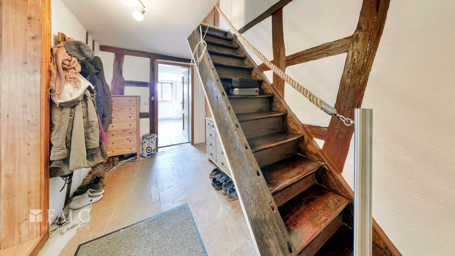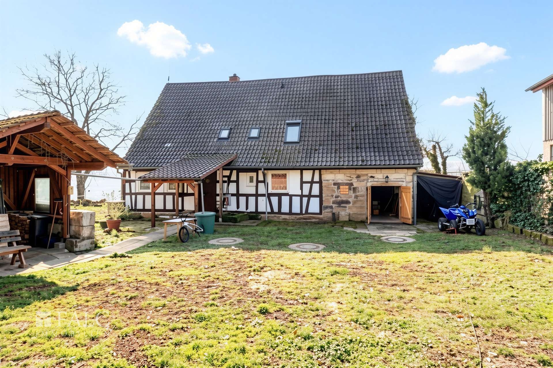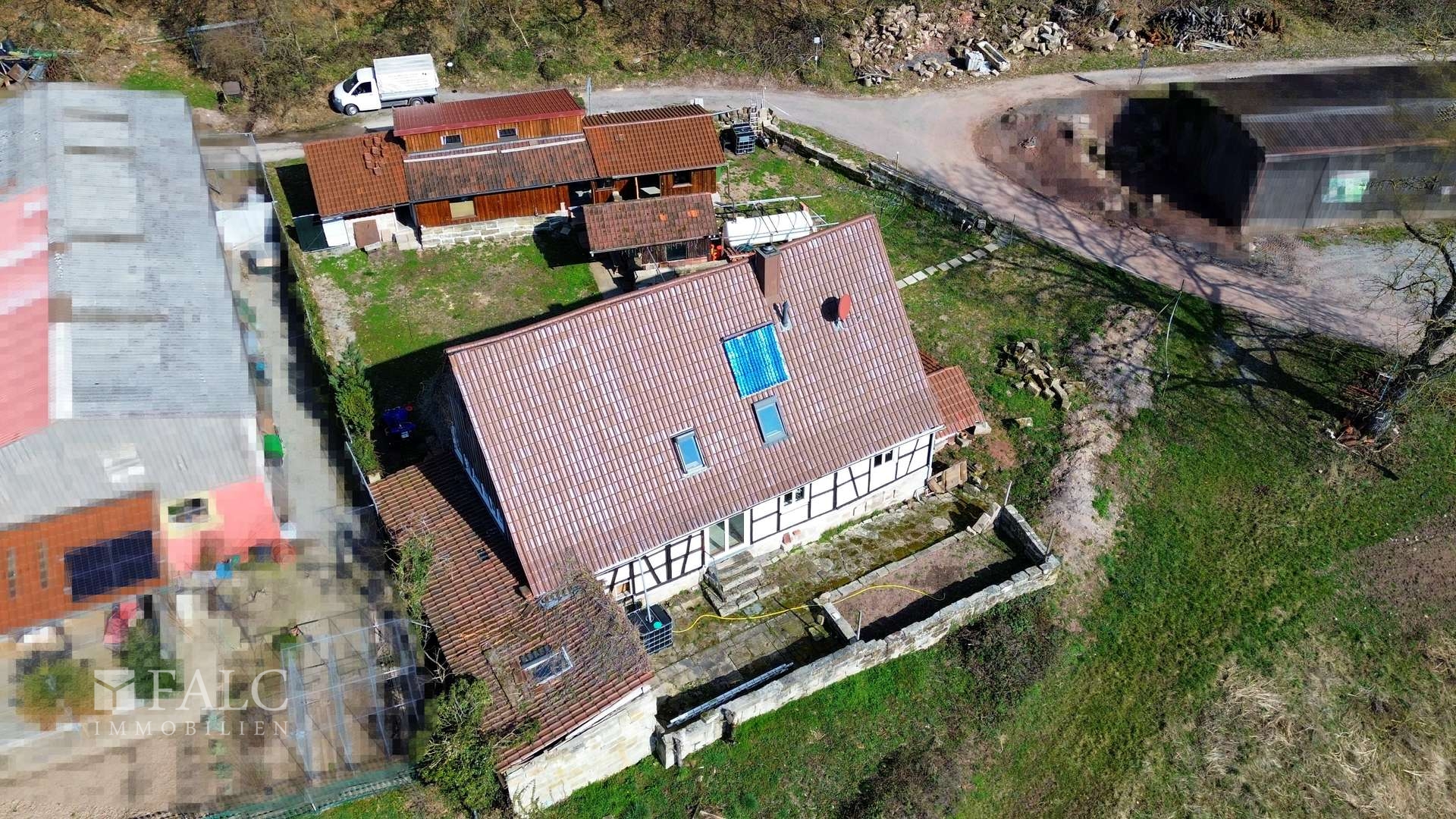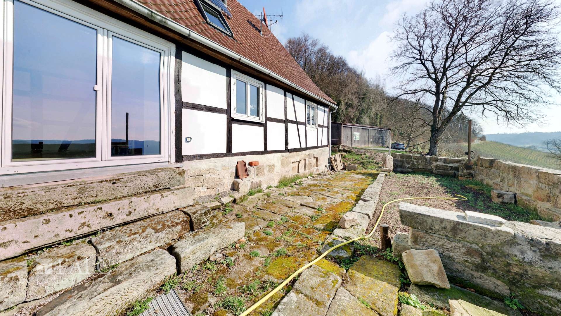 Angeboten wird ein Fachwerk-Bauernhaus mit robusten Eichenfachwerkbalken in einzigartiger Aussichtslage mit unbekanntem Baujahr. Die ersten Pläne sind von 1968, vermutlich wurde in diesem Zeitraum das Gebäude das erste Mal kernsaniert. Am Eingang zum Gewölbekeller ist die Zahl 1822 eingemeißelt. (Kein Denkmal)