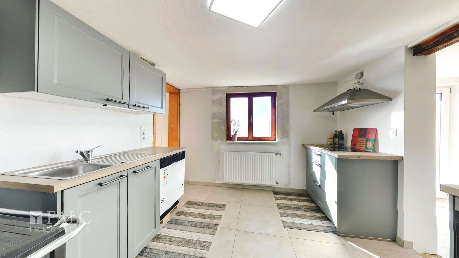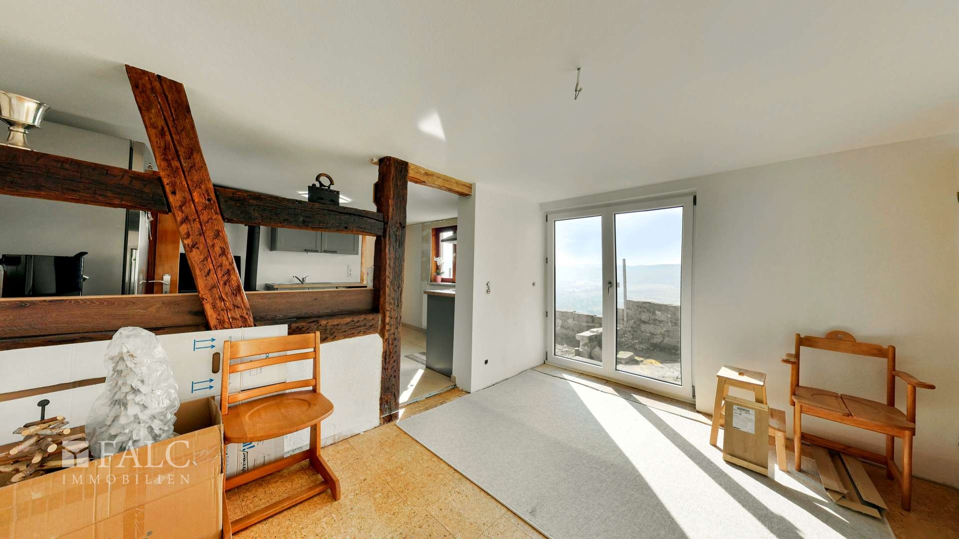 Auf einen Blick: *Erdgeschoss (ca. 86 m² Wohnfläche) - offener Koch- und Ess- oder Wohnbereich mit freiliegender Holzfachwerkwand - Kochbereich mit neuer Einbauküche. Neuem Fliesenboden und sehr schönem Holzbeistellherd mit Backofen - Vom Essbereich Zugang zur Terrasse mit einzigartigem Weitblick - Wohn- oder Esszimmer mit neuem Vinylboden - Schlaf-, Büro oder Kinderzimmer mit neuem Vinylboden - Tageslichtbad mit Dusche und Badewanne (noch nicht renoviert) - Eingangsbereich mit Garderobe (Bodenbelag fehlt noch) - Gästetoilette mit Waschbecken im Eingangsbereich (noch nicht renoviert) - Abstellraum (noch nicht renoviert) - Zugang zur Tenne - durchschnittliche Deckenhöhe ca. 2,17 m