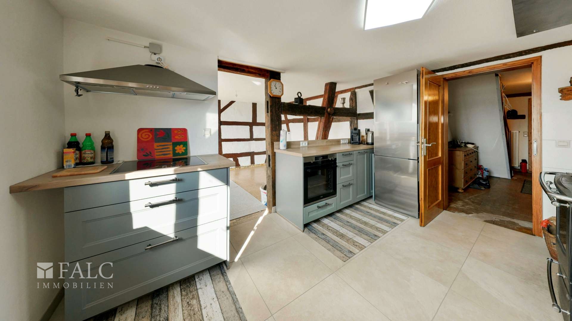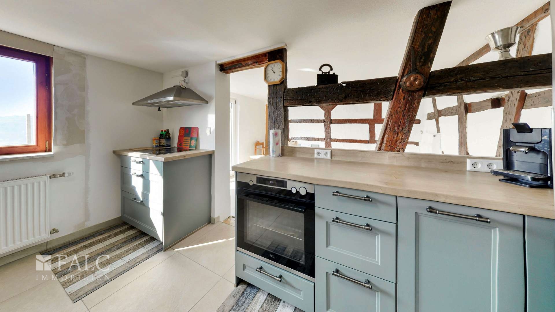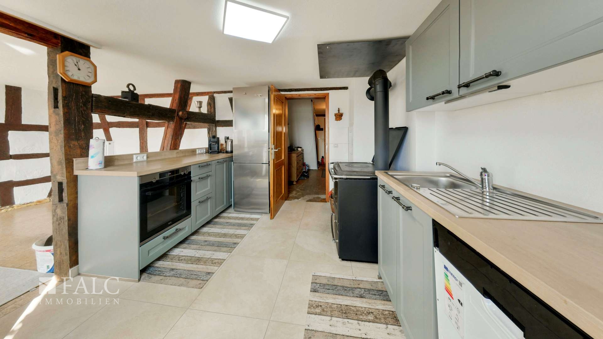 Im Erdgeschoss erwartet Sie ein offener Koch- und Ess- oder Wohnbereich mit einer freiliegenden wunderschönen Holzfachwerkwand. Der Kochbereich ist mit einer neuen Einbauküche und einem geschmackvollen Holzbeistellherd mit Backofen ausgestattet.