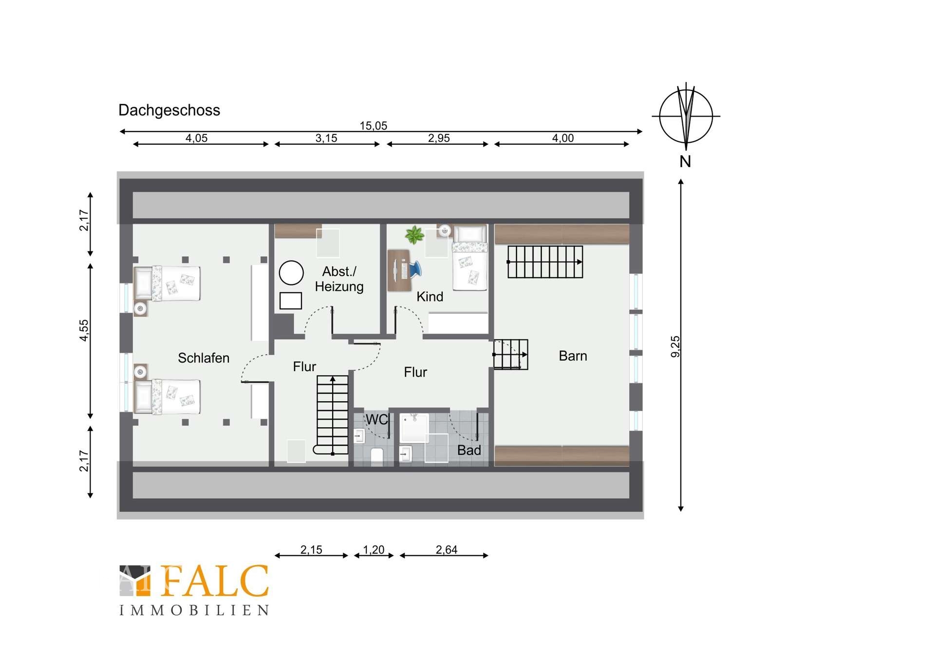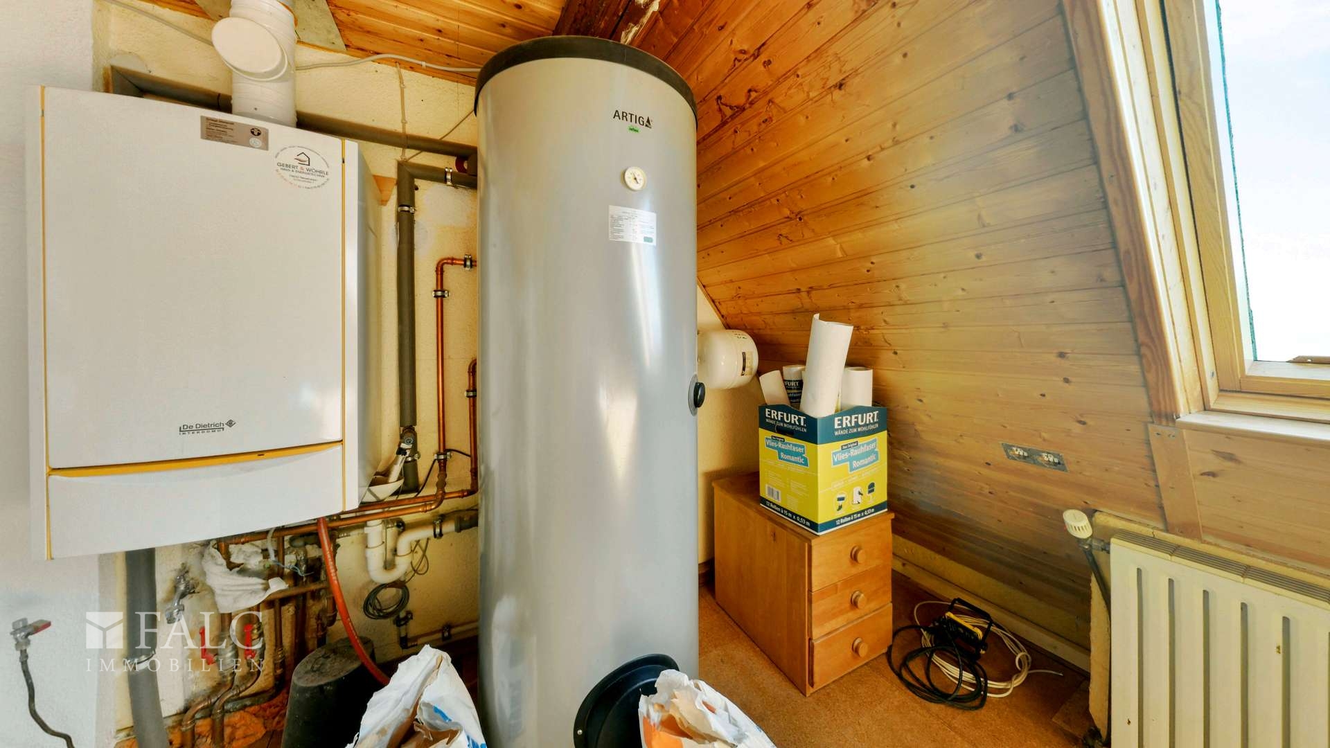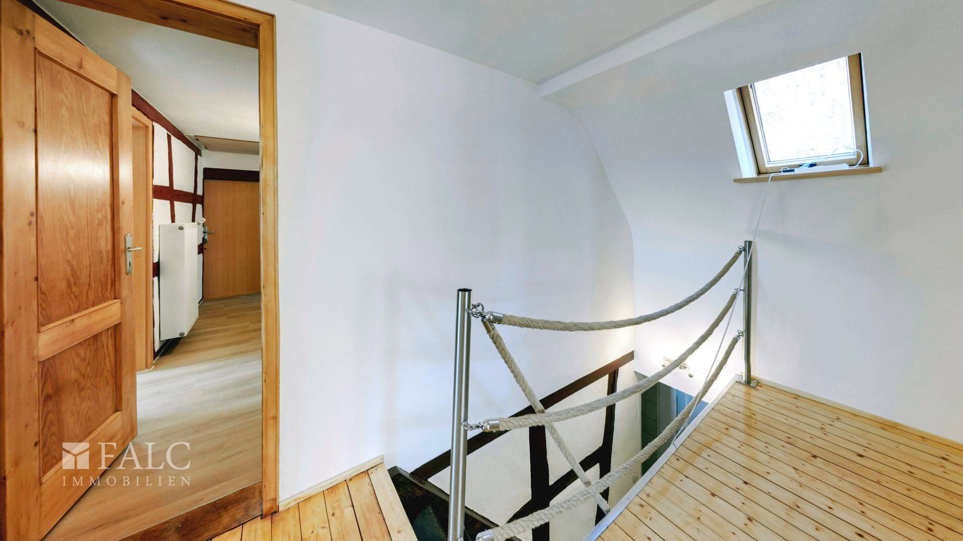 *Dachgeschoss (ca. 50m² Wohnfläche) - großes Schlafzimmer mit offenen Fachwerkwänden - Kinderzimmer mit Sichtfachwerk - Duschbad - separates WC - Heizraum und Abstellraum (Gastherme mit Warmwasserpuffer) - durchschnittliche Deckenhöhe ca. 2,14 m - Zugang zur teilweise ausgebauten Scheune über der Tenne