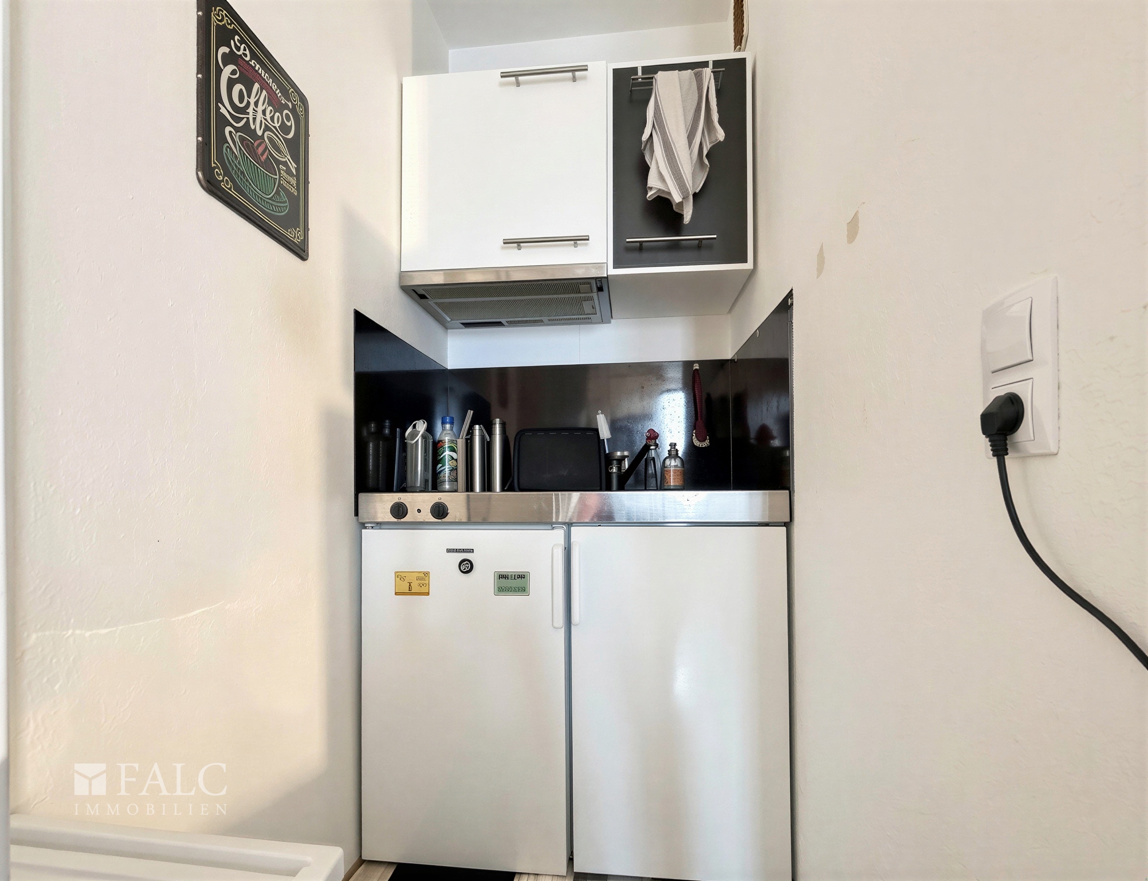 Das Badezimmer präsentiert sich modern gefliest und ist mit einer Dusche, einem Waschbecken sowie einem WC ausgestattet. Eine kompakte Pantry-Küche ergänzt das Raumangebot perfekt und eignet sich hervorragend für die Zubereitung kleiner Mahlzeiten im Alltag.