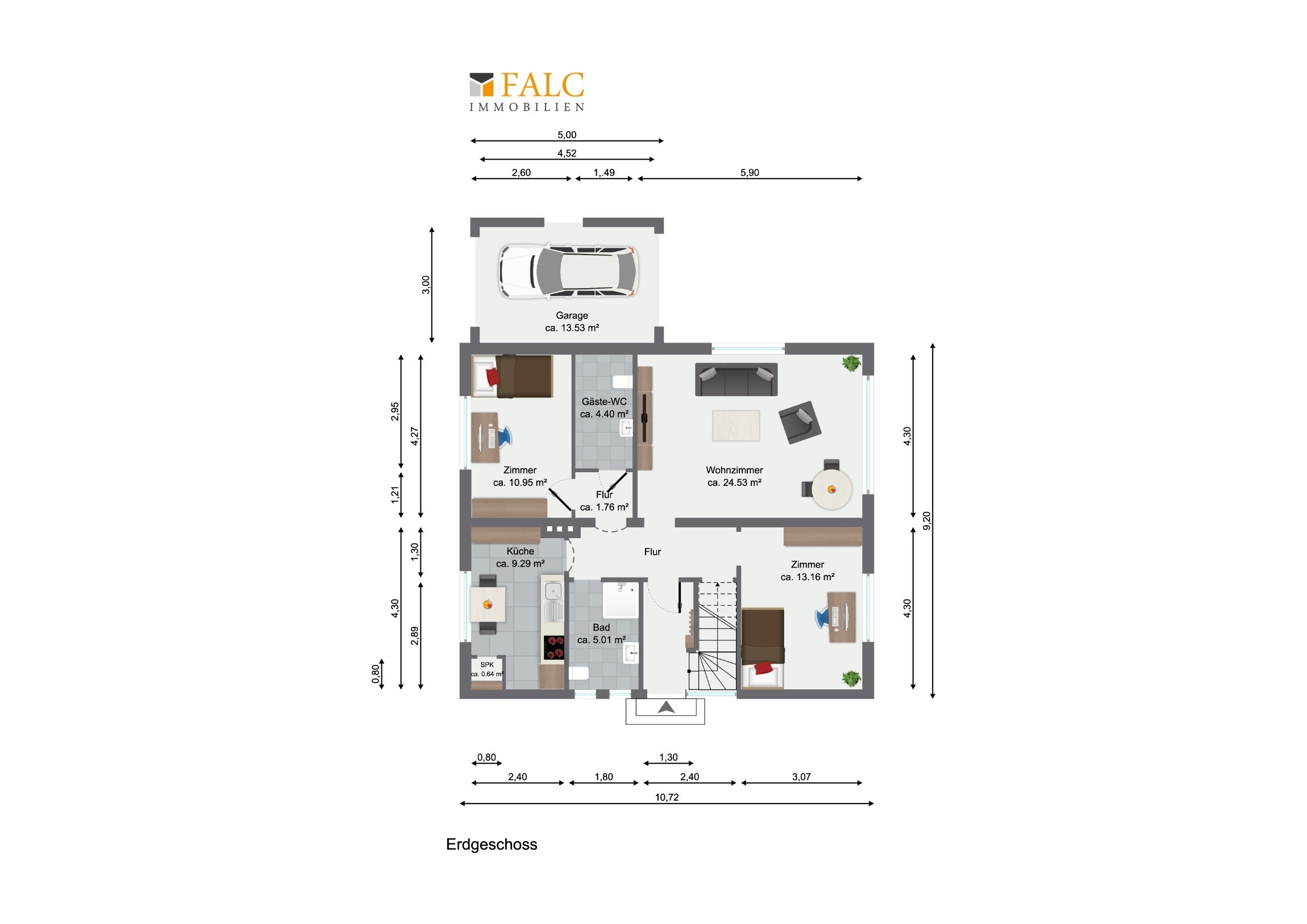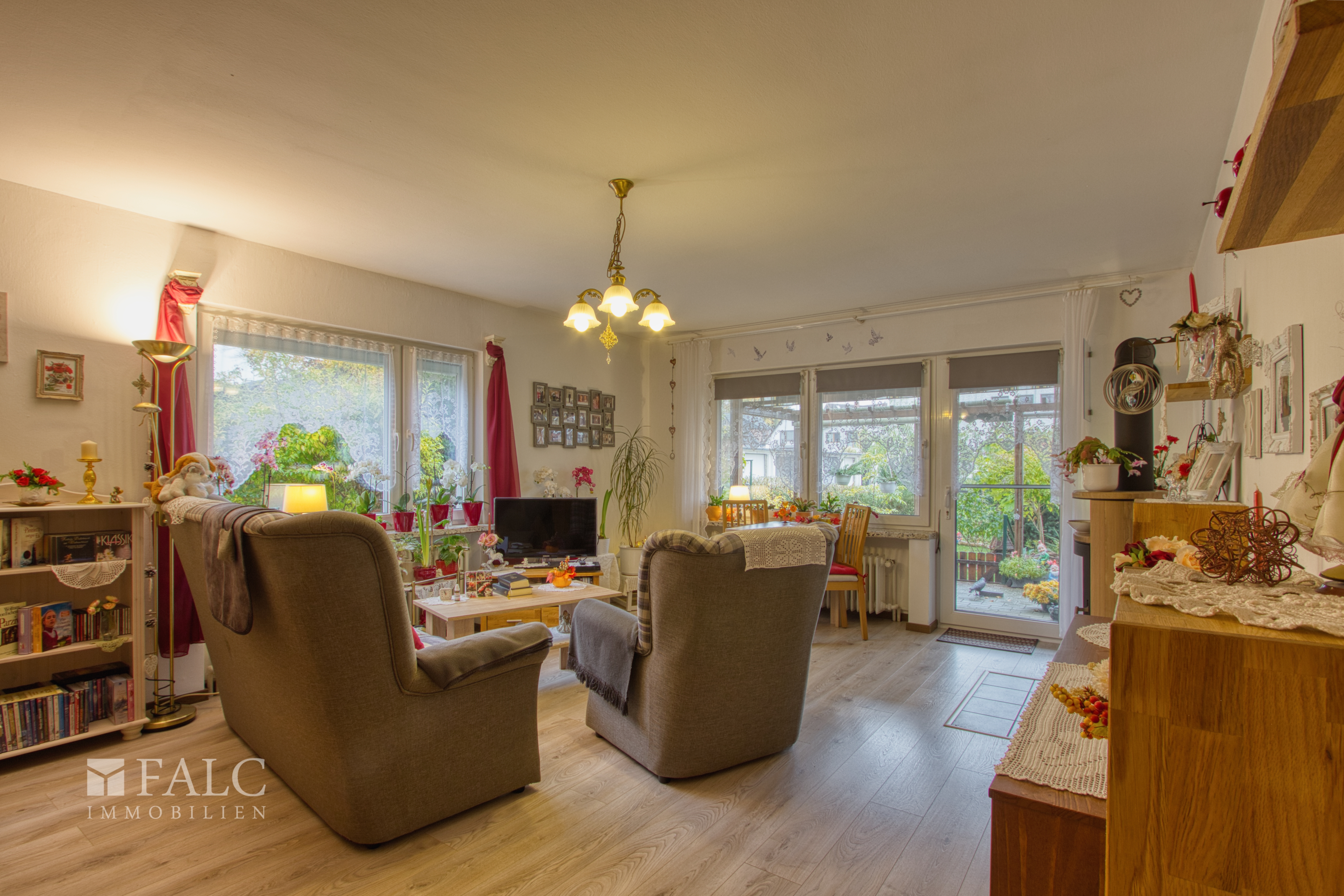 Im Erdgeschoss befinden sich drei Zimmer, eine Küche, ein Bad sowie ein großzügiges Gäste-WC. Die teilweise überdachte Terrasse mit Blick in den Garten lädt zum Verweilen ein.