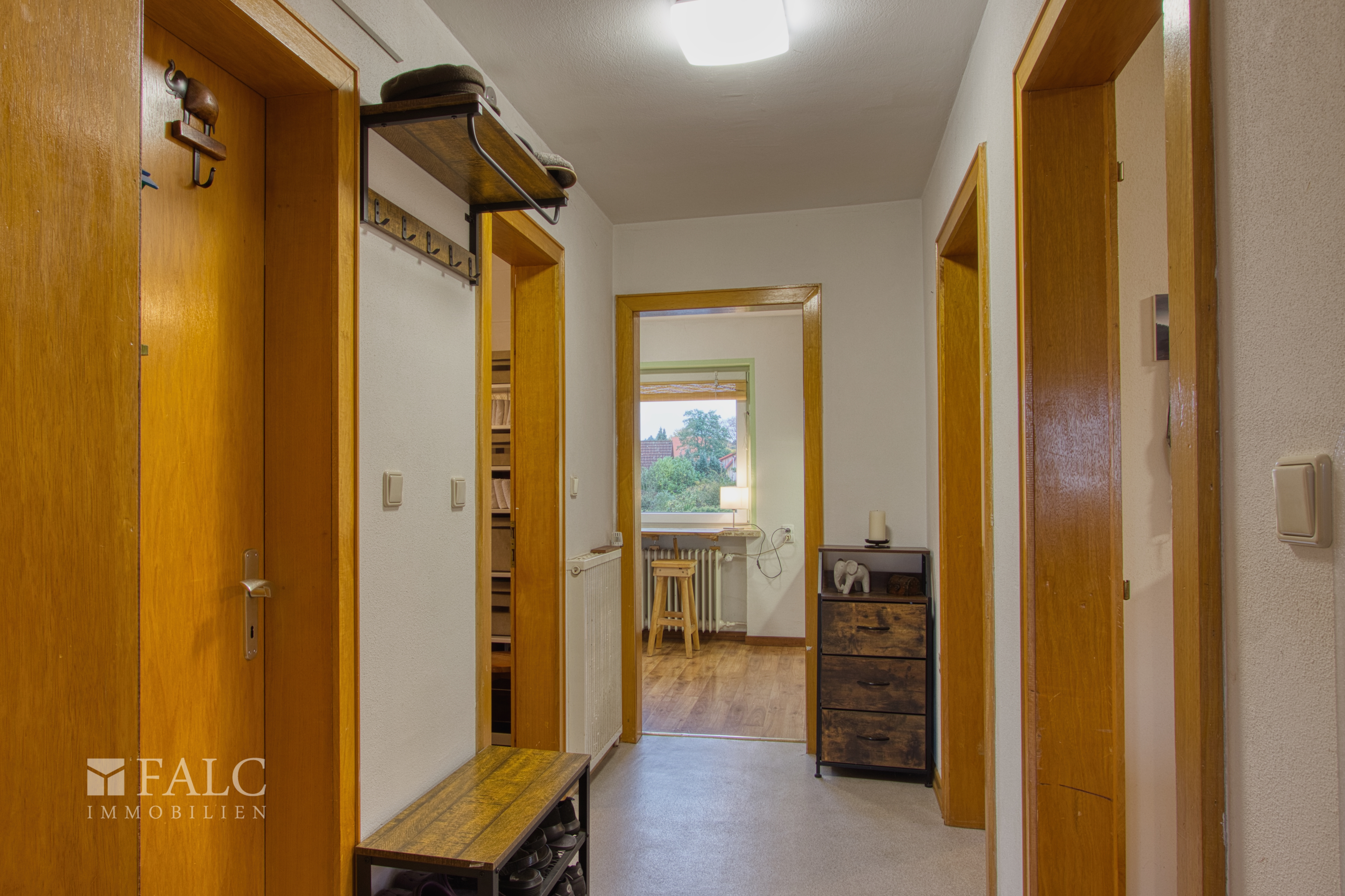 Nach Betreten des Hauses gelangen Sie zunächst in einen kleinen Eingangsflur, von dem aus der obere und der untere Wohnbereich über eine Treppe zugänglich sind. Der obere Wohnbereich eignet sich ideal für größere Kinder, die ihren eigenen Rückzugsort haben möchten – oder auch für Großeltern, die hier ein Zuhause ganz nah bei Kindern und Enkeln finden.