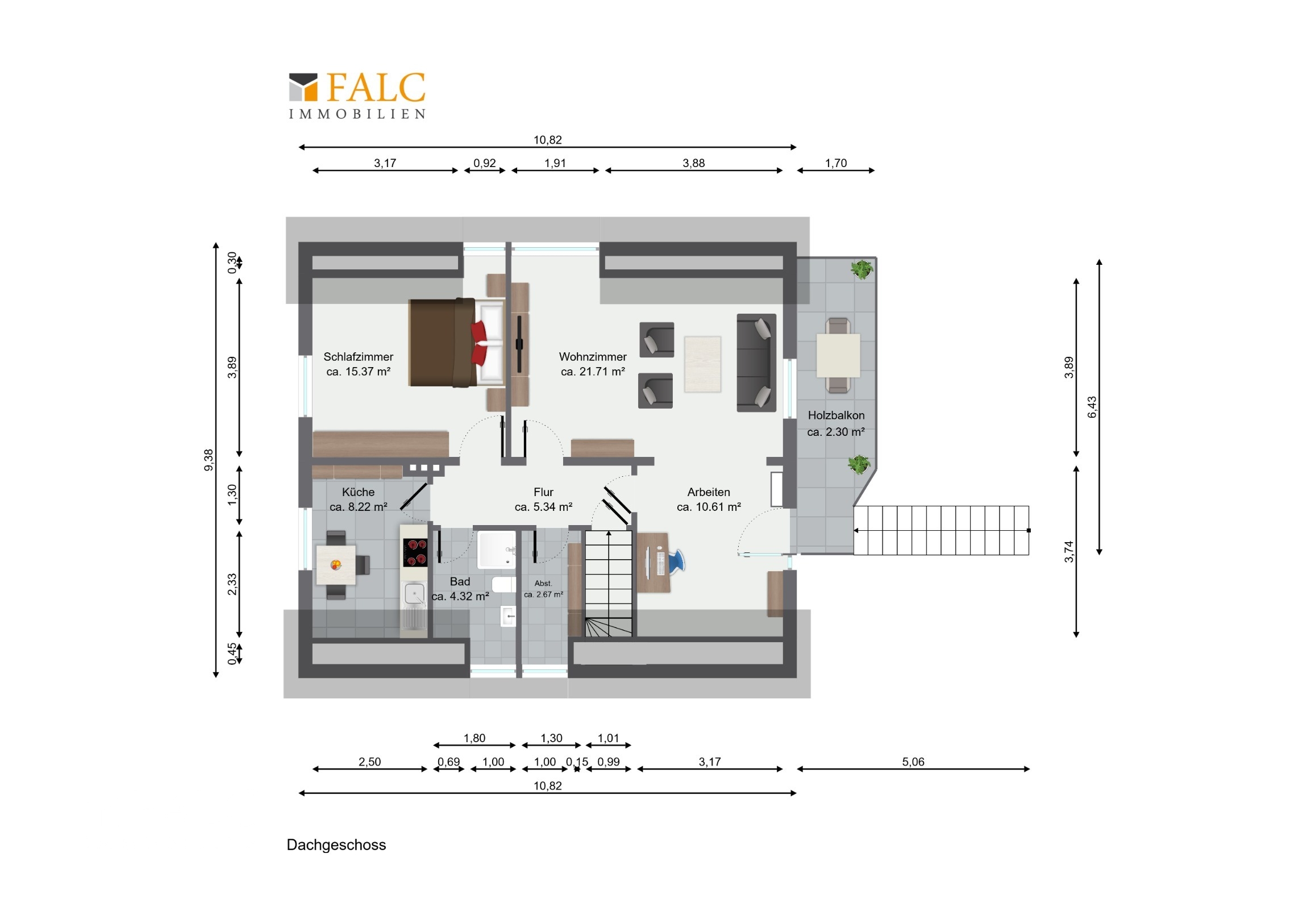 Der obere Wohnbereich ist zusätzlich über eine in Stahlbauweise errichtete Außentreppe erreichbar, die oben in eine balkonähnliche Plattform übergeht – ideal, um den Blick in den Garten zu genießen. Über den separaten Eingang betreten Sie einen offenen Wohnbereich, an den sich ein Flur anschließt. Von hier aus gelangen Sie in Küche, Bad und Schlafzimmer. Eine Ausziehtreppe führt auf den Dachboden, der reichlich Stauraum bietet und bei Wunsch weiteres Ausbaupotenzial bereithält.