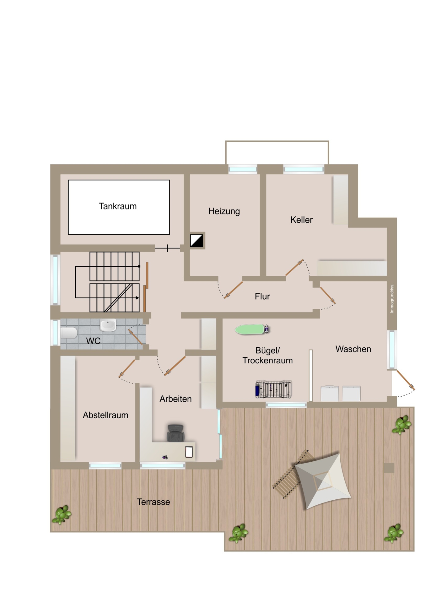 Besonders interessant ist das zusätzliche Ausbaupotenzial im Untergeschoss: Die derzeit als Kellerräume genutzten Flächen bieten – vorbehaltlich baurechtlicher Genehmigung und technischer Umsetzbarkeit – die Möglichkeit, eine Einliegerwohnung auszubauen. Dies eröffnet attraktive Perspektiven, beispielsweise für Mehrgenerationenwohnen, Gäste, ein Homeoffice-Konzept oder zur späteren teilweisen Vermietung.