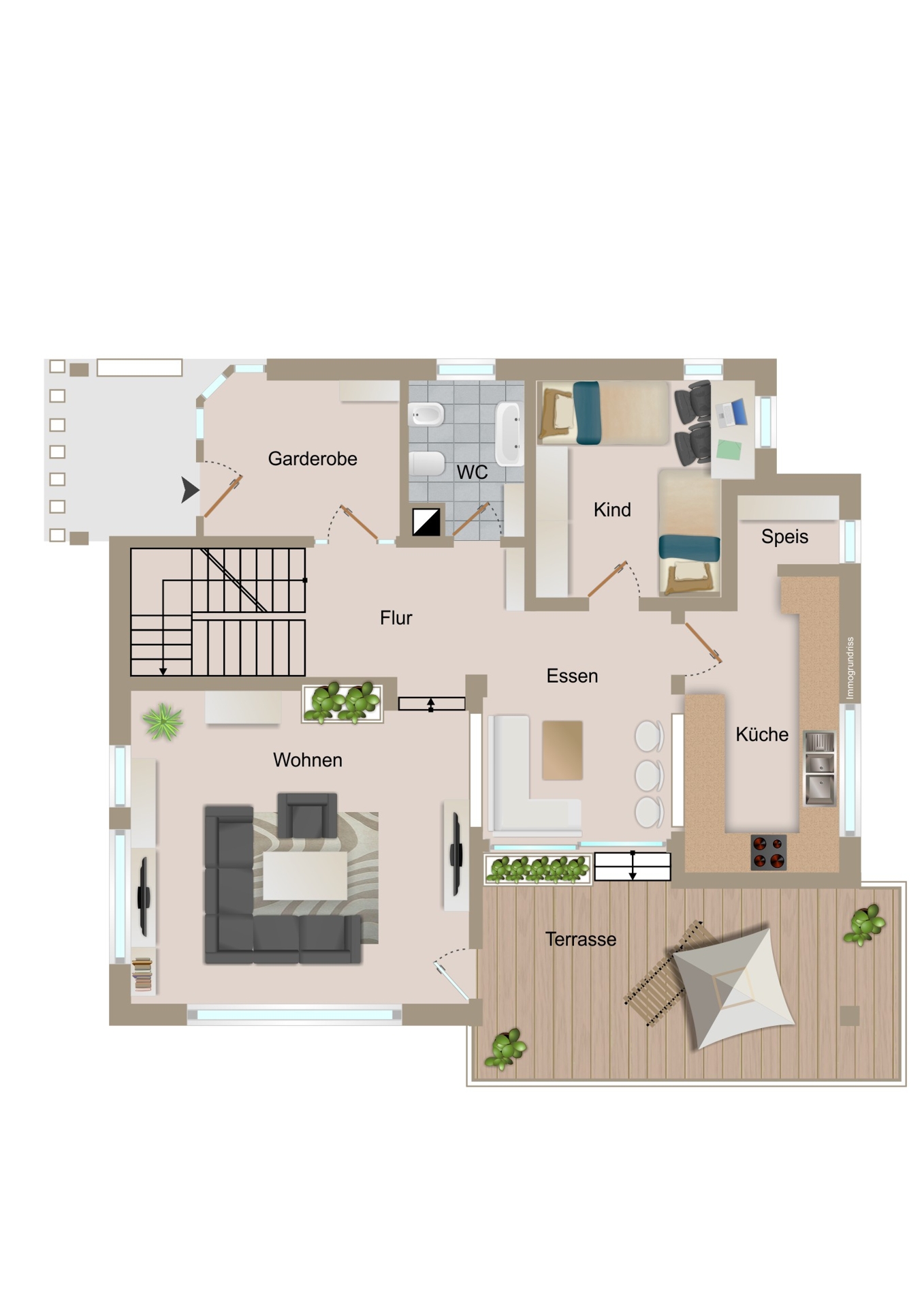 Im Erdgeschoss erwartet Sie ein großzügiger Eingangsbereich, der direkt einen einladenden ersten Eindruck vermittelt. Herzstück dieser Etage ist das große Wohnzimmer mit offenem, hellem Essbereich und einer hochwertigen Einbauküche. Von hier aus gelangen Sie direkt auf die Terrasse mit schönem Ausblick – ein idealer Ort für gemeinsame Stunden mit Familie und Freunden. Ergänzt wird das Erdgeschoss durch ein Badezimmer sowie ein weiteres Zimmer, das sich hervorragend als Büro, Gästezimmer oder Hobbyraum eignet.