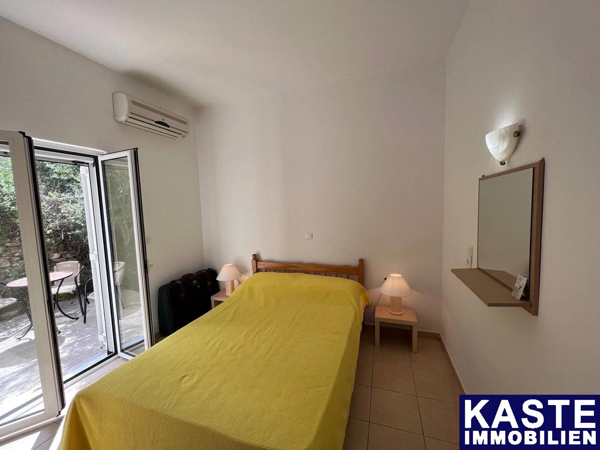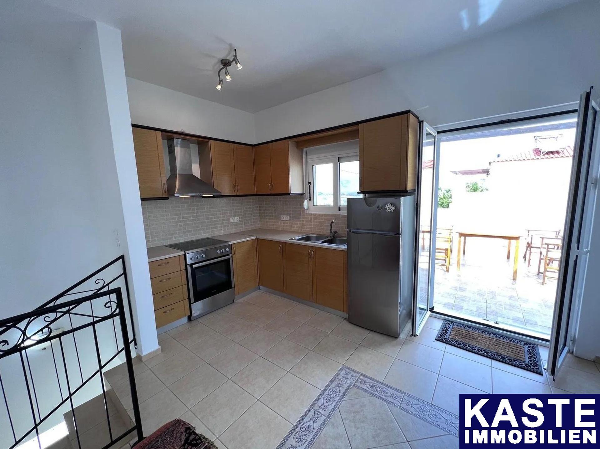 Die Innentreppe führt in den ersten Stock, wo eine offene Wohnküche den Raum einnimmt. Dieser Stock verfügt zudem über einen großzügigen Balkon mit einem atemberaubenden Ausblick auf die Berge und das Meer. Draußen bietet das Anwesen einen Gartenbereich sowie Parkmöglichkeiten.
