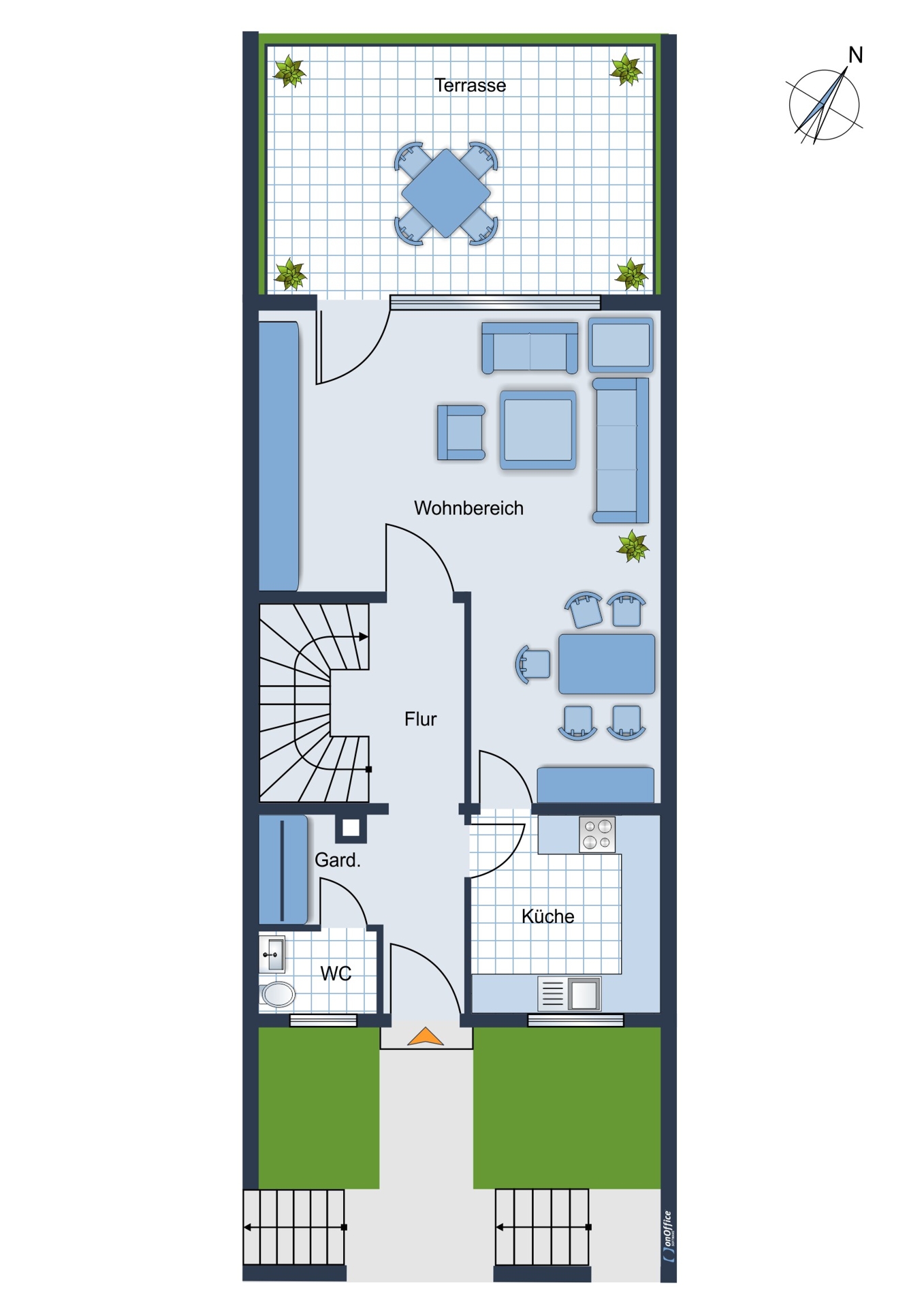Im Erdgeschoss befindet sich der Eingangsbereich, die Küche mit anschließendem Essplatz, ein Gäste WC, die Garderobe und das helle und großzügige Wohnzimmer mit Zugang auf die große Terrasse.