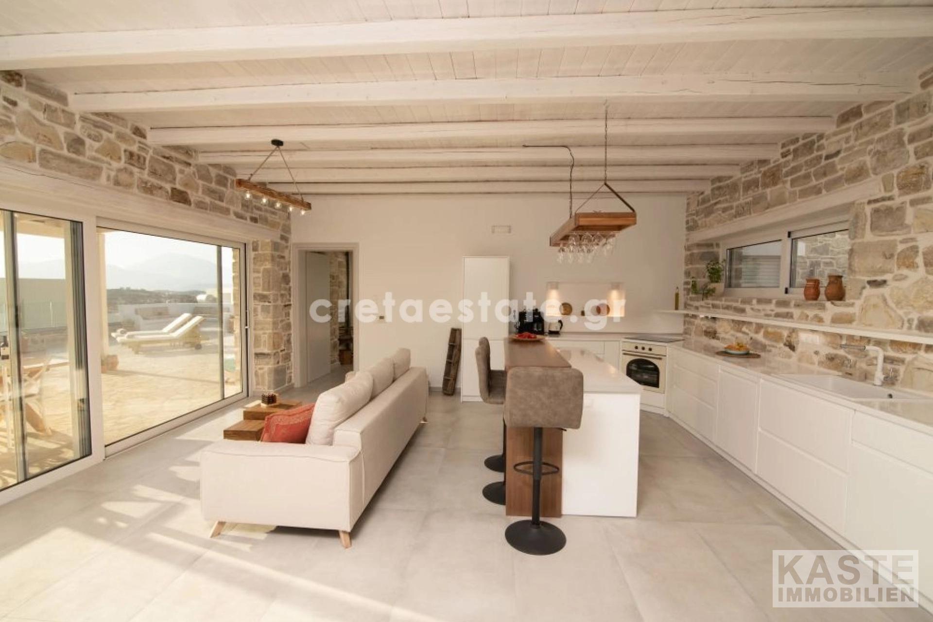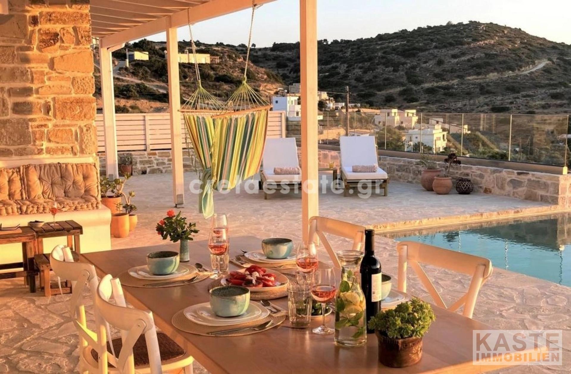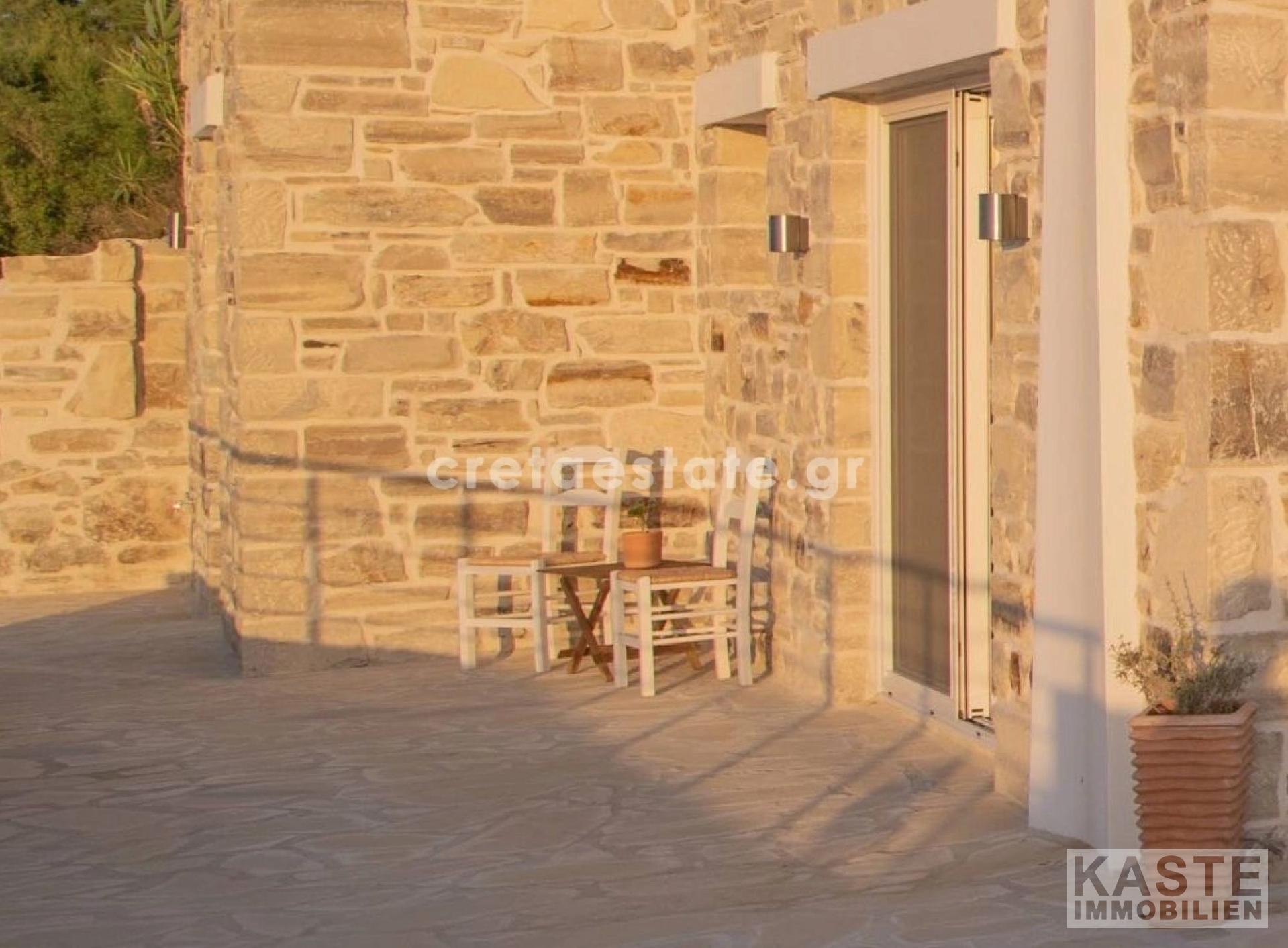 Der weitläufige Außenbereich beherbergt einen Swimmingpool sowie eine gemütliche Sitzecke im großzügigen Innenhof, die zum Verweilen und Entspannen einlädt. Hier genießen Sie unvergessliche Sonnenuntergänge mit Blick auf die imposanten Paximadia-Inseln. Der schön angelegte Garten umfasst Olivenbäume und aromatische Kräuter und ist mit einem automatischen Bewässerungssystem ausgestattet, das die Pflege intensiv vereinfacht.