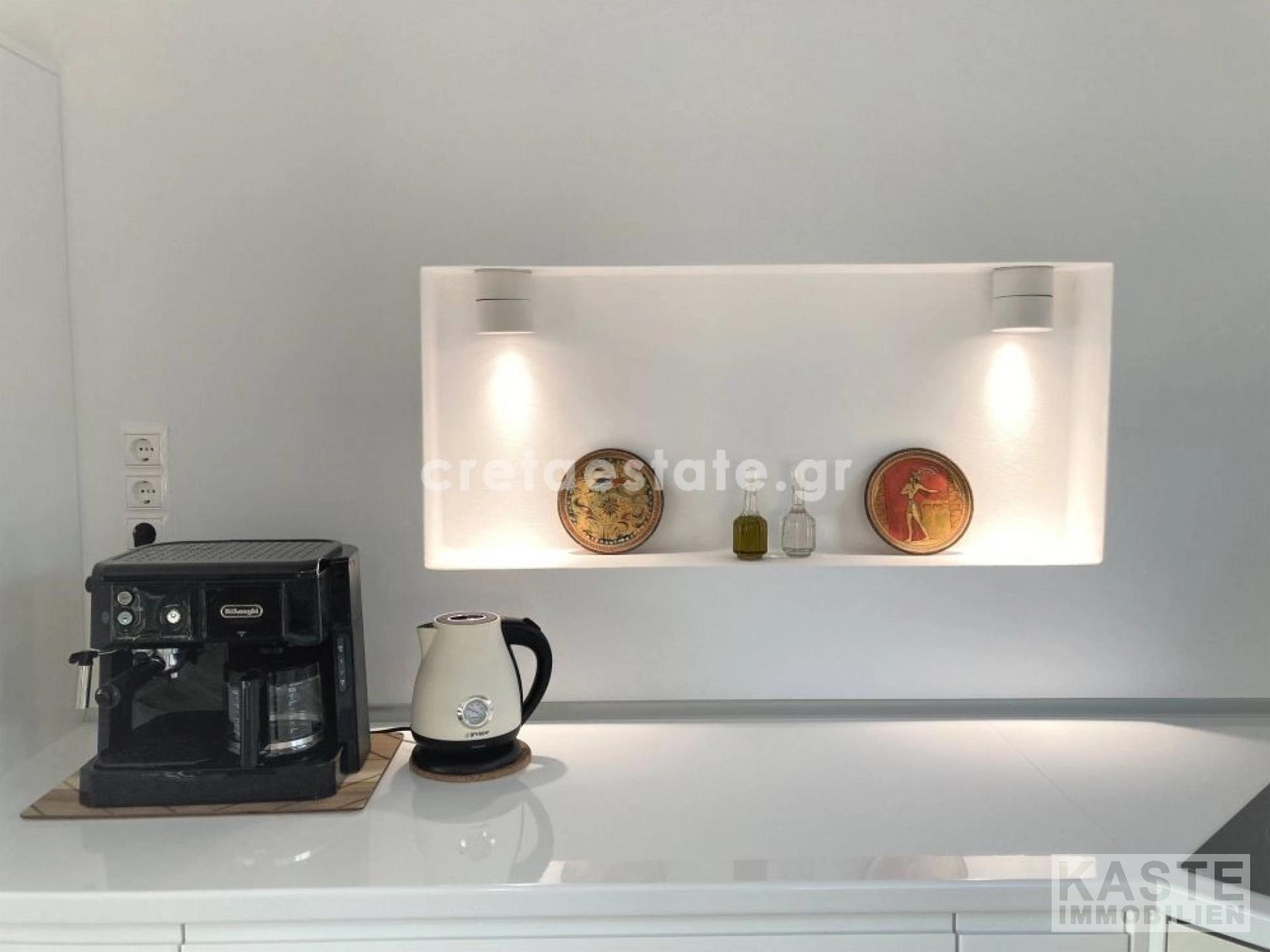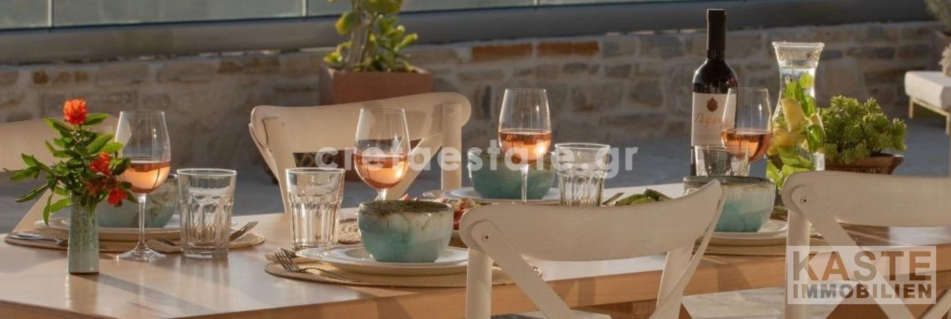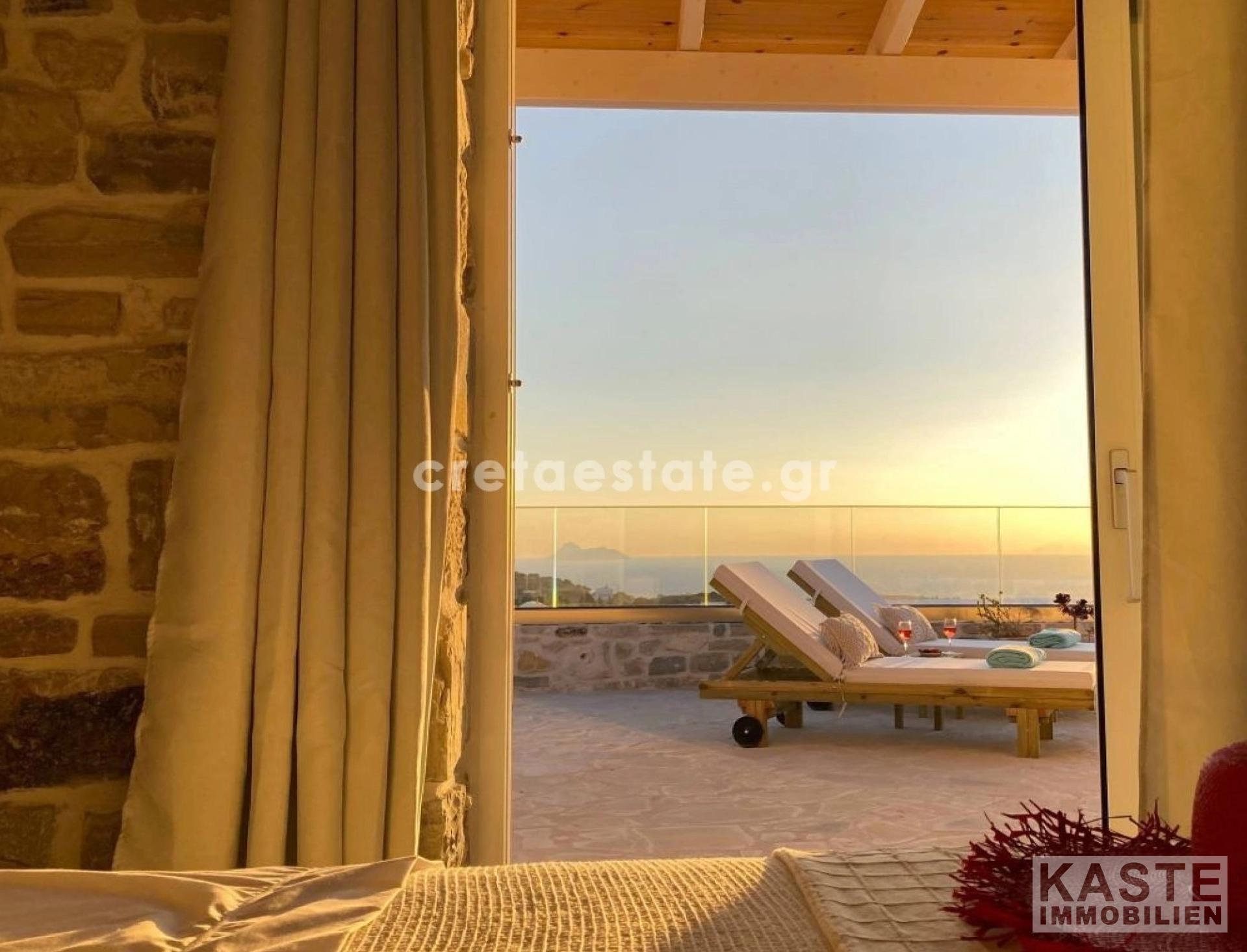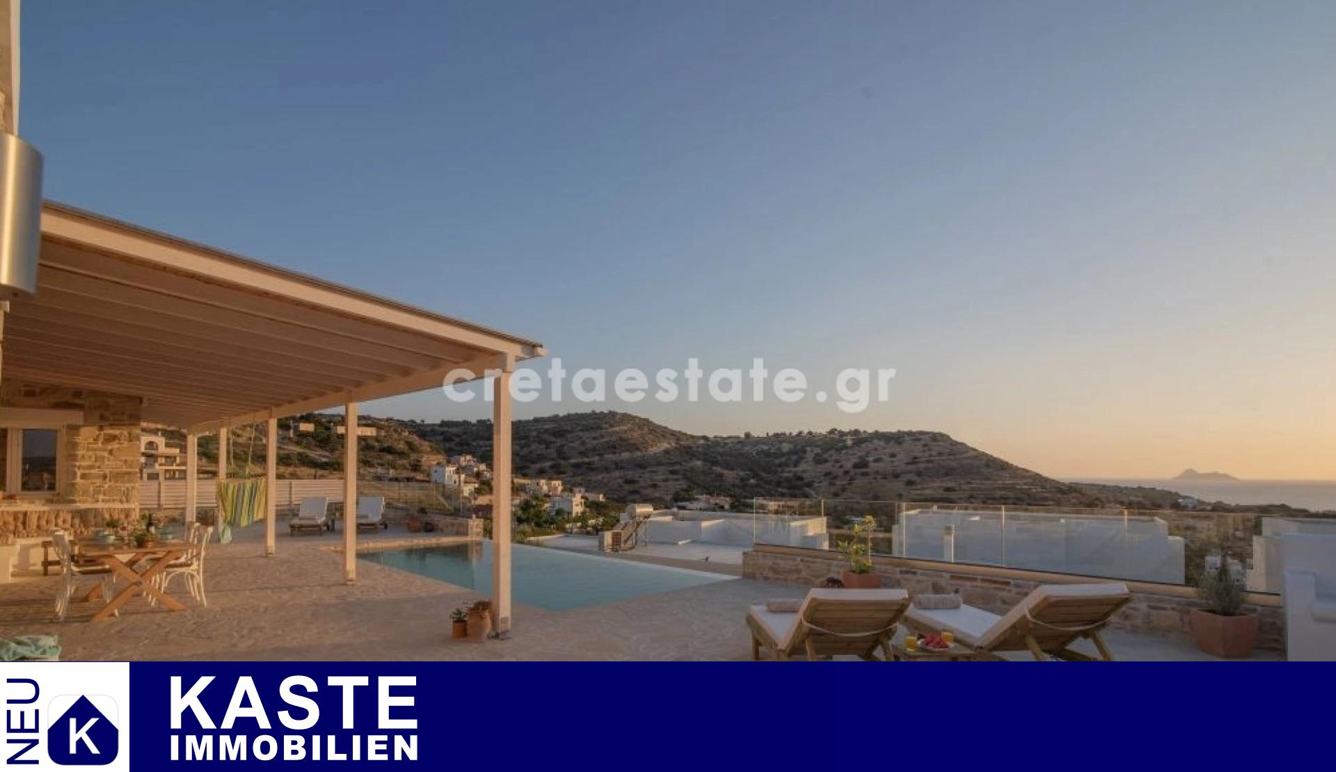 Der weitläufige Außenbereich beherbergt einen Swimmingpool sowie eine gemütliche Sitzecke im großzügigen Innenhof, die zum Verweilen und Entspannen einlädt. Hier genießen Sie unvergessliche Sonnenuntergänge mit Blick auf die imposanten Paximadia-Inseln. Der schön angelegte Garten umfasst Olivenbäume und aromatische Kräuter und ist mit einem automatischen Bewässerungssystem ausgestattet, das die Pflege intensiv vereinfacht.