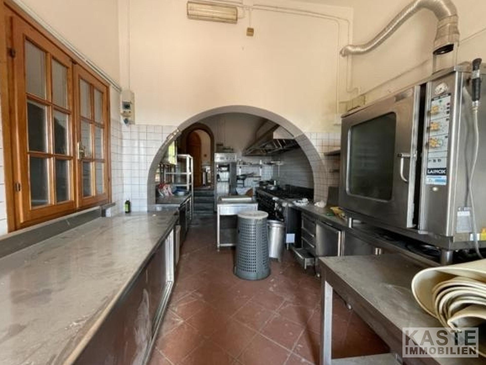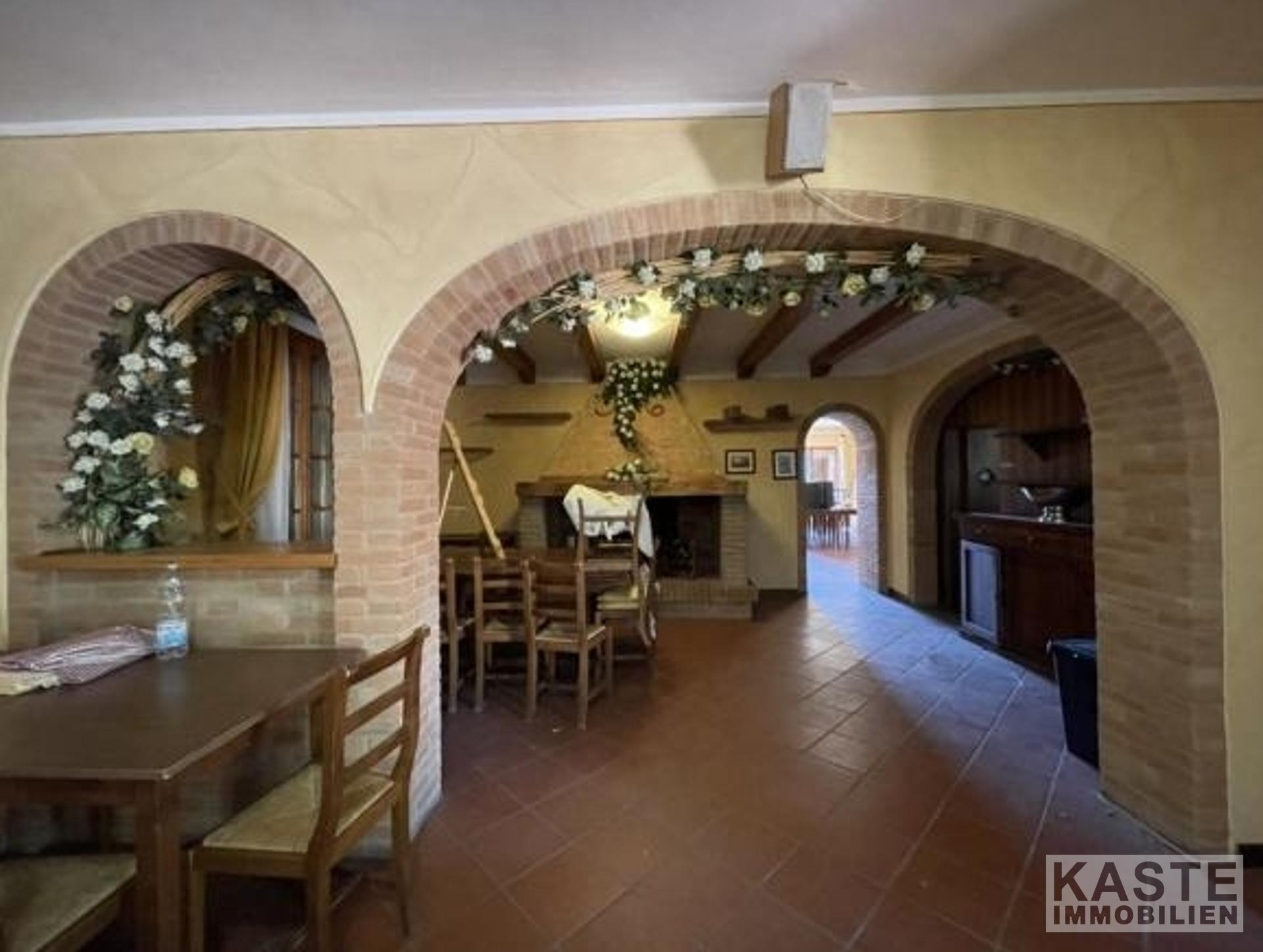 Im Erdgeschoss befindet sich ein renommiertes Restaurant mit einer geräumigen Profiküche und einem eindrucksvollen Kamin, der eine einladende Atmosphäre schafft. Ergänzt wird das gastronomische Angebot durch einen traditionellen Pizzaofen sowie zwei weitläufige Terrassen, die einen atemberaubenden Panoramablick auf das Tal und die sanften toskanischen Hügel bieten.