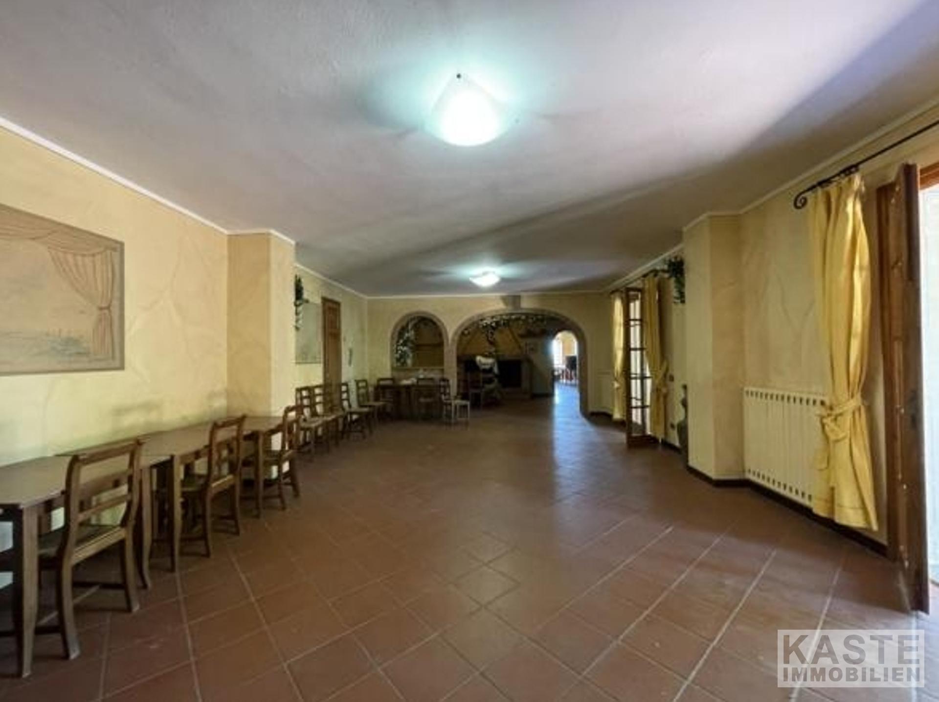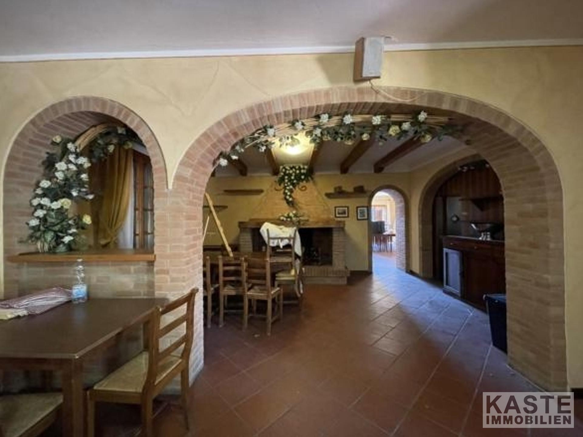Im Erdgeschoss befindet sich ein renommiertes Restaurant mit einer geräumigen Profiküche und einem eindrucksvollen Kamin, der eine einladende Atmosphäre schafft. Ergänzt wird das gastronomische Angebot durch einen traditionellen Pizzaofen sowie zwei weitläufige Terrassen, die einen atemberaubenden Panoramablick auf das Tal und die sanften toskanischen Hügel bieten.