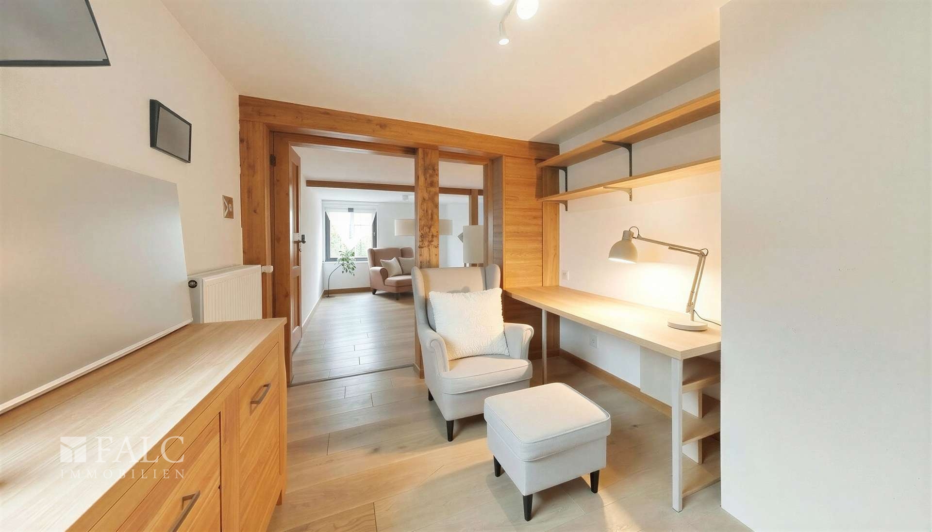 Dieses charmante Ein- bis Zweifamilienhaus besticht durch seinen besonderen Fachwerkcharakter und zahlreiche stilvolle Details, die den rustikalen Charme der Immobilie unterstreichen. In der Hauptwohnung sorgen hochwertige Holzdielen beziehungsweise Parkettböden für eine warme und wohnliche Atmosphäre. Ein Kamin schafft zusätzlich Gemütlichkeit und macht den Wohnbereich besonders einladend.