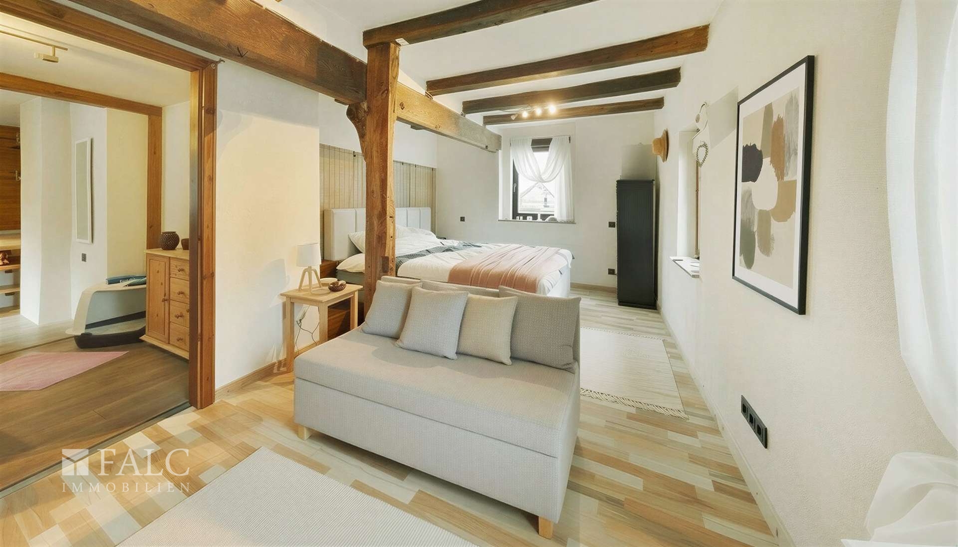 In beiden Wohnungen sorgen die sichtbaren Holzständer und Fachwerkelemente für eine besonders rustikale und charmante Wohnatmosphäre und verleihen der Immobilie ihren unverwechselbaren Stil.