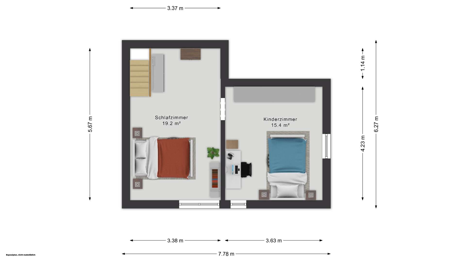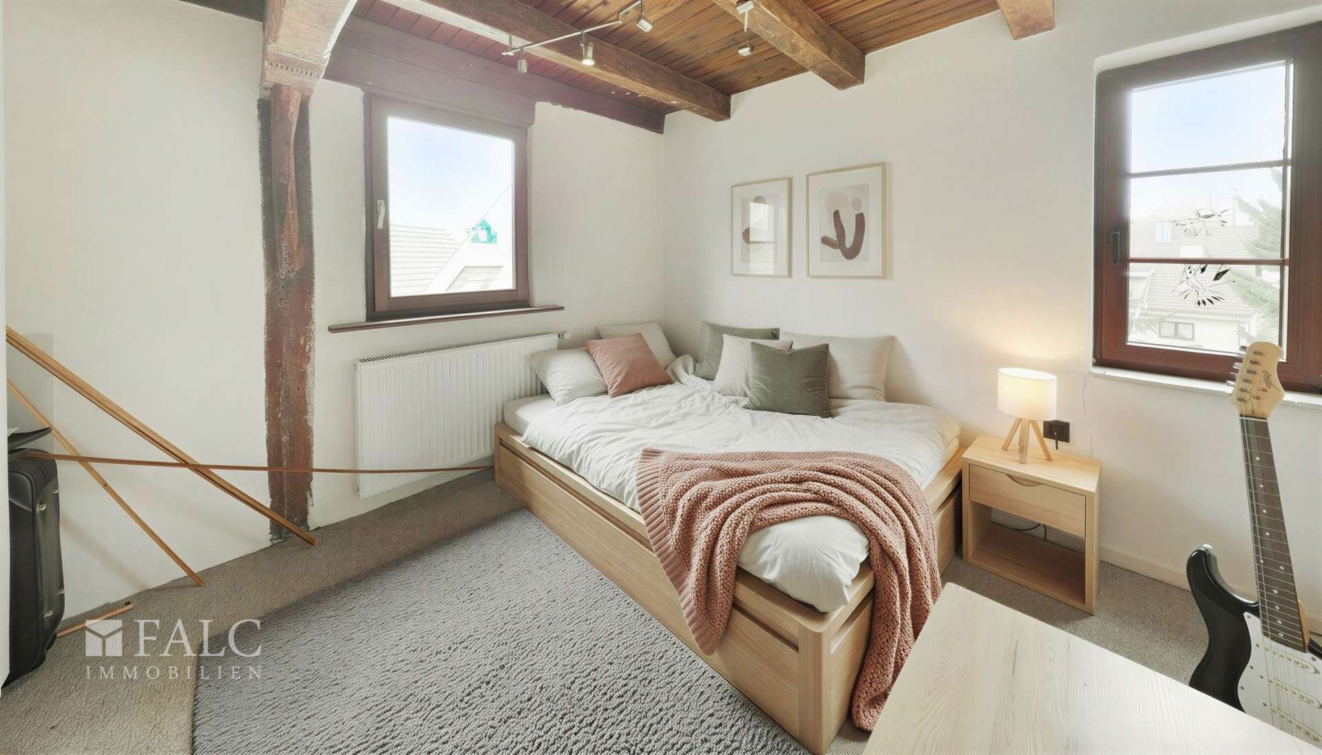 Die zweite Wohnung befindet sich in der ersten Etage und erstreckt sich zusätzlich bis in das Dachgeschoss. Hier stehen ein Schlafzimmer, ein Wohnzimmer, eine Küche, ein separater Essbereich sowie ein Badezimmer zur Verfügung. Auch diese Einheit überzeugt durch eine angenehme Raumaufteilung und vielseitige Nutzungsmöglichkeiten.