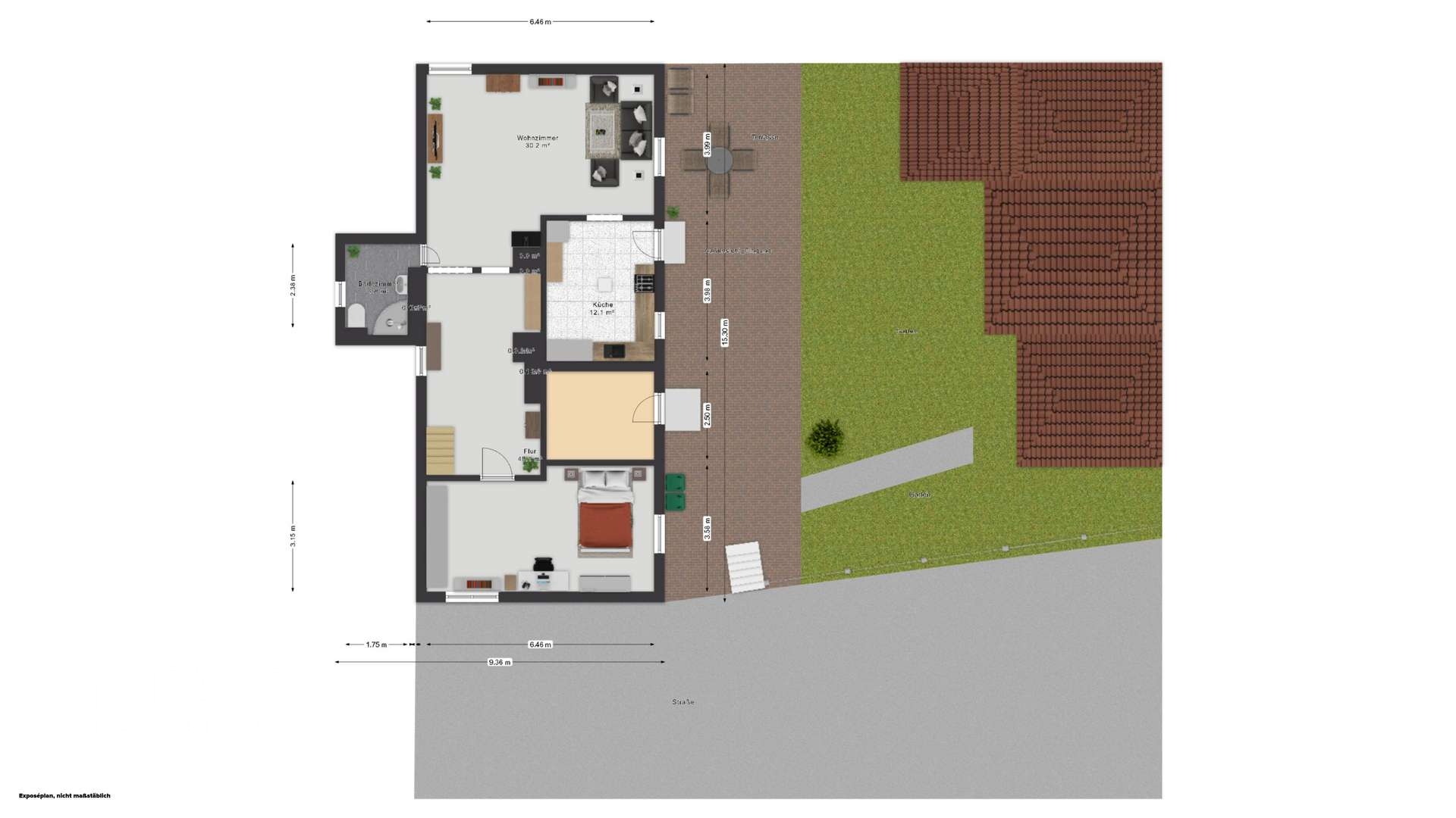 Garten TerrasseKücheWohnzimmerWohnzimmer Badezimmer FlurWohnzimmerSchlafzimmer (KI generiert)Wohnzimmer - (KI generiert)GartenMikrolageMakrolageAußenbereichGrundrissAußenansicht