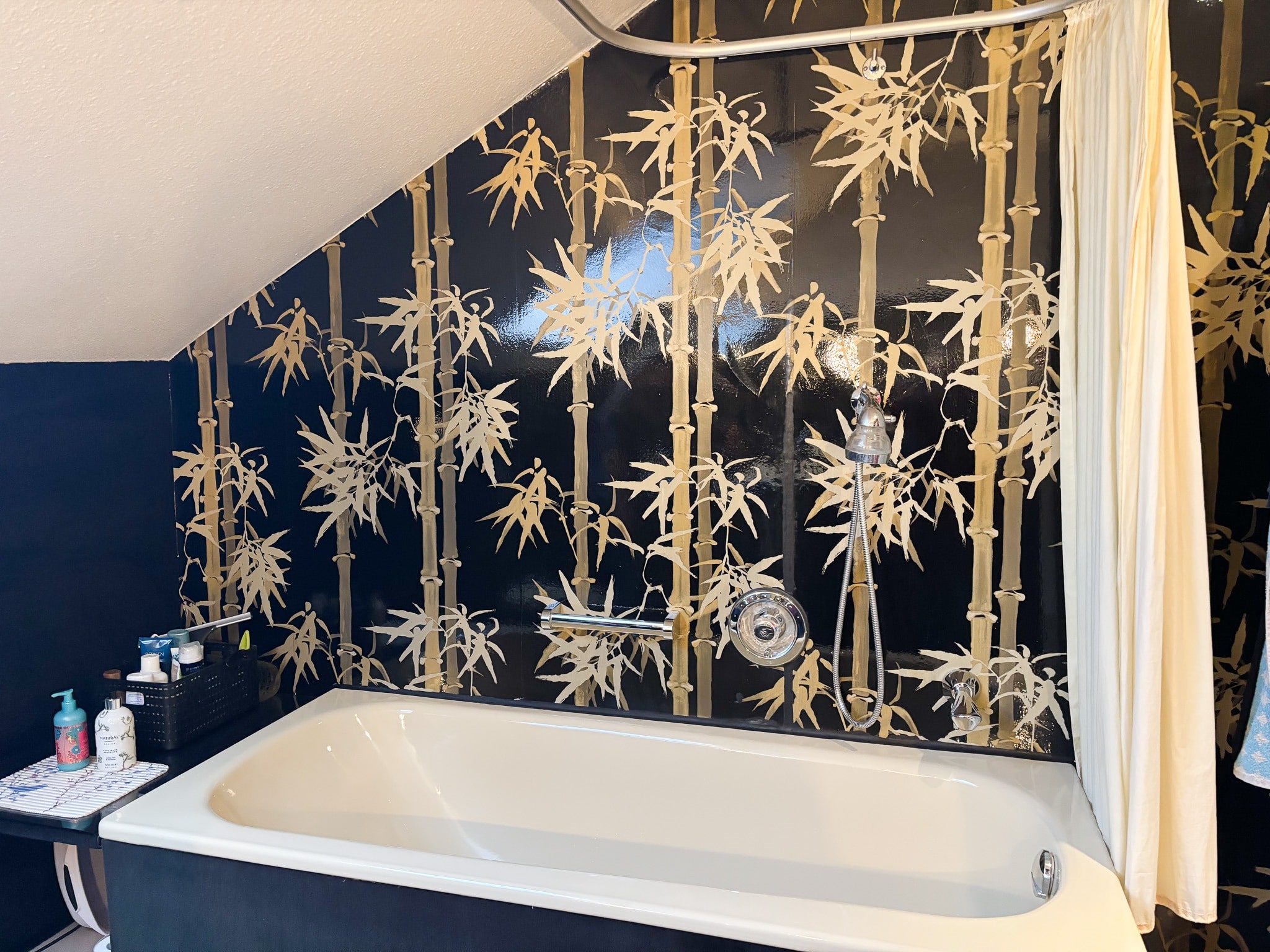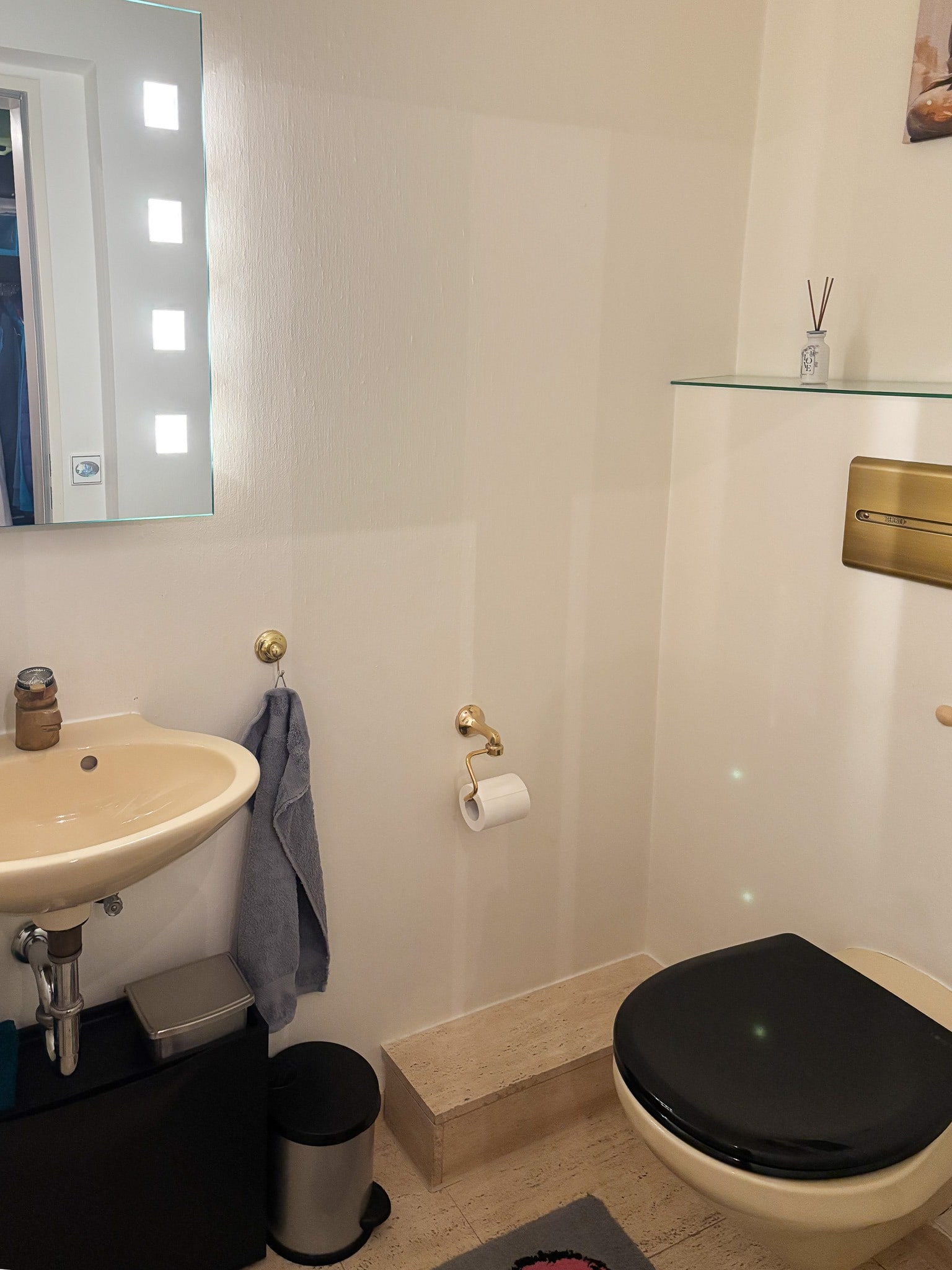 Das großzügige Badezimmer überzeugt mit Dachflächenfenster, zwei Waschbecken, Bidet, WC und Badewanne. Helle Bodenflächen, schwarze Badmöbel mit cremefarbenen Sanitärobjekten sowie eine edle schwarz-goldene Tapete im Wannenbereich verleihen dem Raum eine besondere, stilvolle Note.