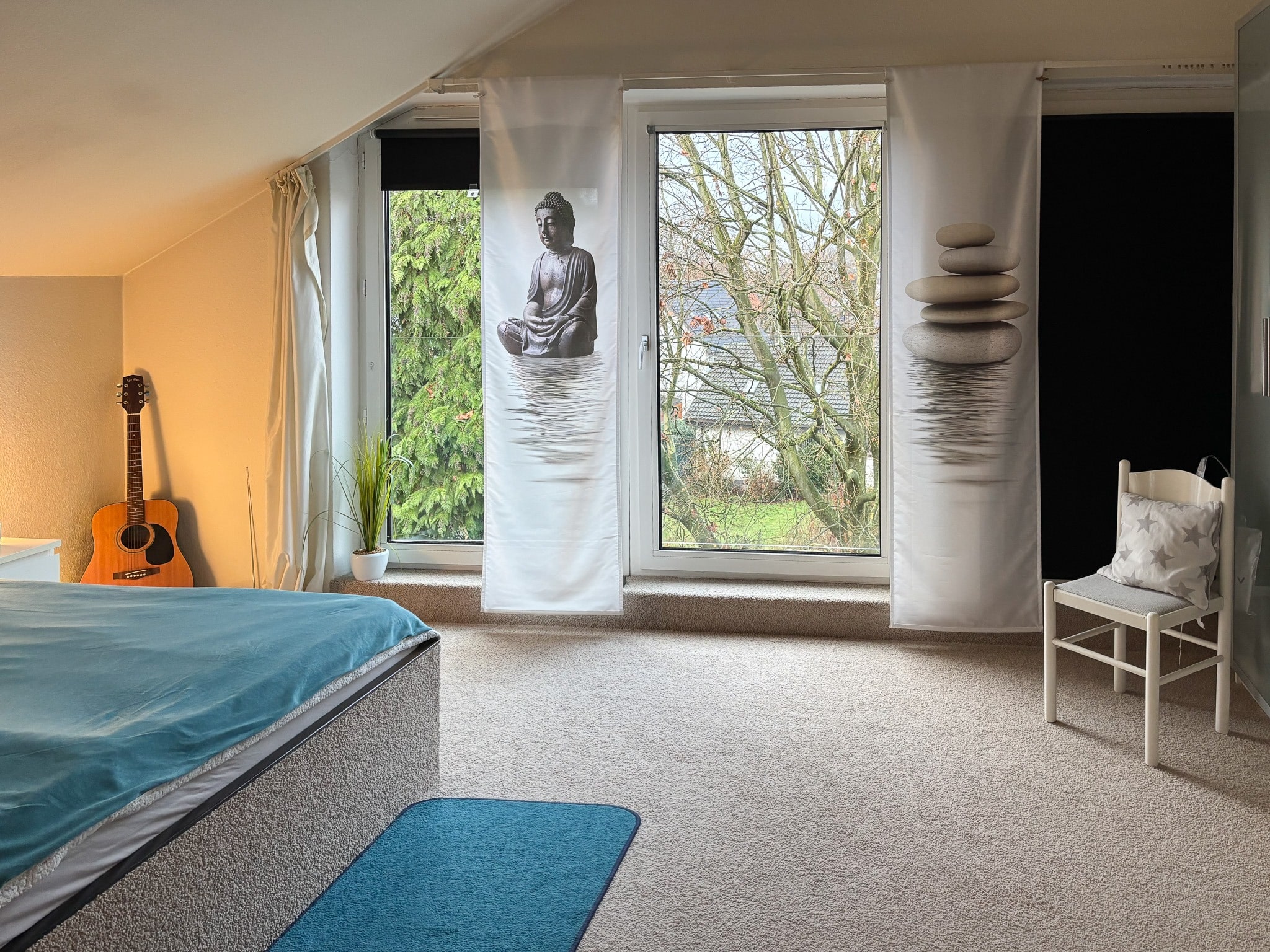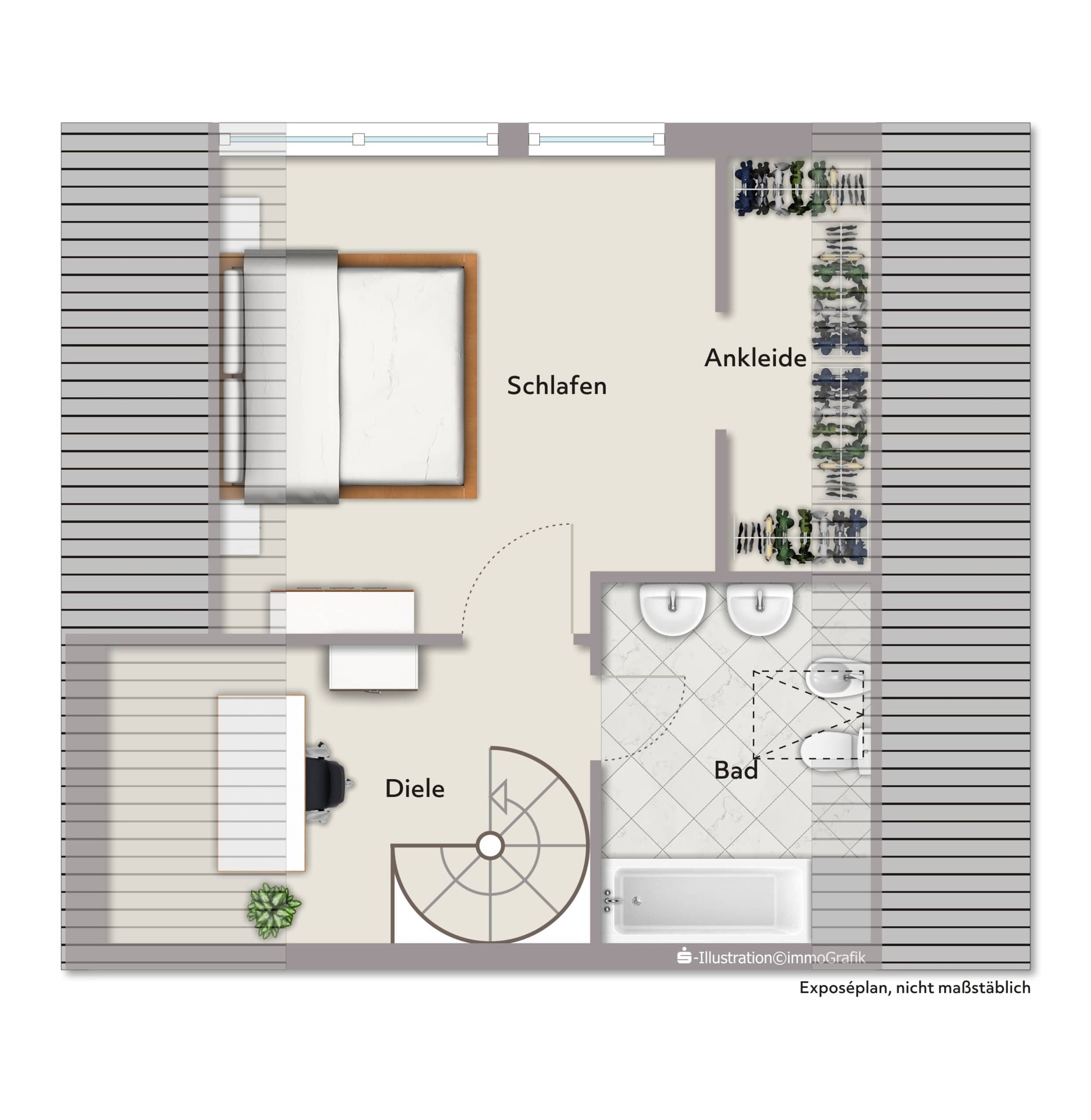 Von hier aus erschließt sich das Schlafzimmer mit Ankleidebereich unter der Schräge sowie bodentiefen Fenstern mit Blick ins Grüne – ruhig, privat und mit überraschend großzügigem Raumgefühl. Unter dem Dach befindet sich ein ansprechendes Schlafzimmer mit Ankleidebereich unter der Schräge sowie bodentiefen Fenstern mit Blick ins Grüne – ruhig und privat.