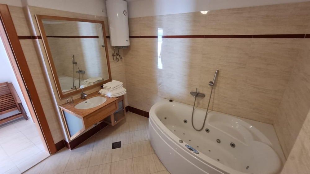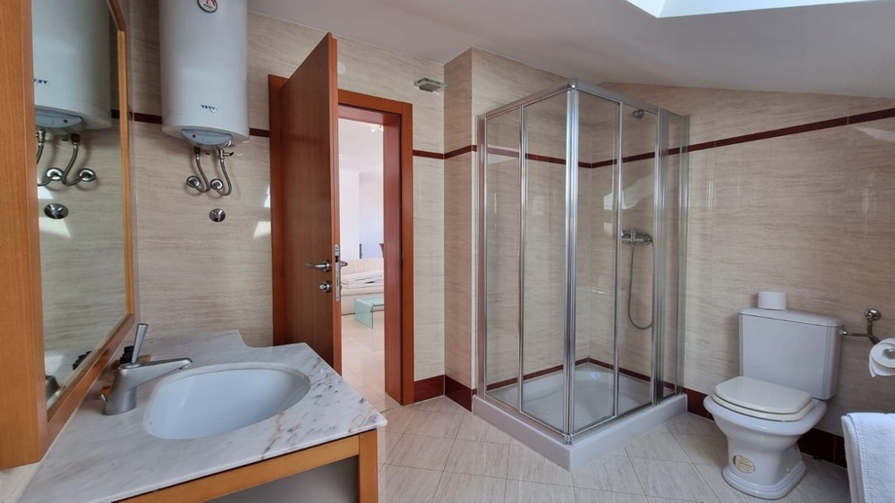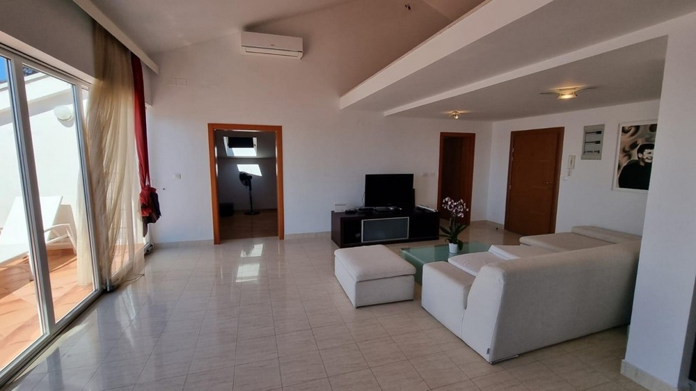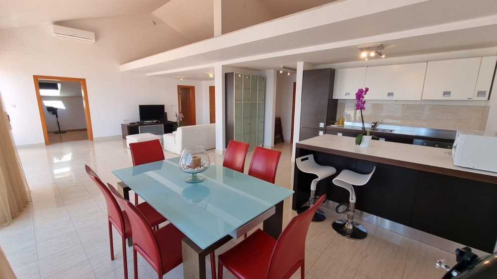 Die Gesamtfläche von ca. 144 m² verteilt sich auf zwei Schlafzimmer, zwei Badezimmer, Wohnzimmer mit Küche und Essbereich sowie eine große Terrasse.