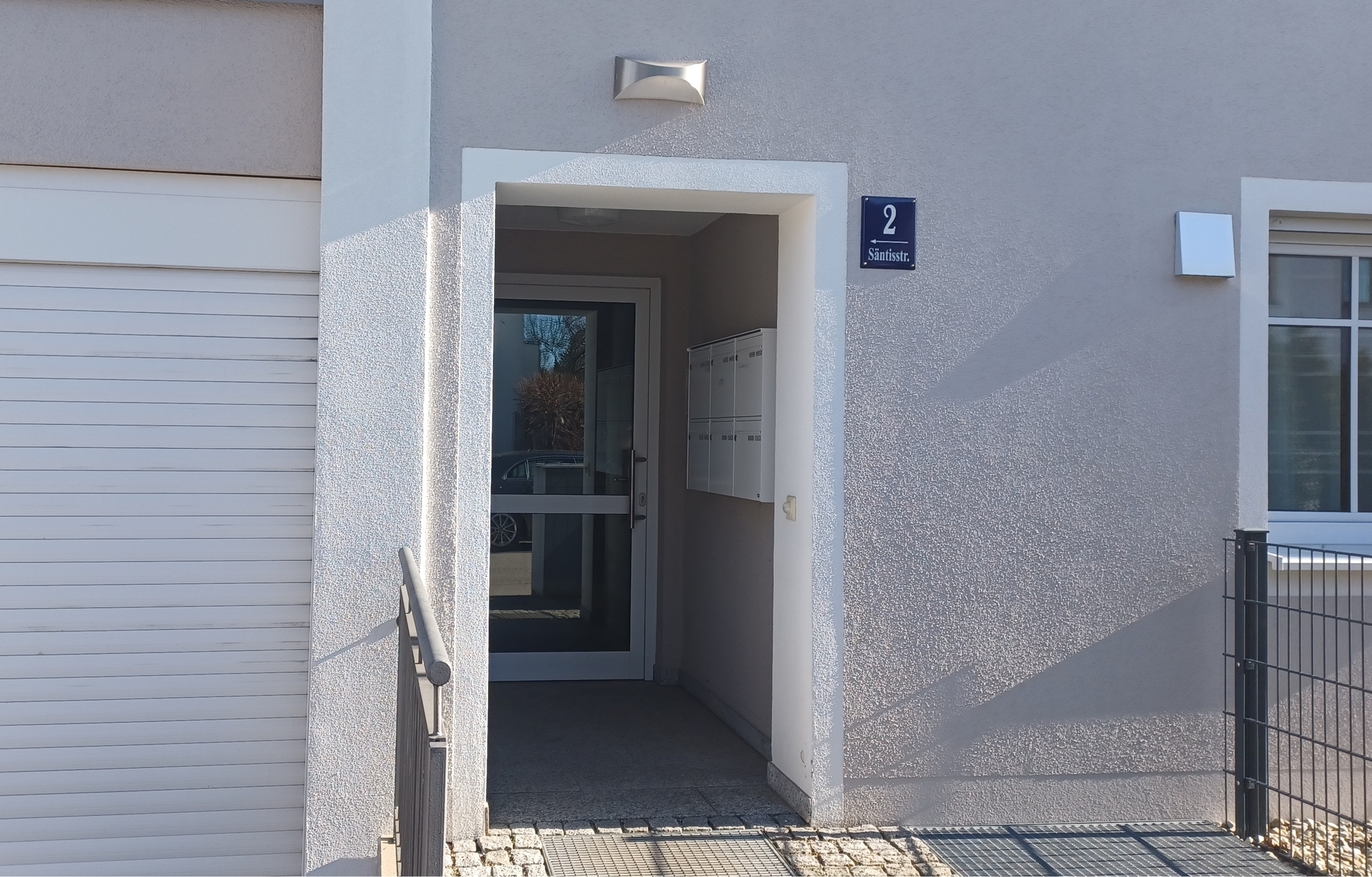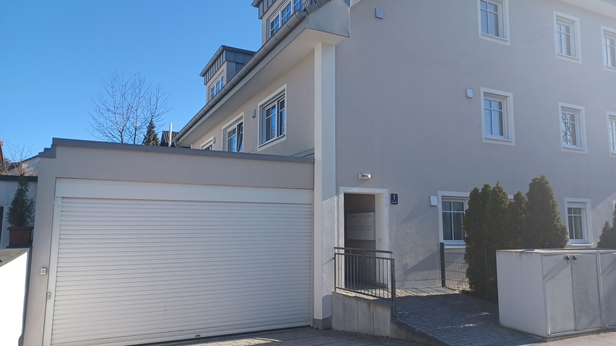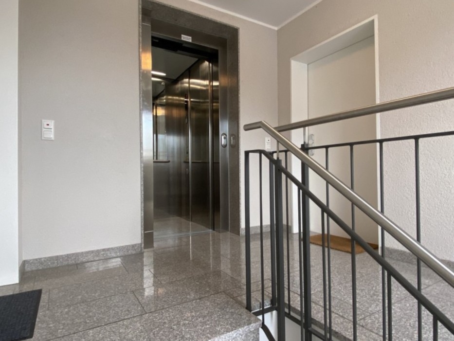 Fluroffene KücheAussenfoto SüdwestHausansicht von SüdenHauseingangGarage und HauseingangDuplex-GarageFahrrad-UnterstandTreppenhaus und AufzugWohn-Zi mit offener KücheSchlafzimmer 1Schlafzimmer 2Badezimmer mit großer DuscheGäste WCGrundrissBlick auf den Balkon